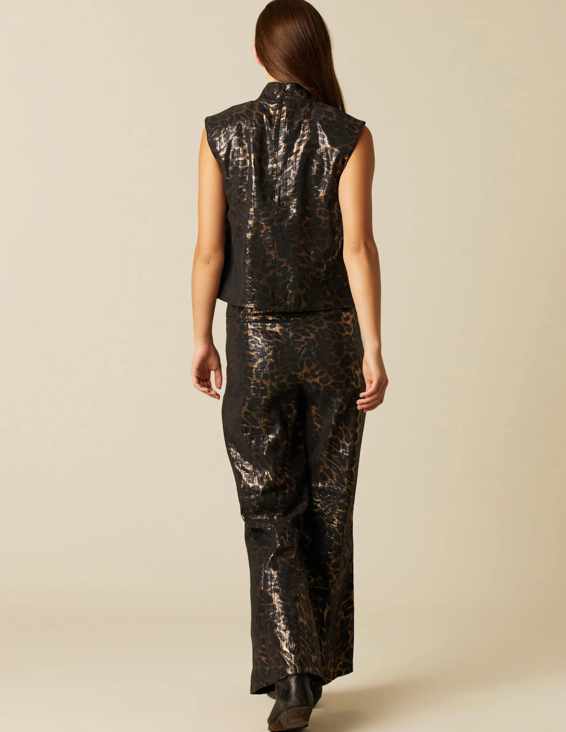 Top de chica estampado. Patrón sin mangas y cuello alto. Cierre con cremallera en la espalda. El tejido presenta brillos.