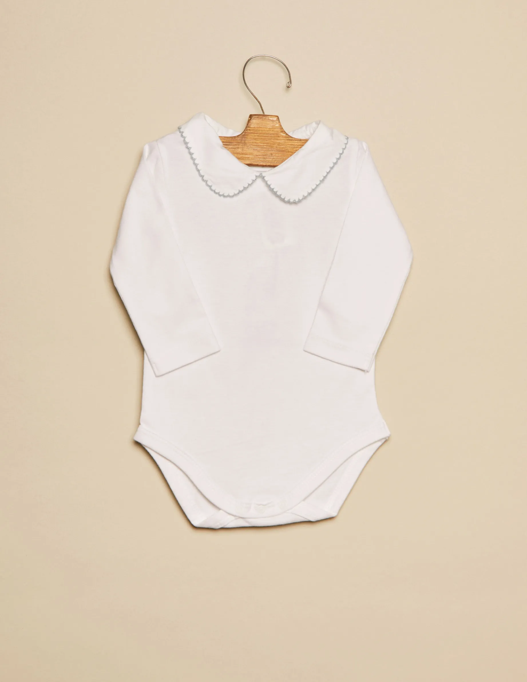 Body algodón cuello bebé blanco. Detalle de pespuntes azules Manga corta y cierres automáticos en bajo.