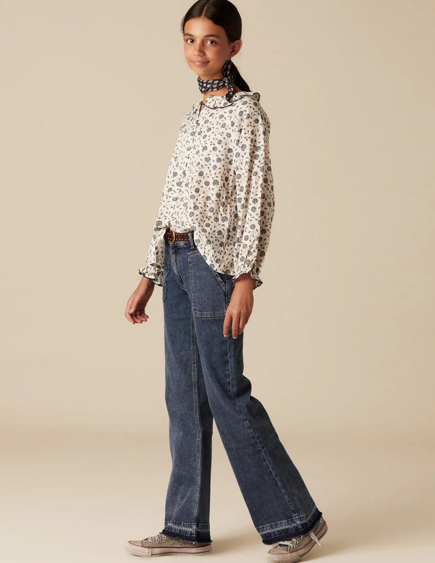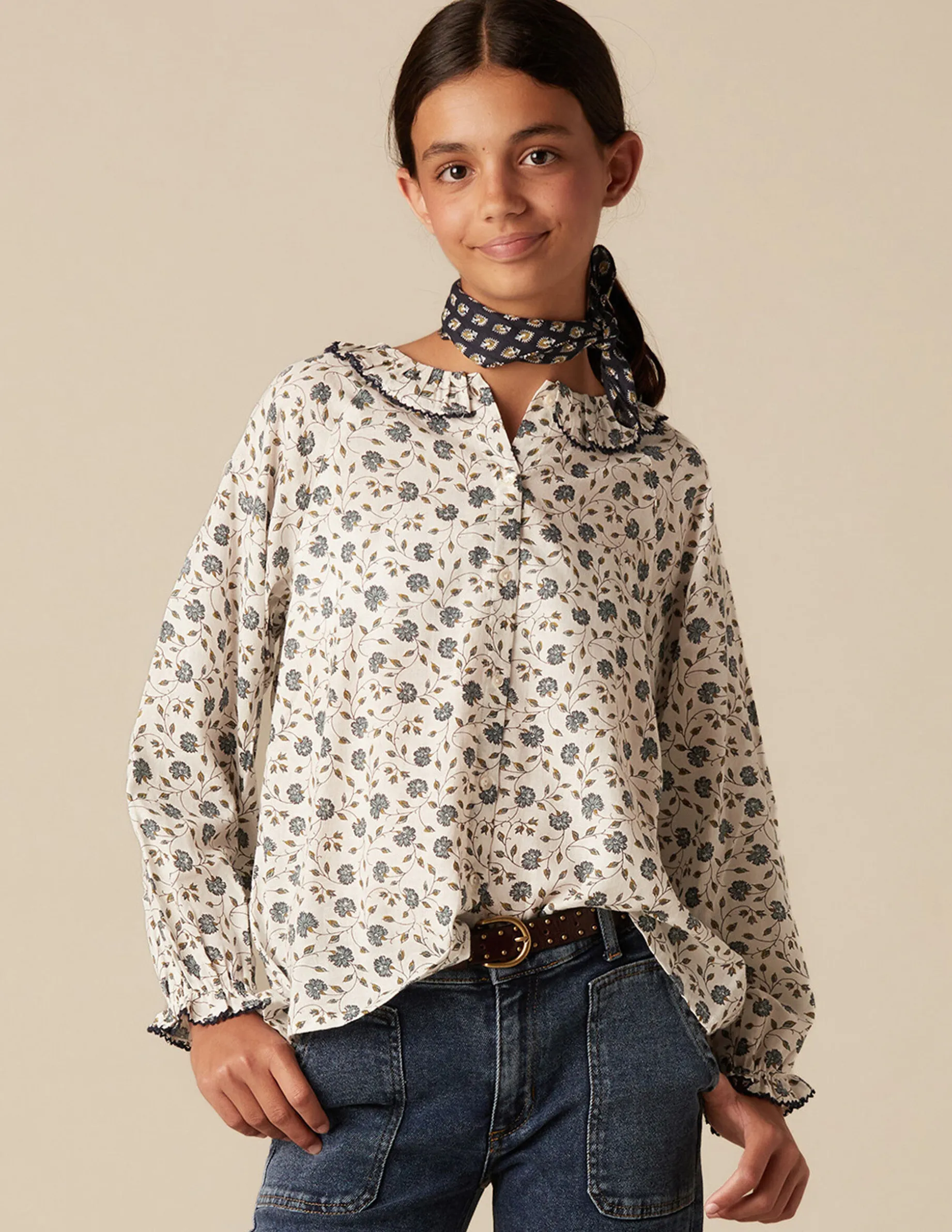 Camisa de teen , en estampado de la colección. Patrón con cuello perkins y cierre por la espalda con botones. Detalle de pespunte a contraste en cuello y mangas.