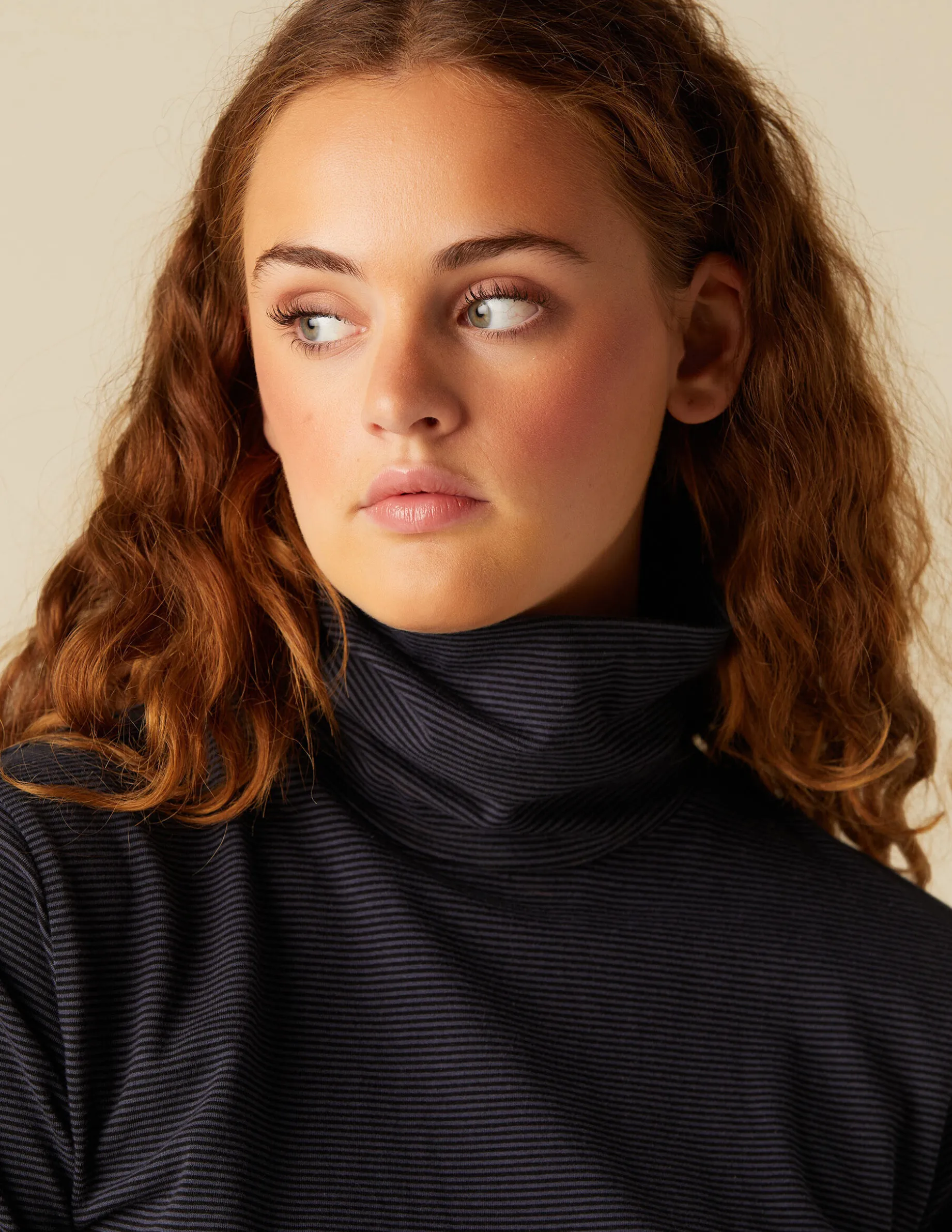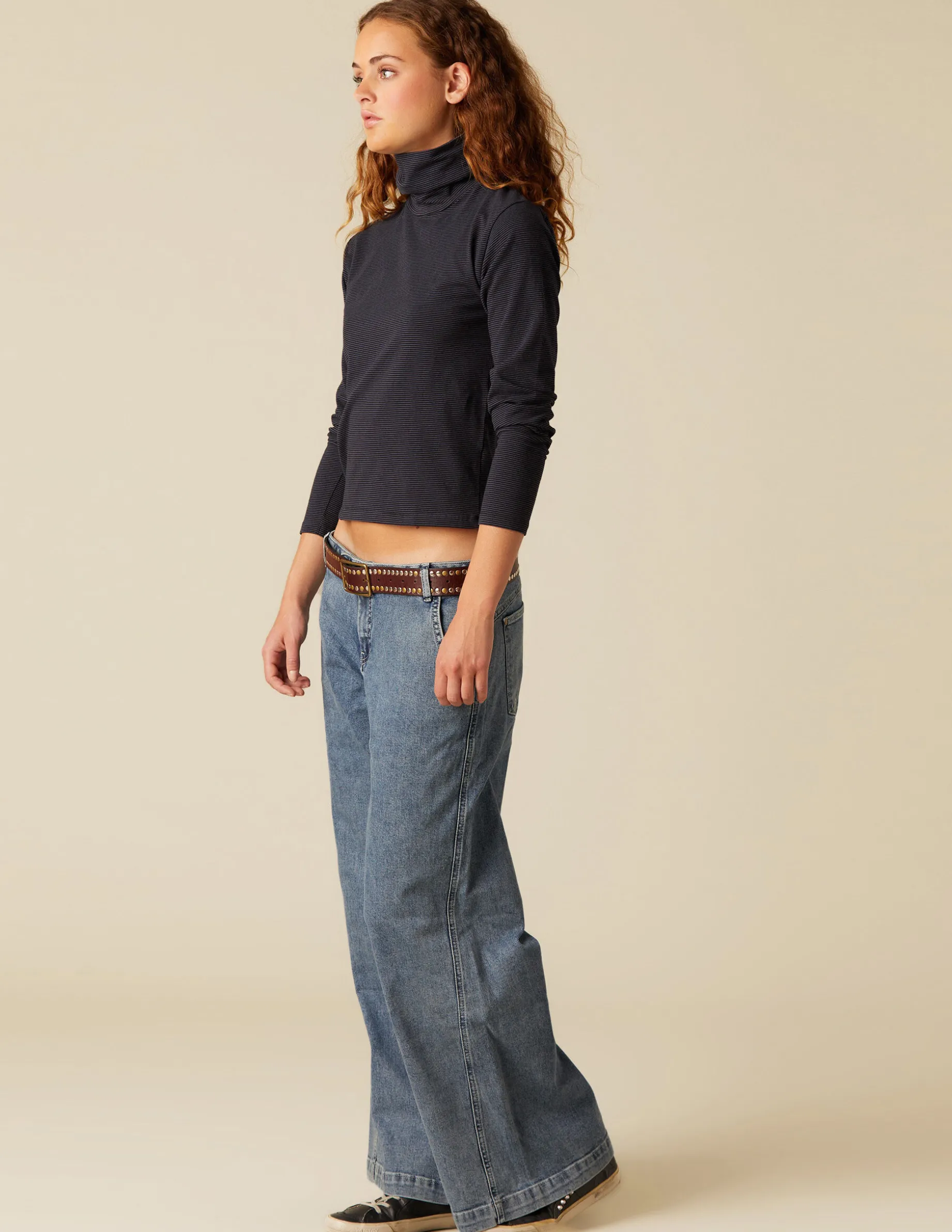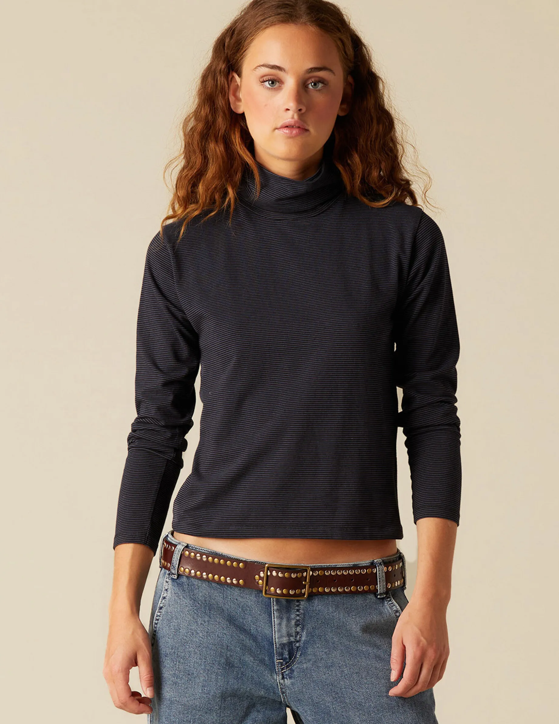 Camiseta benéfica de rayas, de chica. Patrón con cuello vuelto y manga larga.