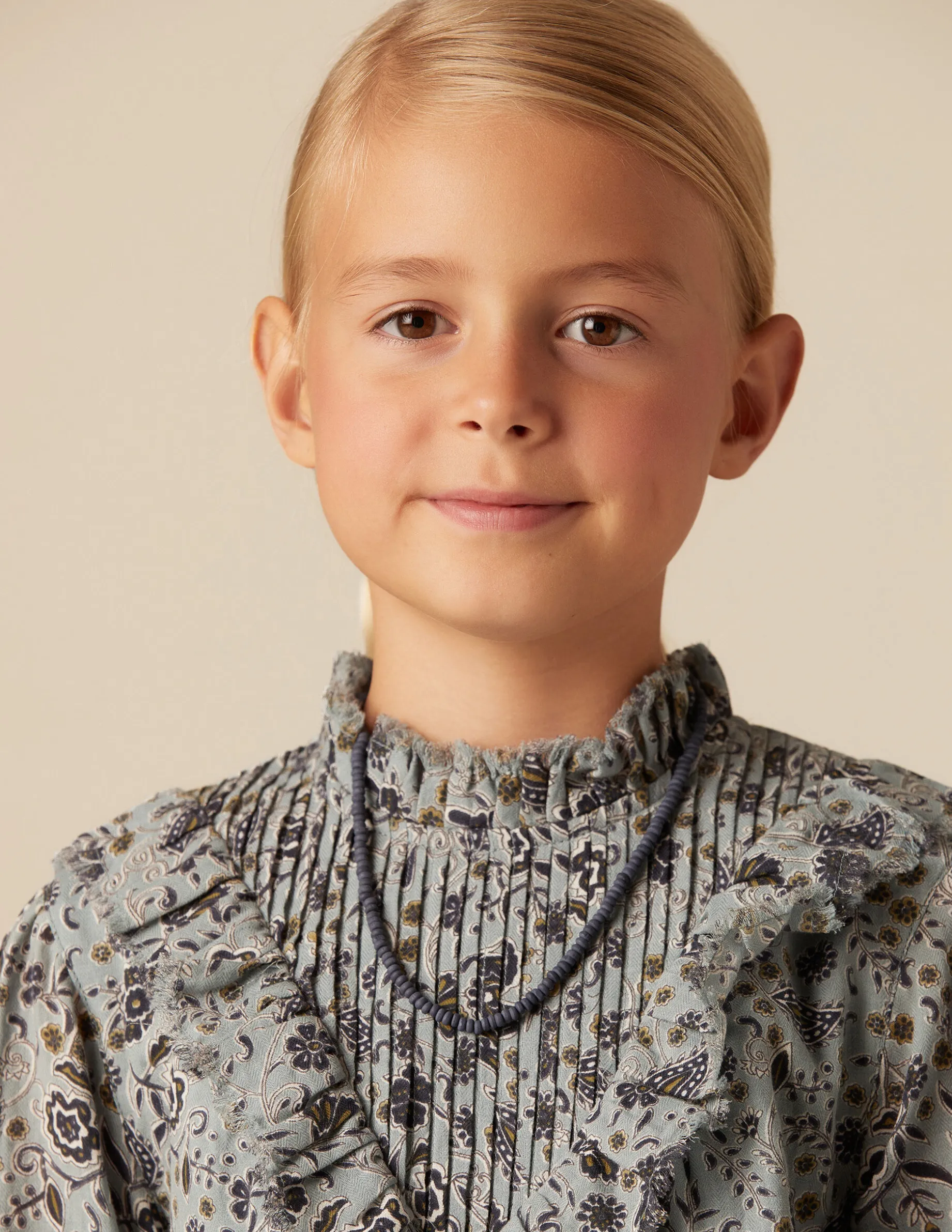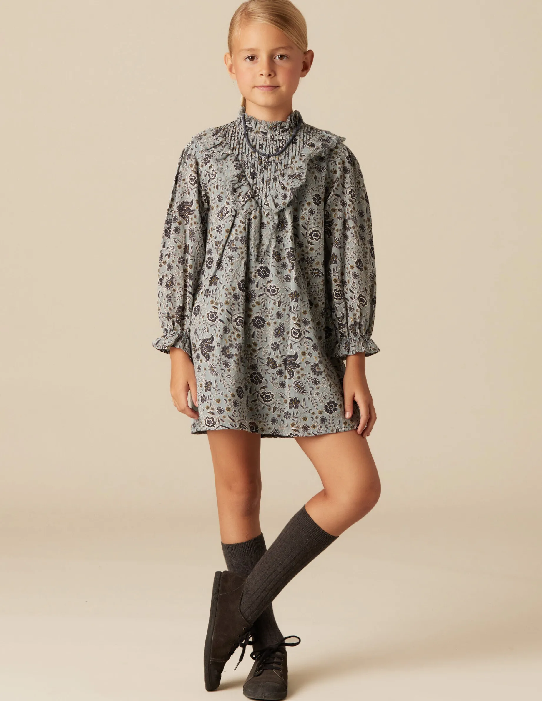 Vestido corto de niña, en estampado de la colección. Patrón con manga larga, rematada en puño, y detalle de jaretas en el pecho.