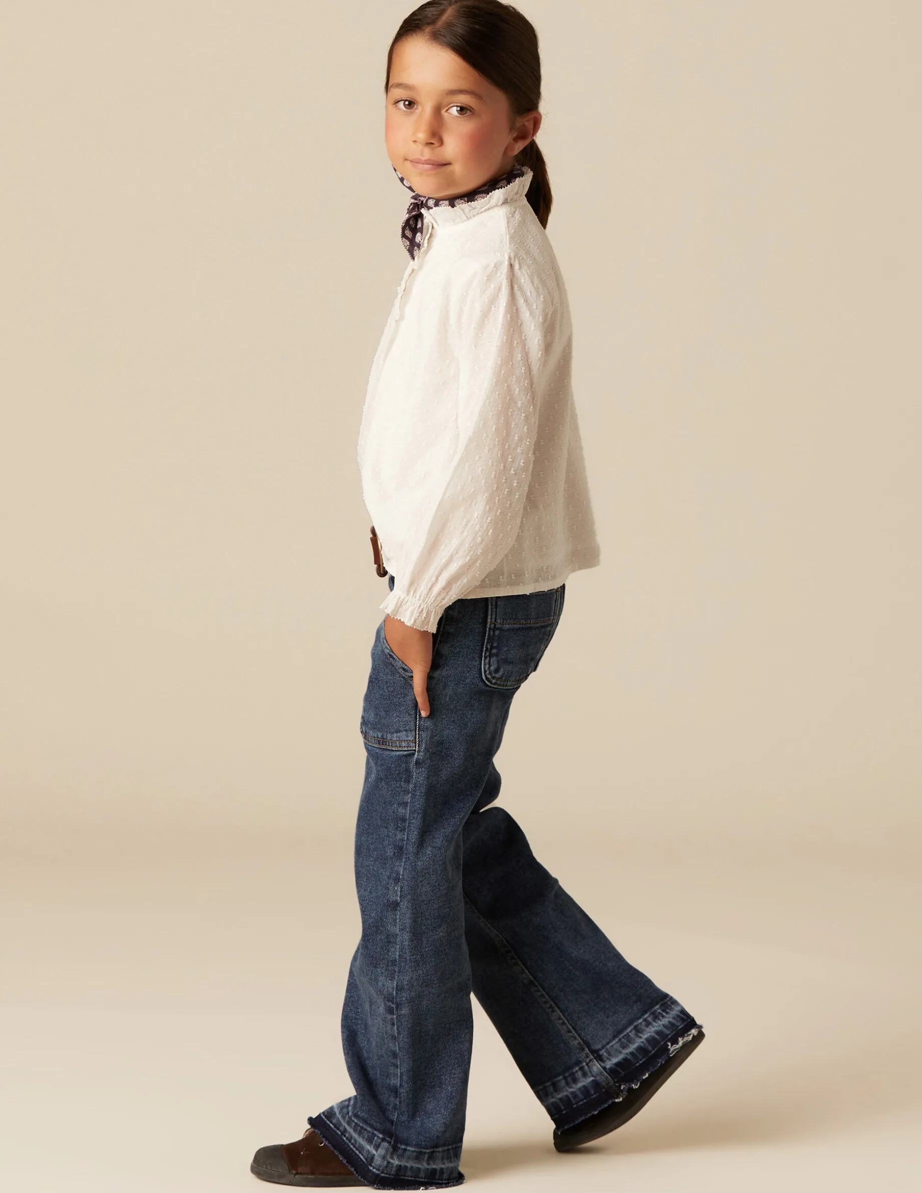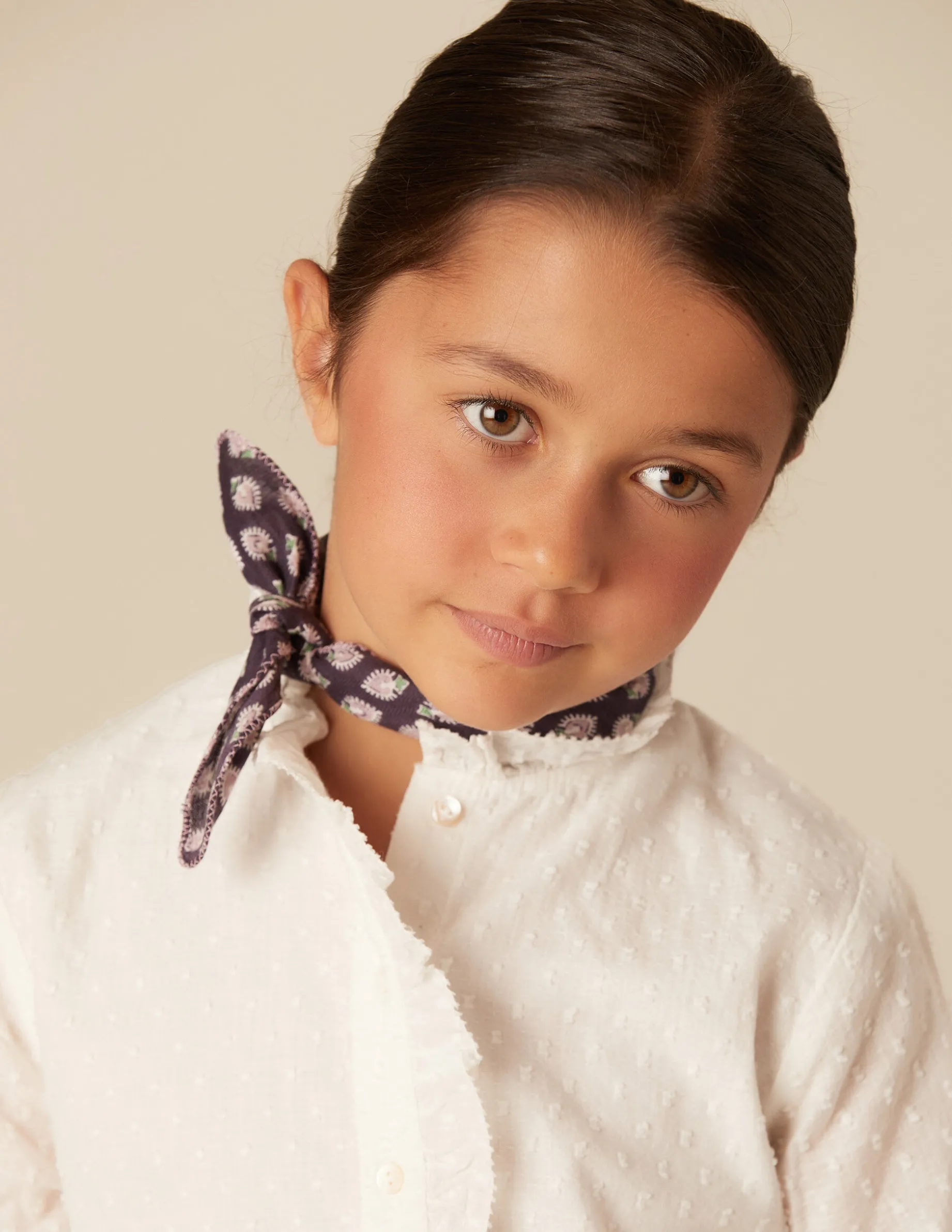 Camisa de niña cruda, en tejido con textura. Patrón con cuello perkins, manga larga y cierre con botones por delante.