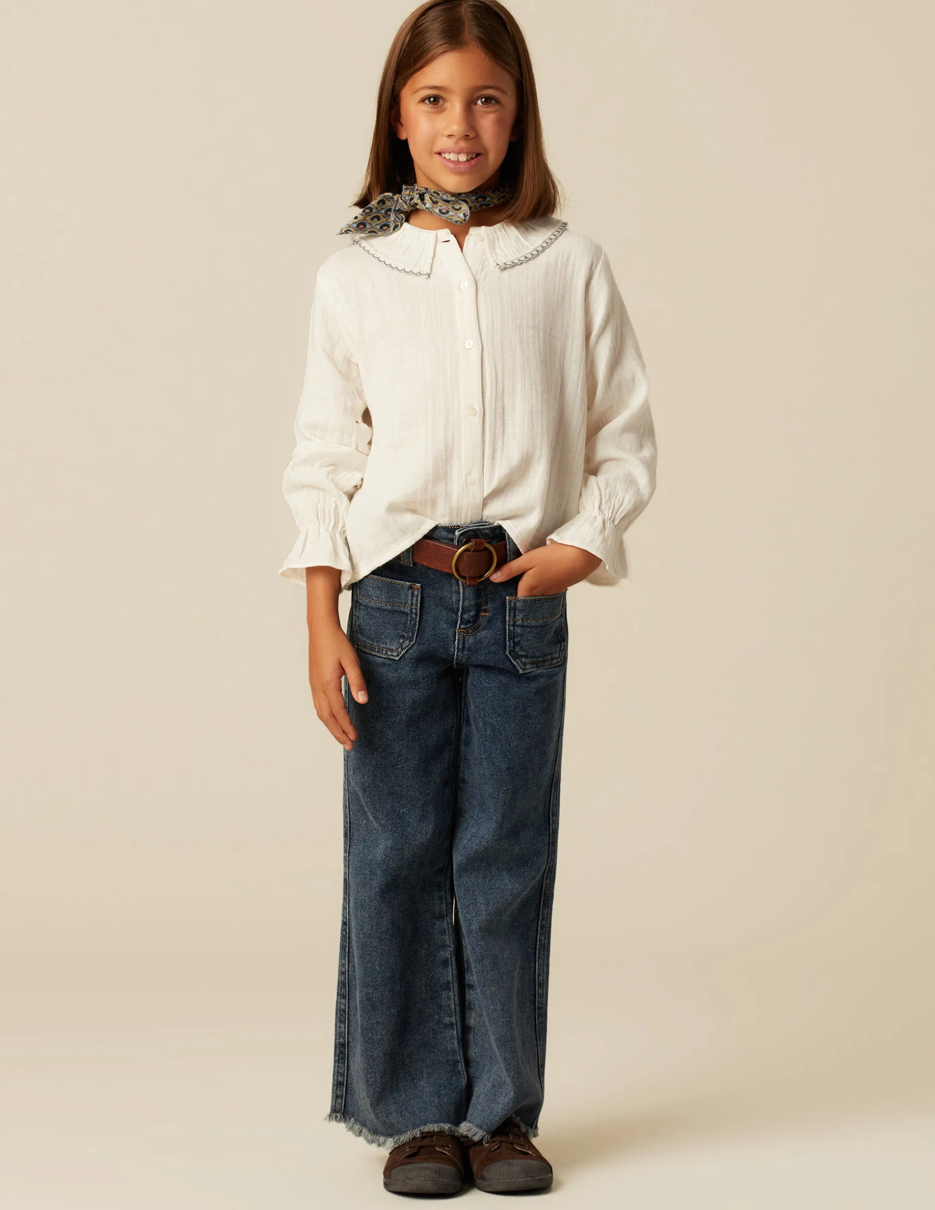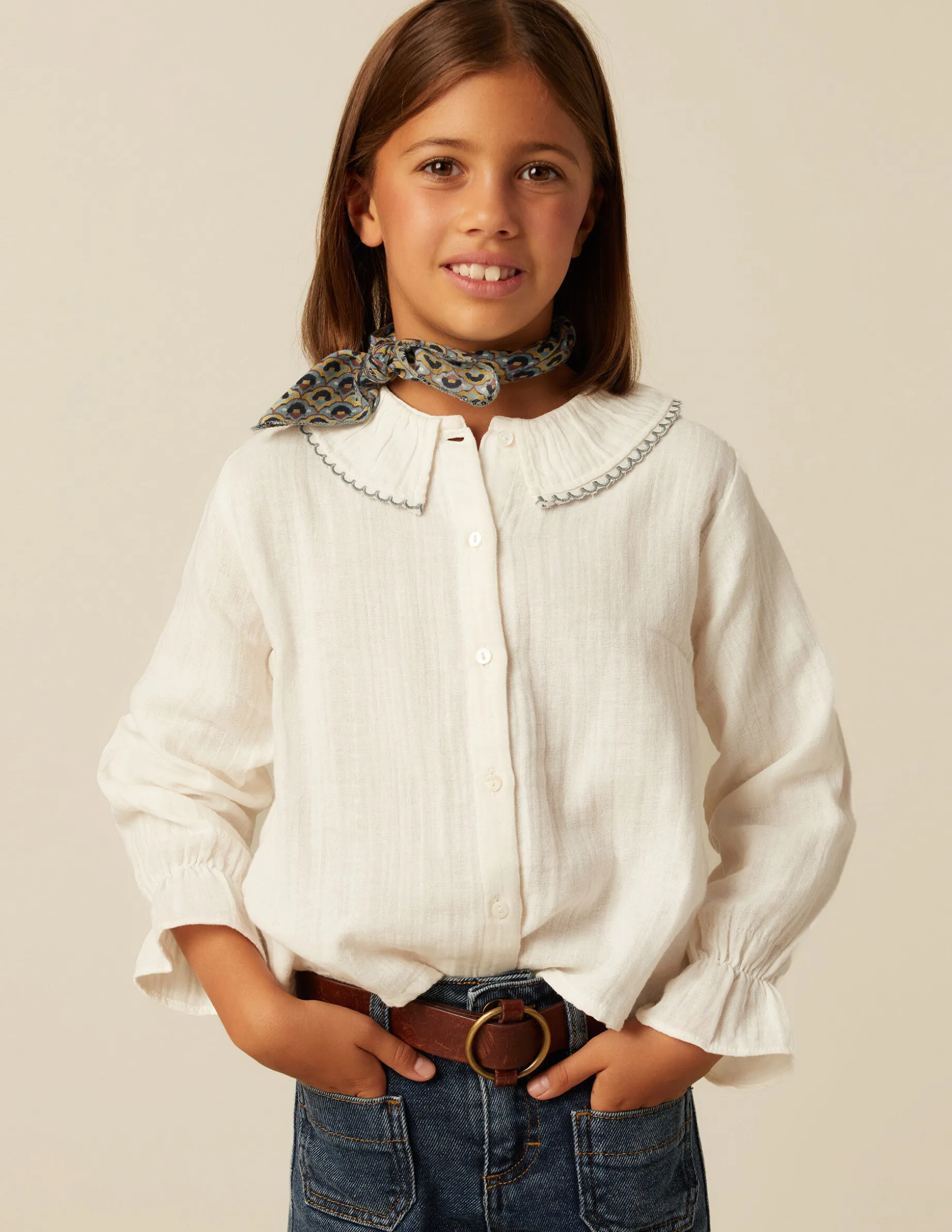 Camisa de niña cruda, con detalle de bordado en color de la colección en el cuello. Cierre con botones frontales.