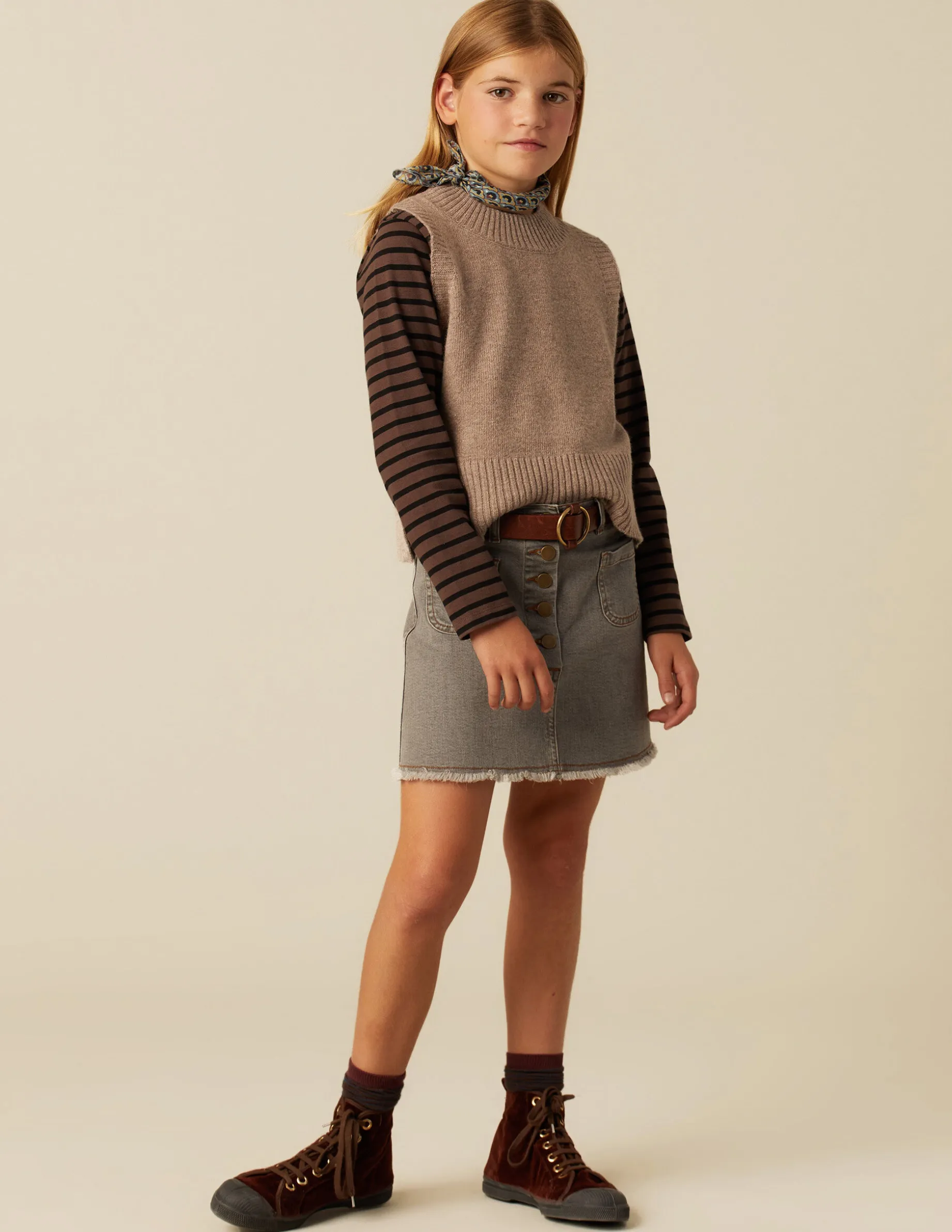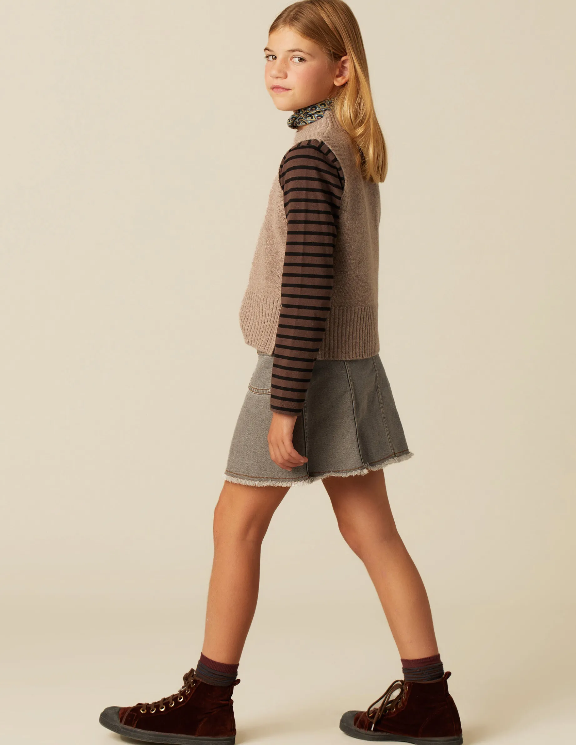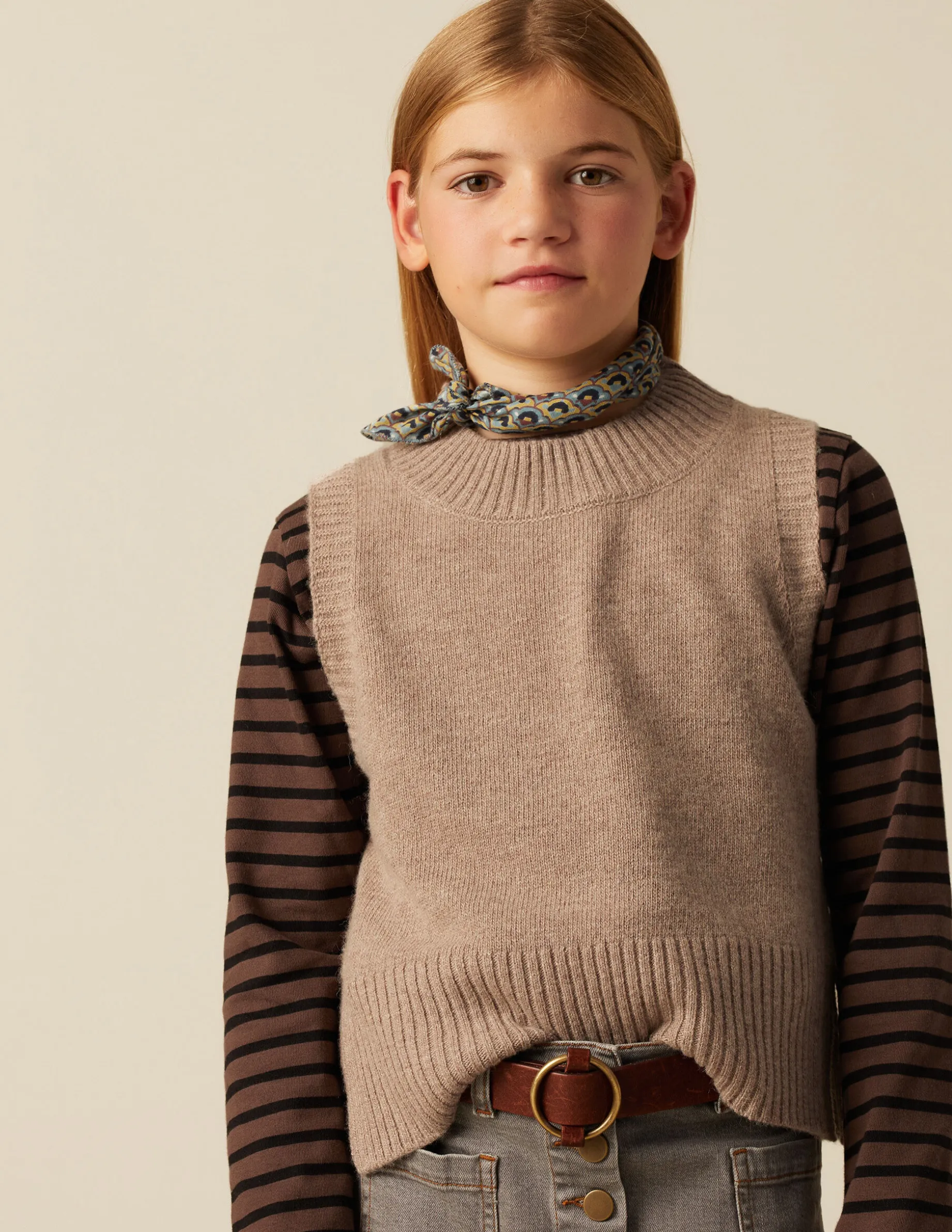 Chaleco cuello redondo marrón jaspeado. Acabados en canalé.