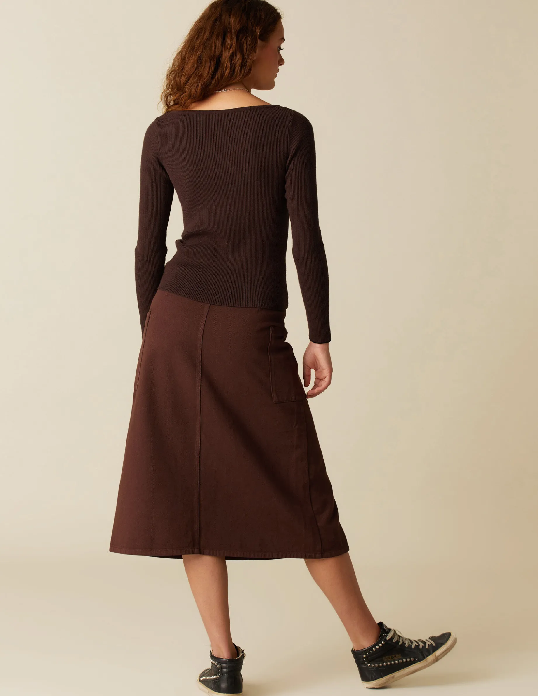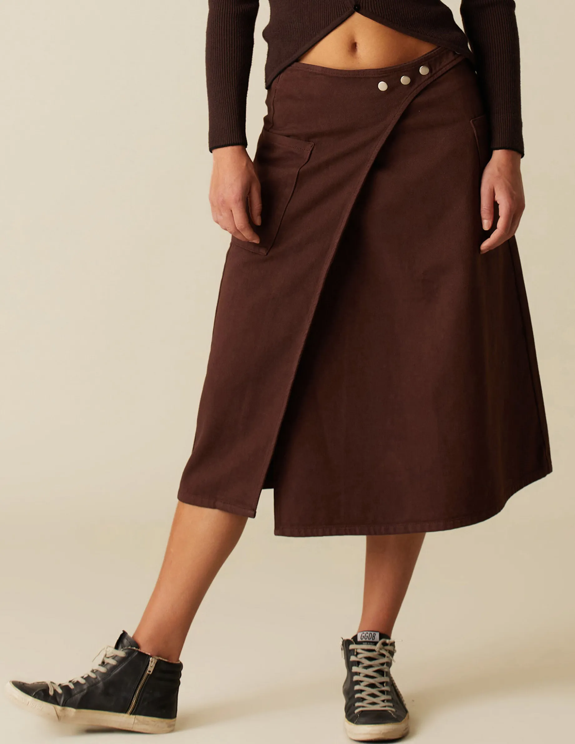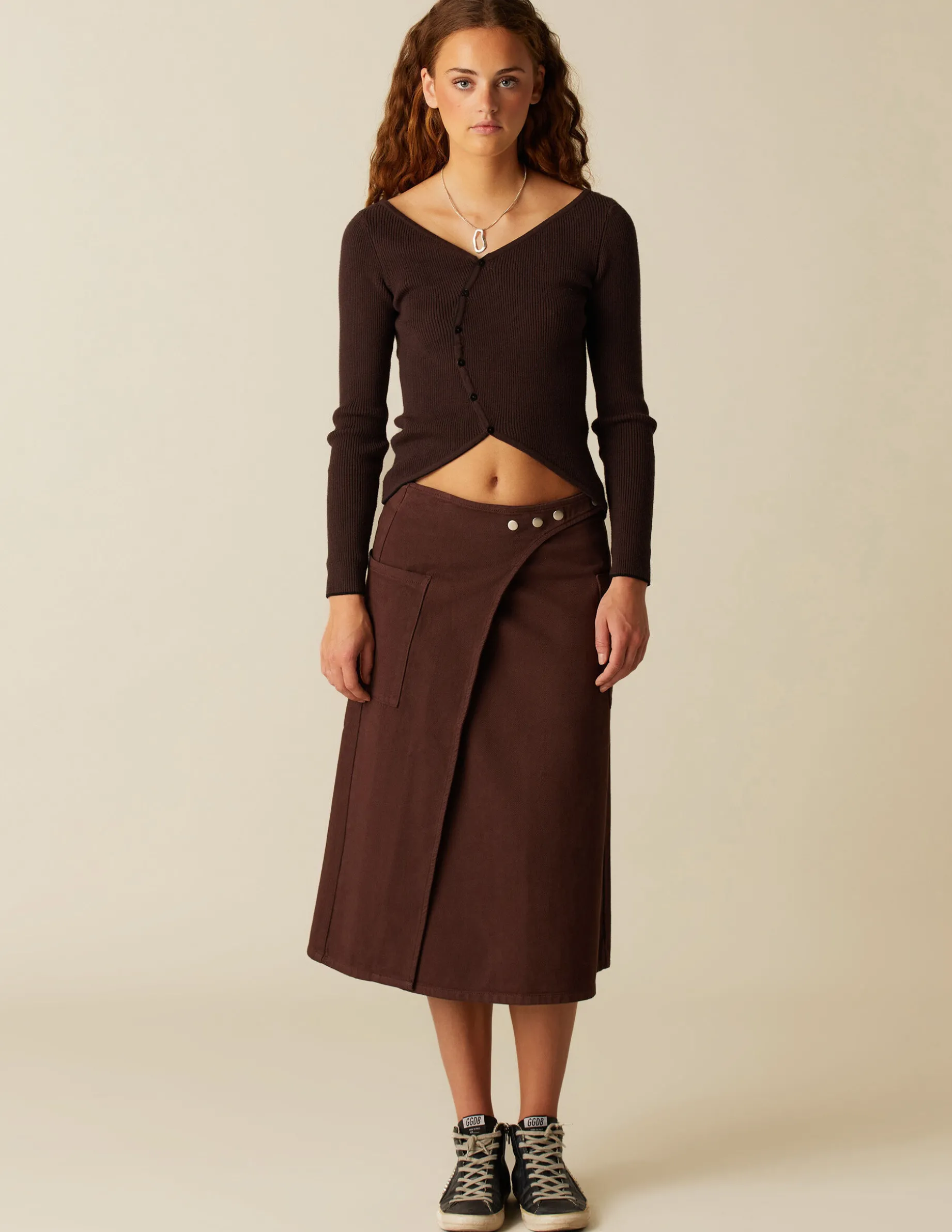 Falda larga marrón y corte midi. Cierre cruzado mediante botones laterales. Dos bolsillos laterales.