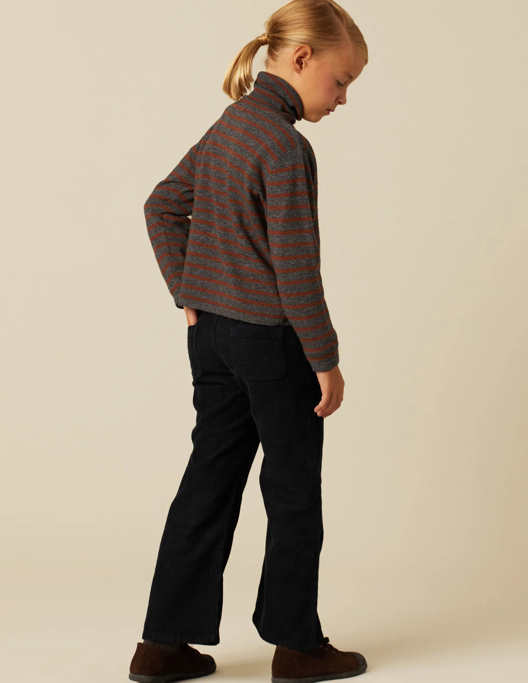 Jersey en punto de rayas en colores marrón y marengo. Patrón de cuello vuelto y manga larga.