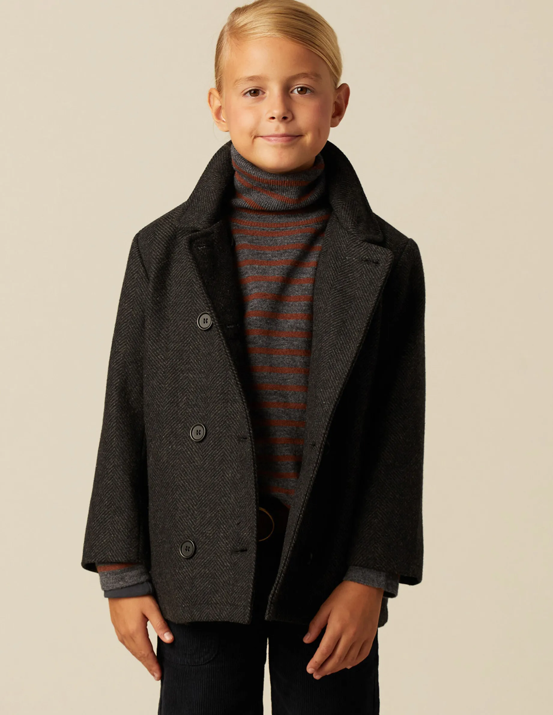 Abrigo cruzado en tejido espiga gris. Cierre con botonadura en delantero.