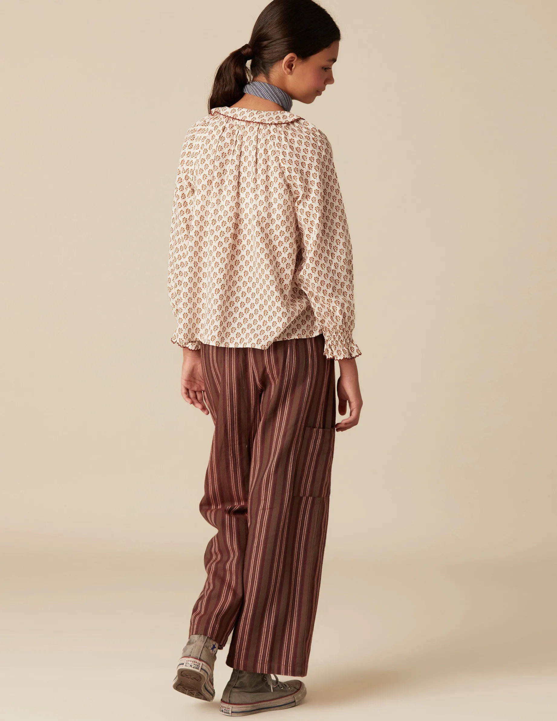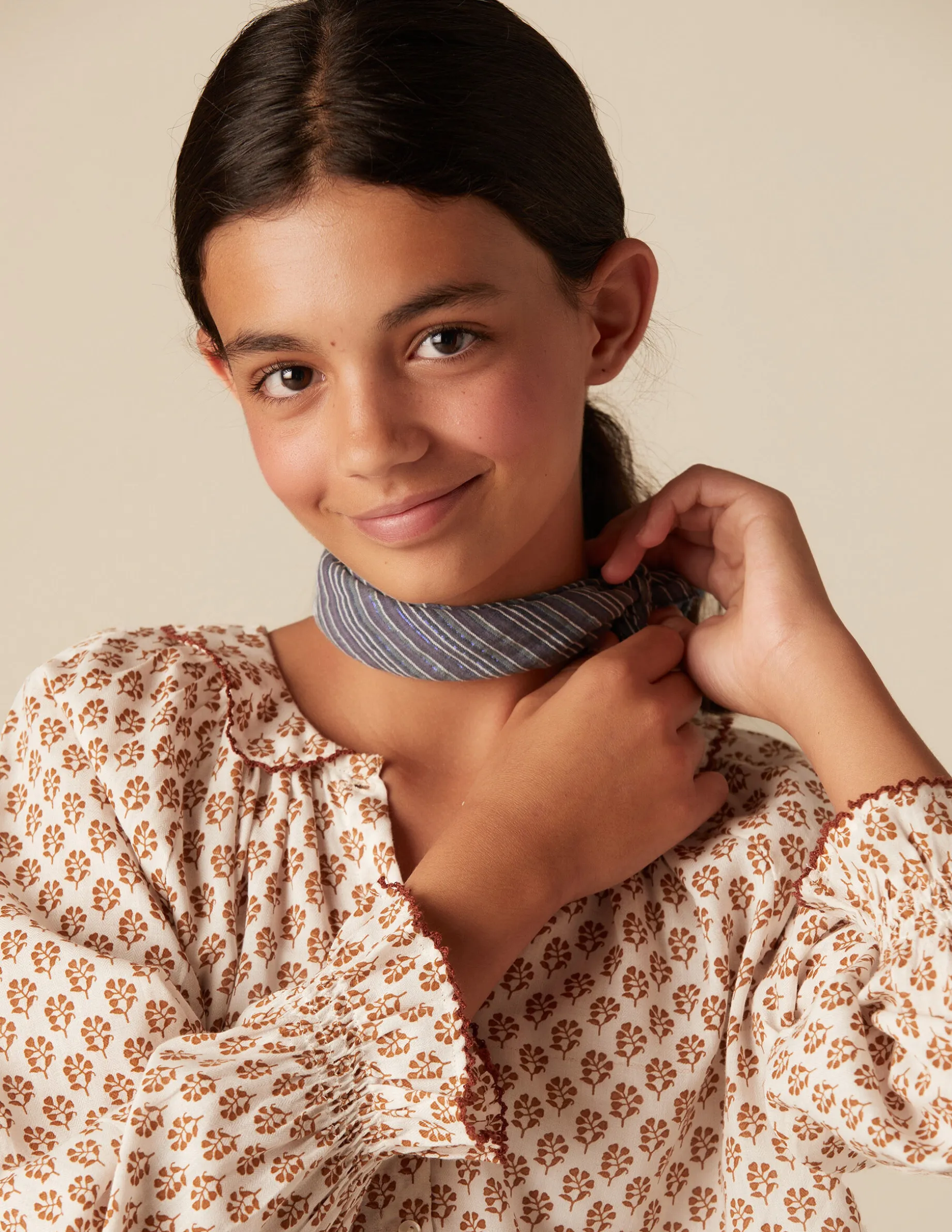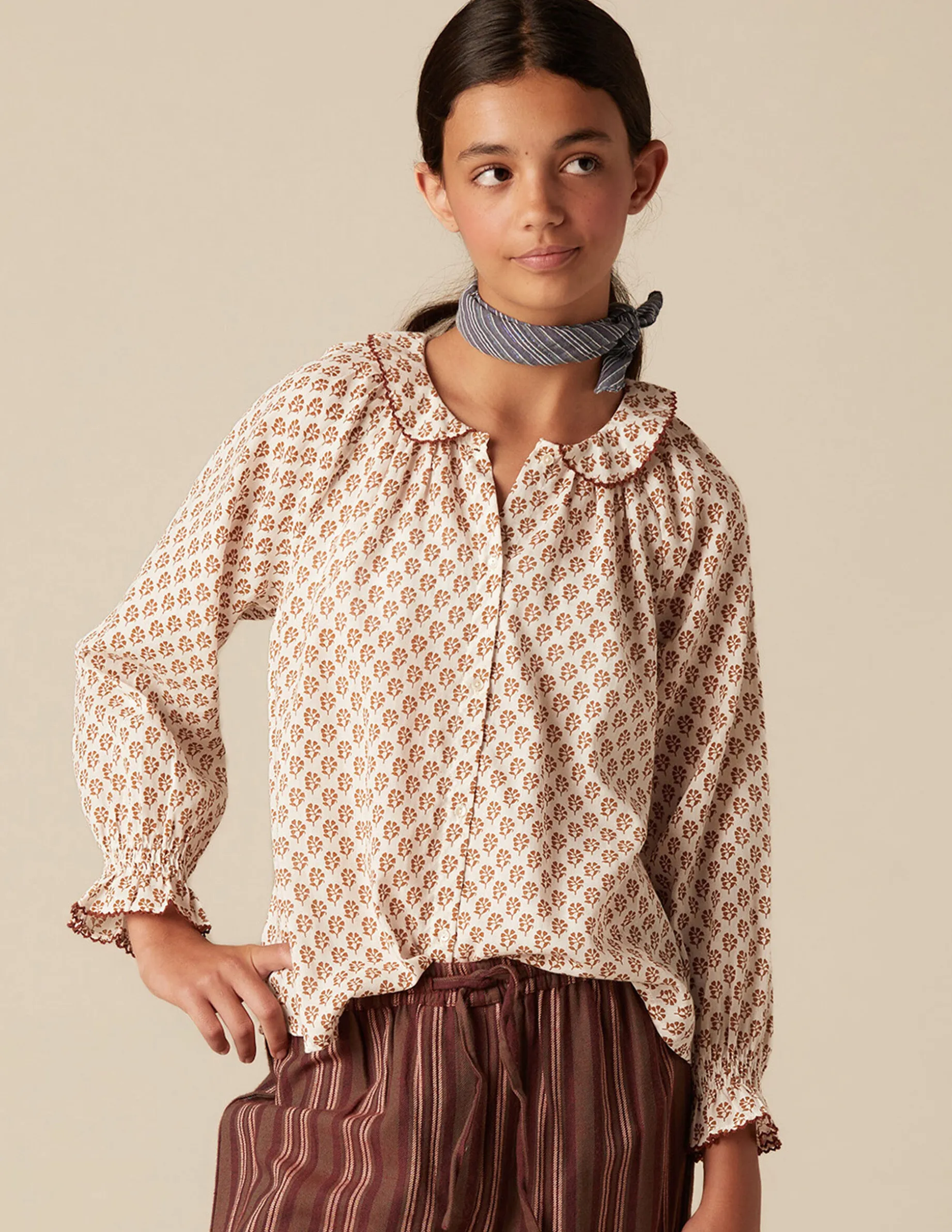 Camisa de teen, en print de la colección. Patrón con cuello lunas, con detalle de stitching a contraste. Manga larga rematada con volante. Cierre frontal.