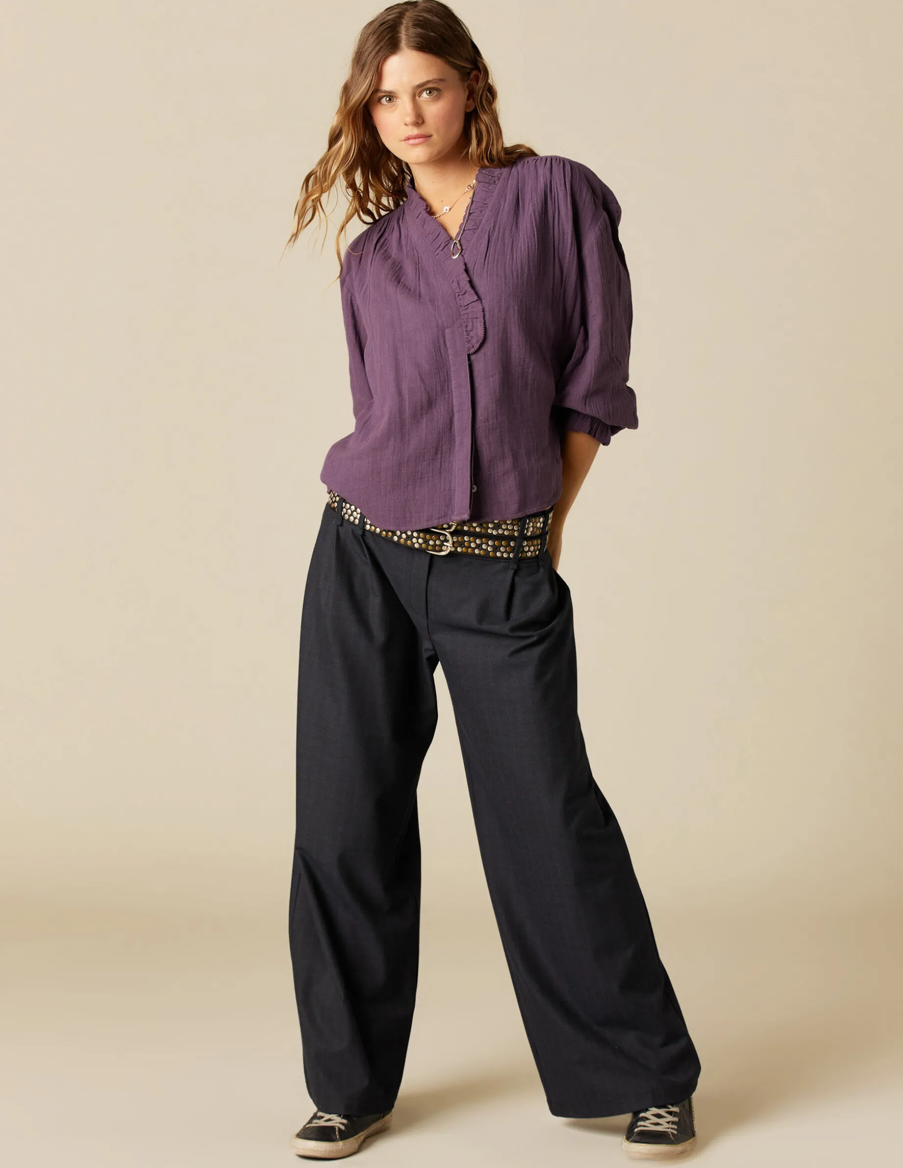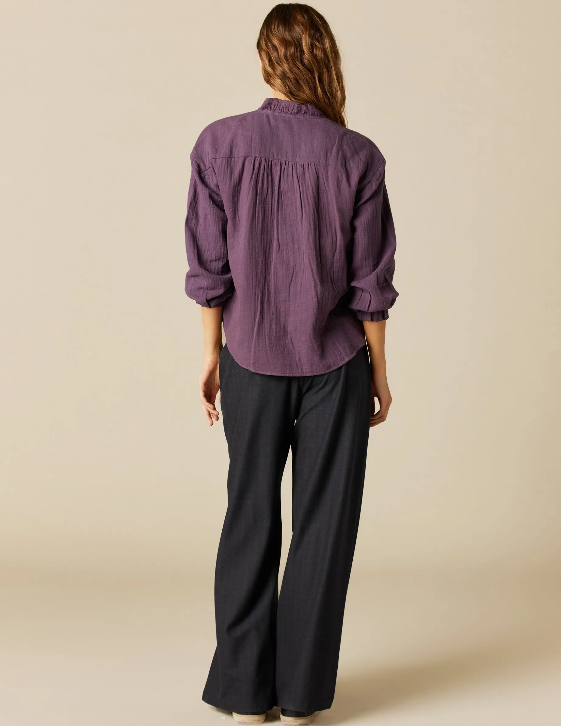 Camisa de chica en color de la colección. Patrón con cuello perkins con un volante, manga larga rematada en volante.