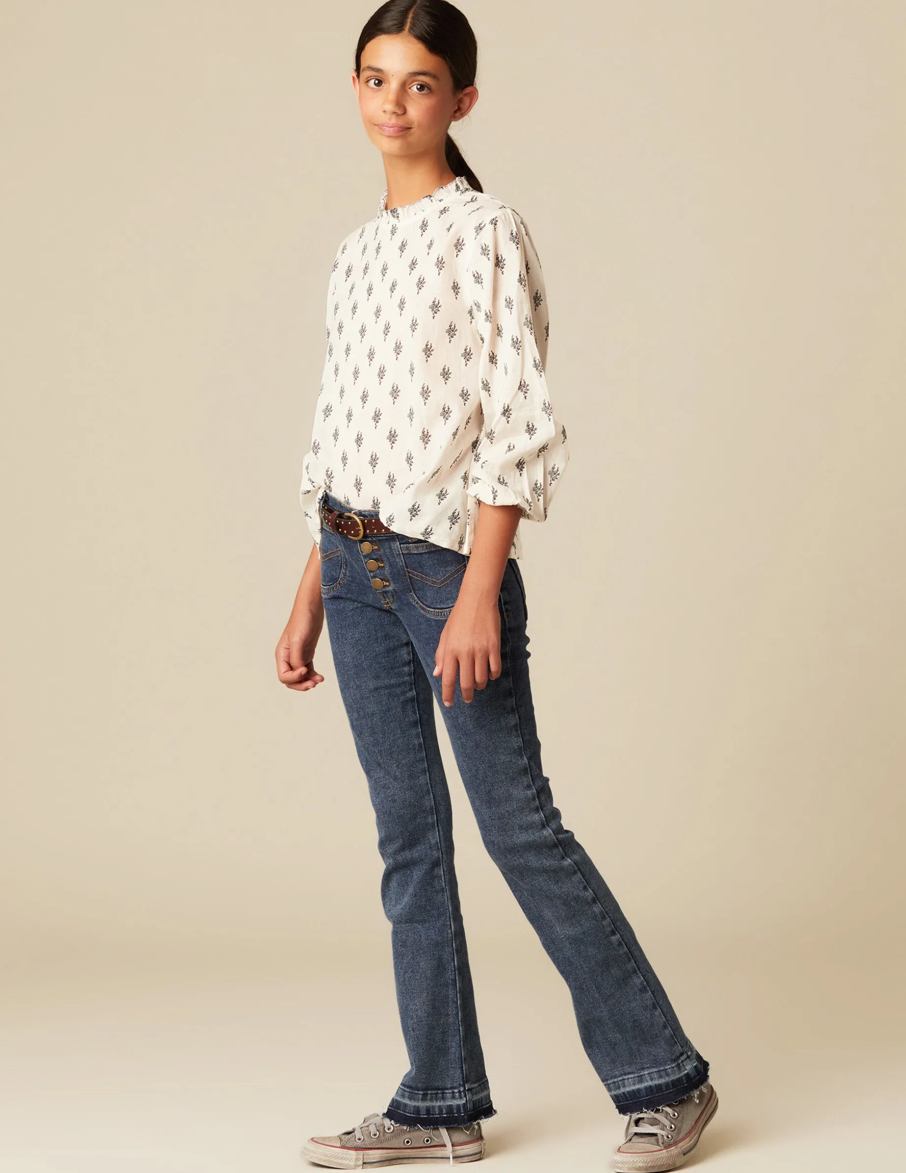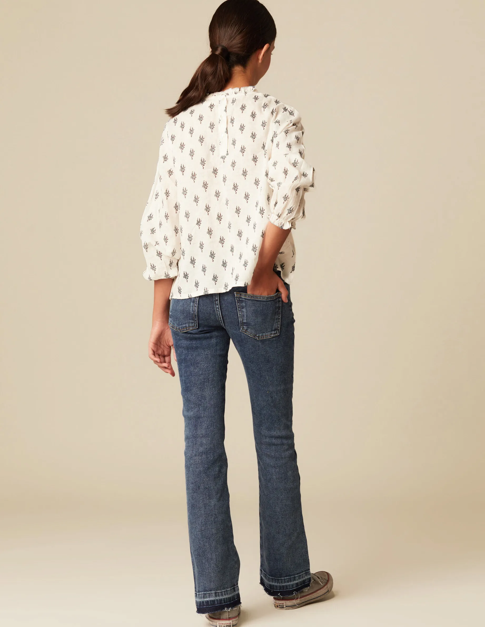 Camisa de teen, en estampado de la colección. Patrón con cuello perkins, manga larga rematada en volante y cierre por detrás con botones. Detalle de stitching a contraste en manga y cuello.