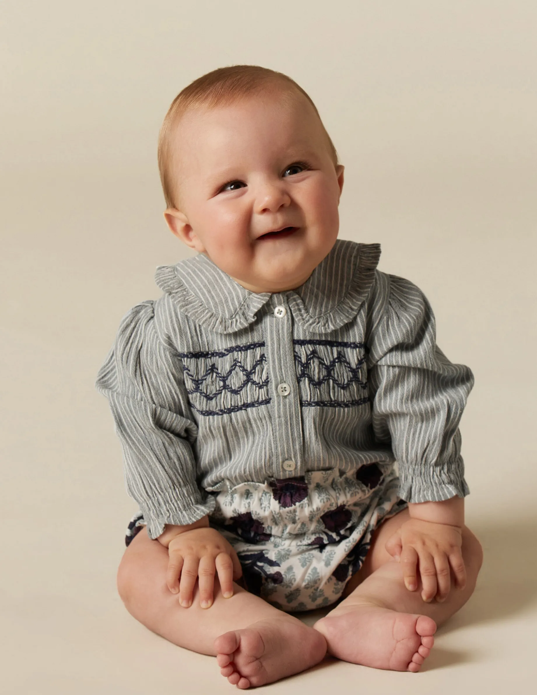 Camisa de bebé en tejido de rallas de algodón. Patrón con cuello lunas y manga larga. Cierre por delante con botones.