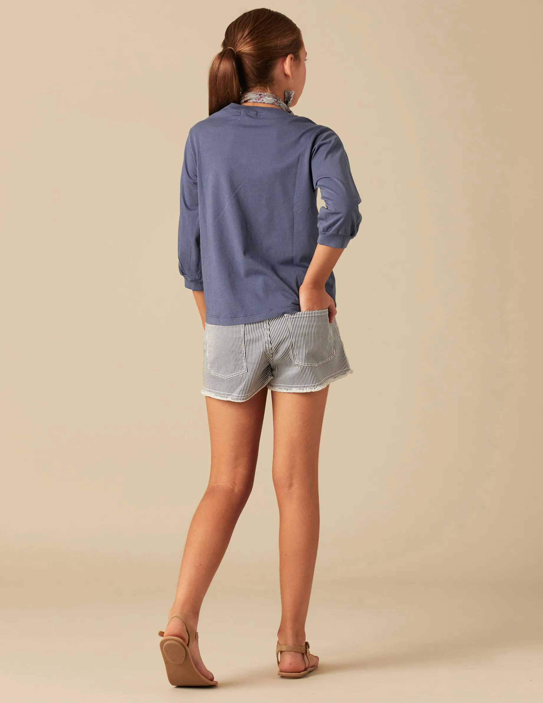 Camiseta de teen de manga 3/4 de niña. Patrón parecido a sudadera, con detalle de bolsillo en el pecho.