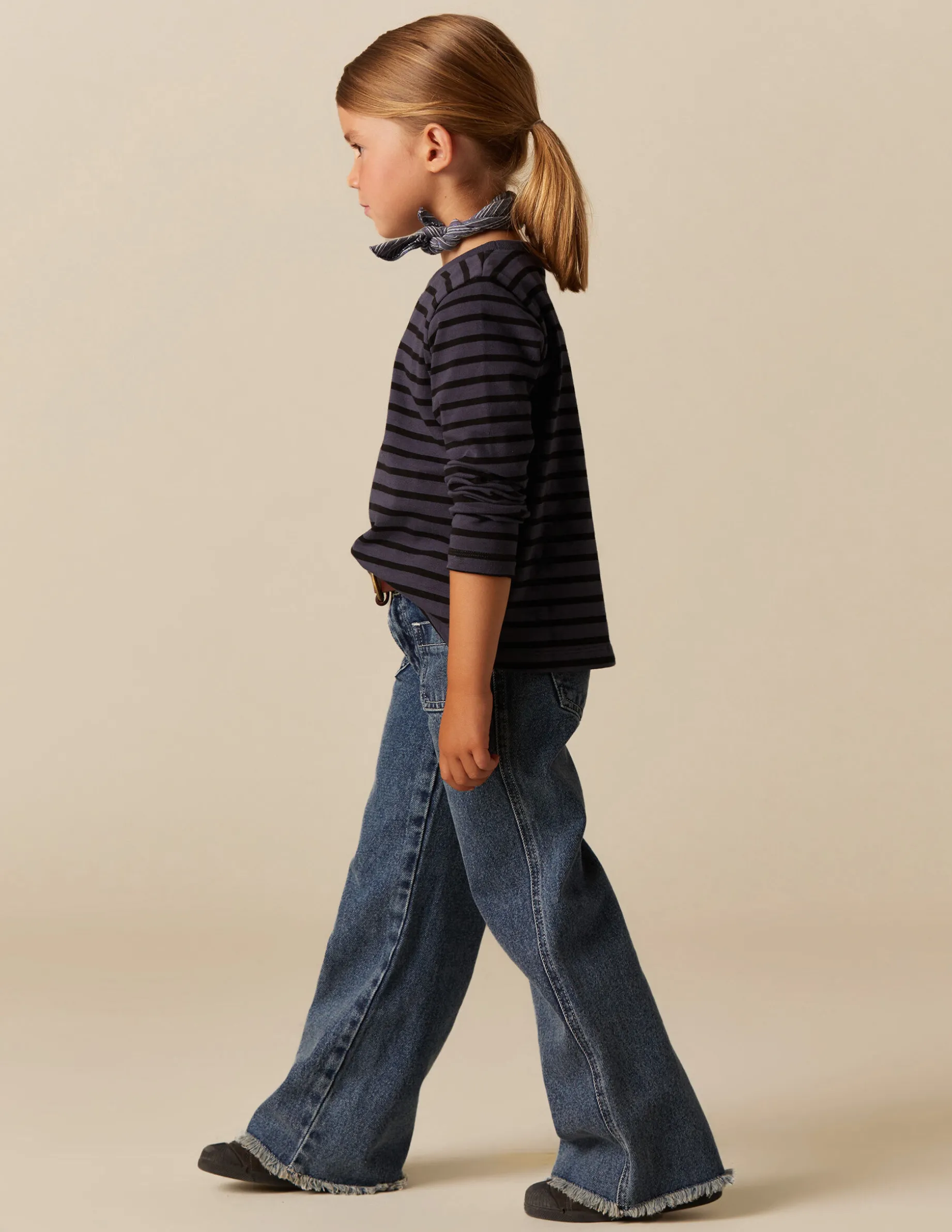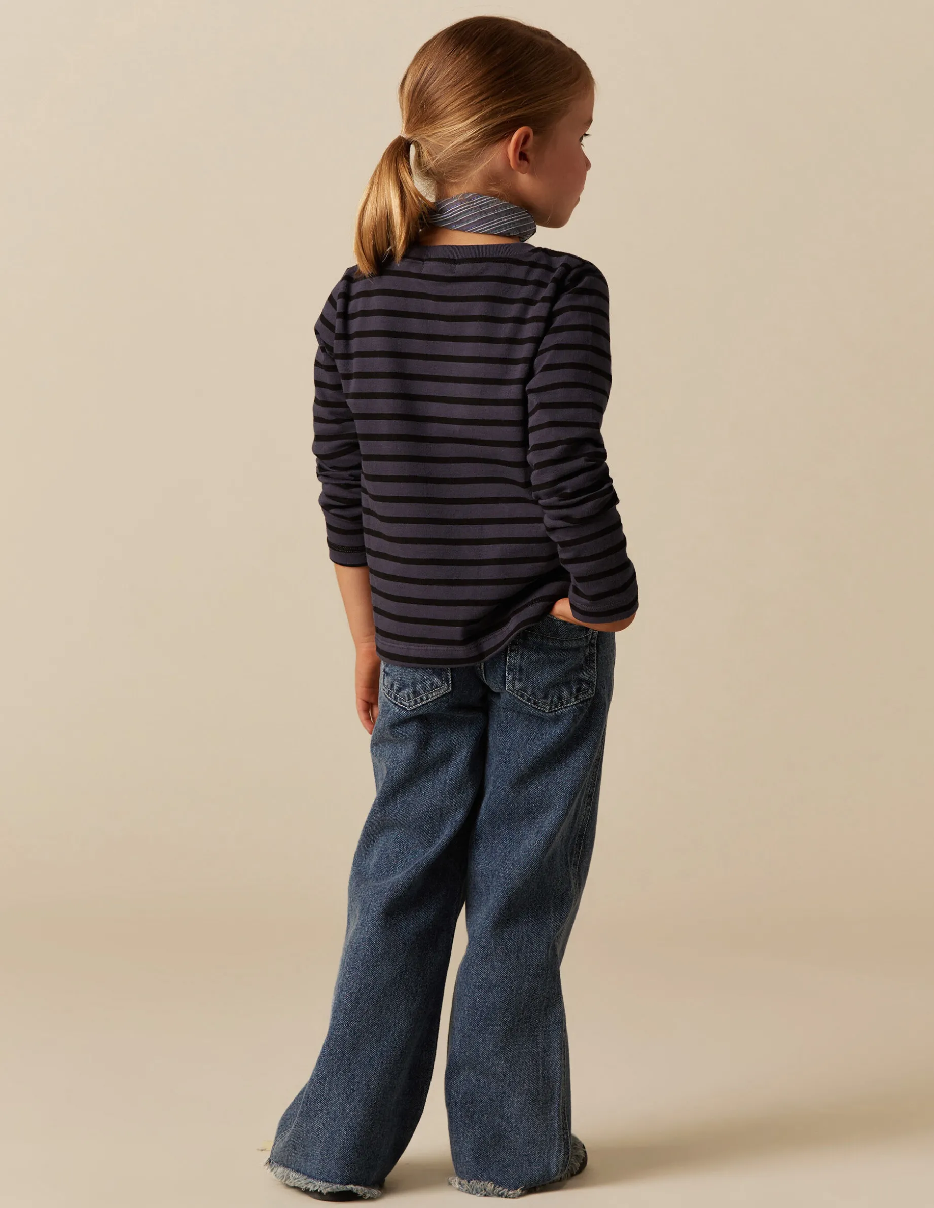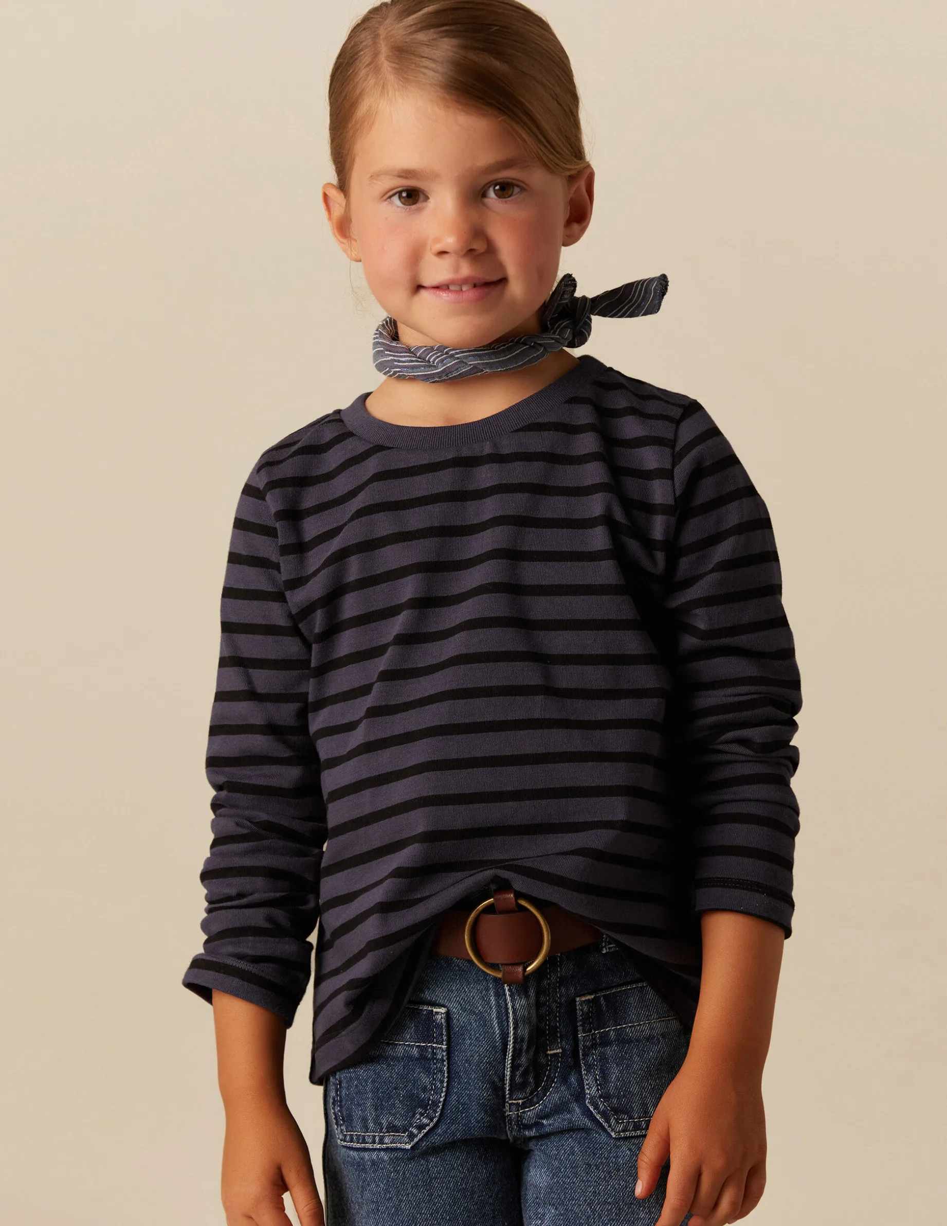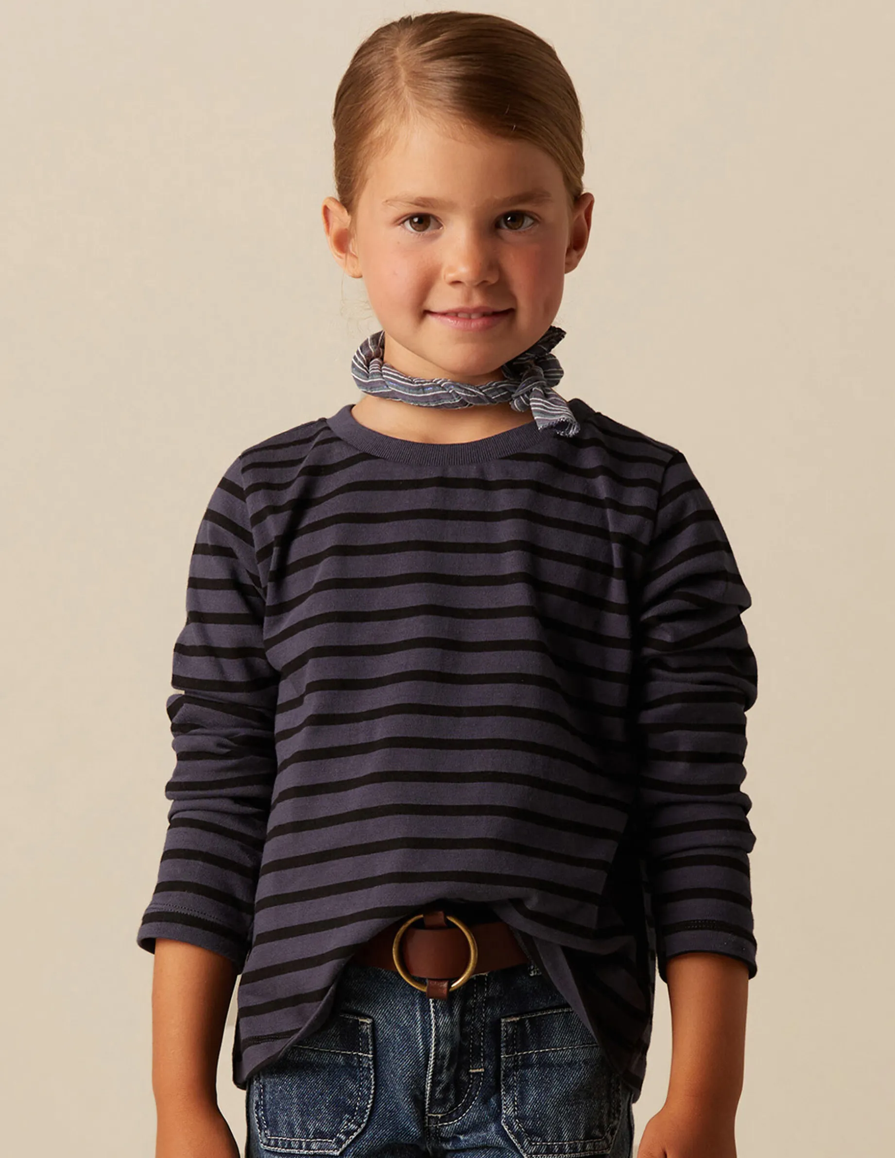 Camiseta de niña, en color de la colección con rayas grandes antracita. Patrón con cuello redondo y manga larga. Parte de los beneficios recibidos se destinan a la Fundación a la Par, con la que Nícoli colabora desde hace años.