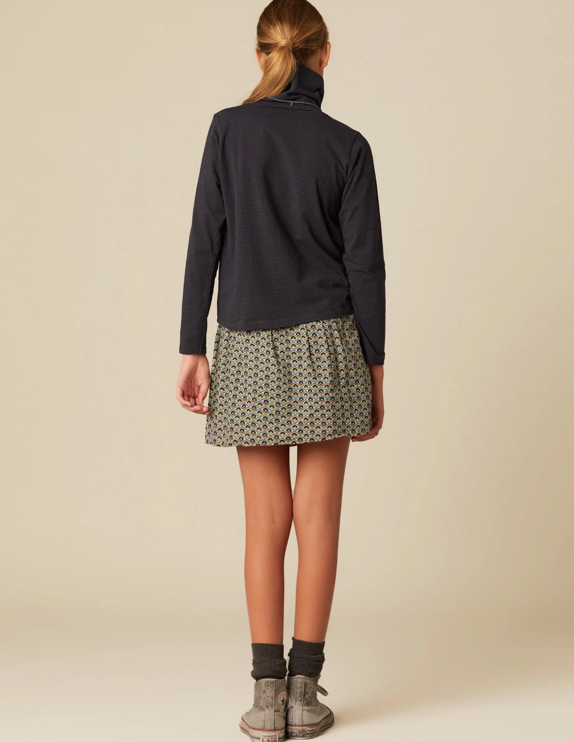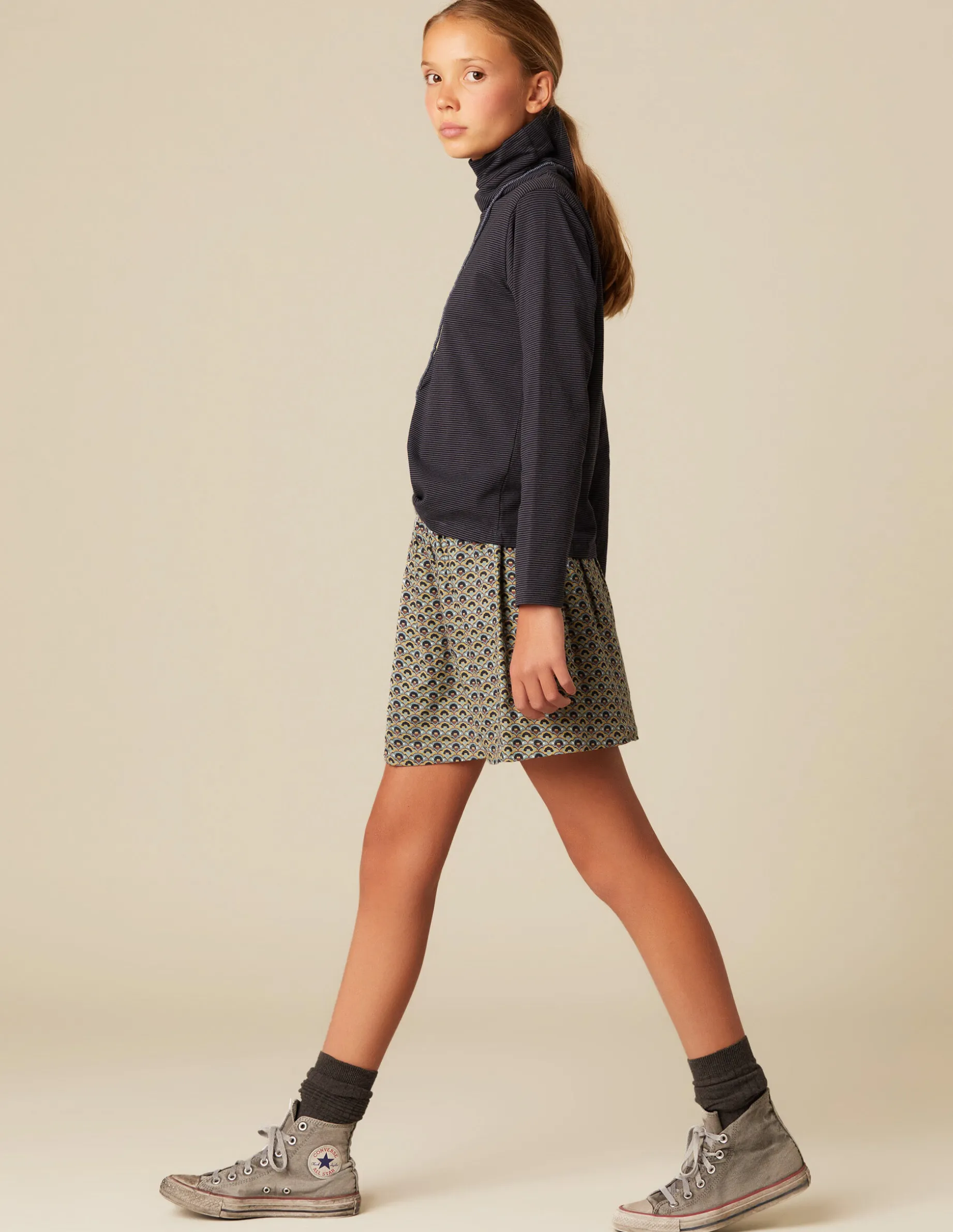 Falda corta de teen, en estampado de la colección. Patrón con cierre lateral con botón, ajustable con lazo.