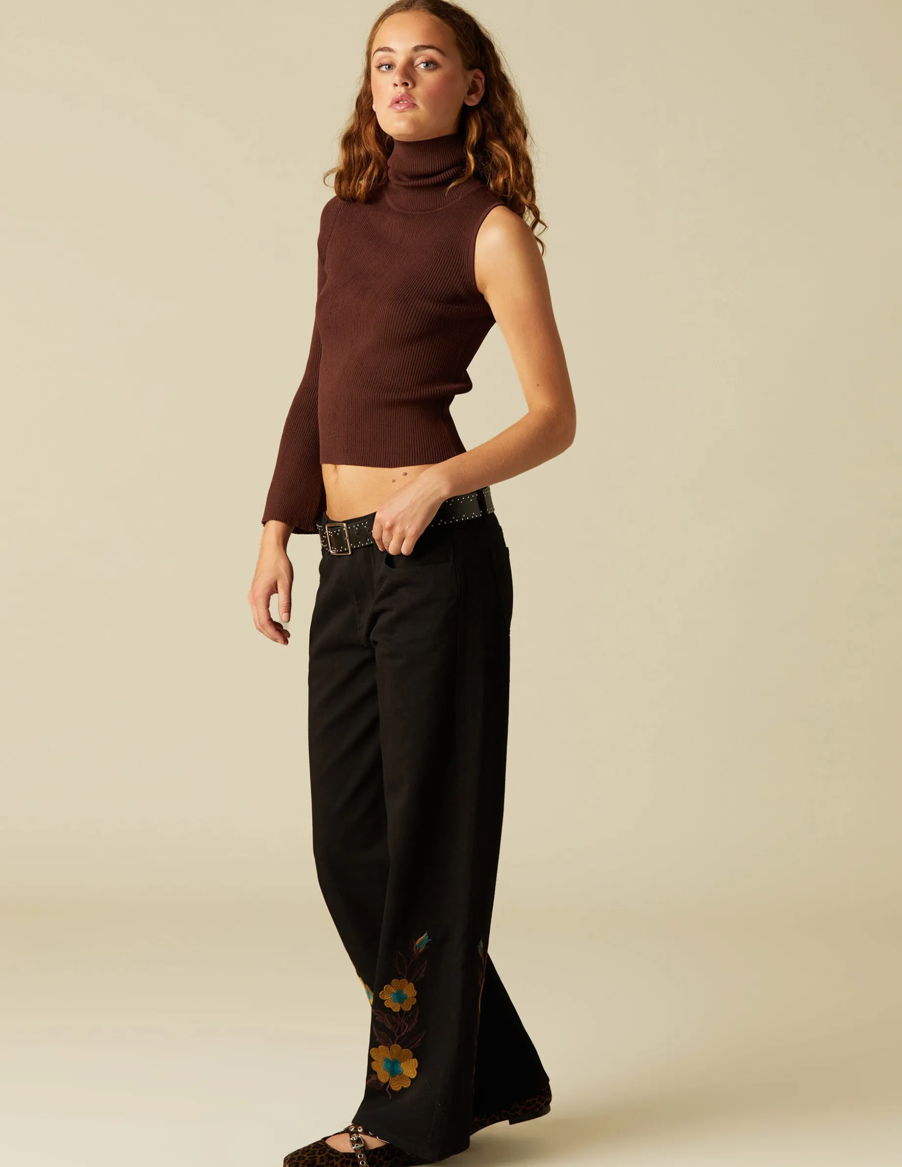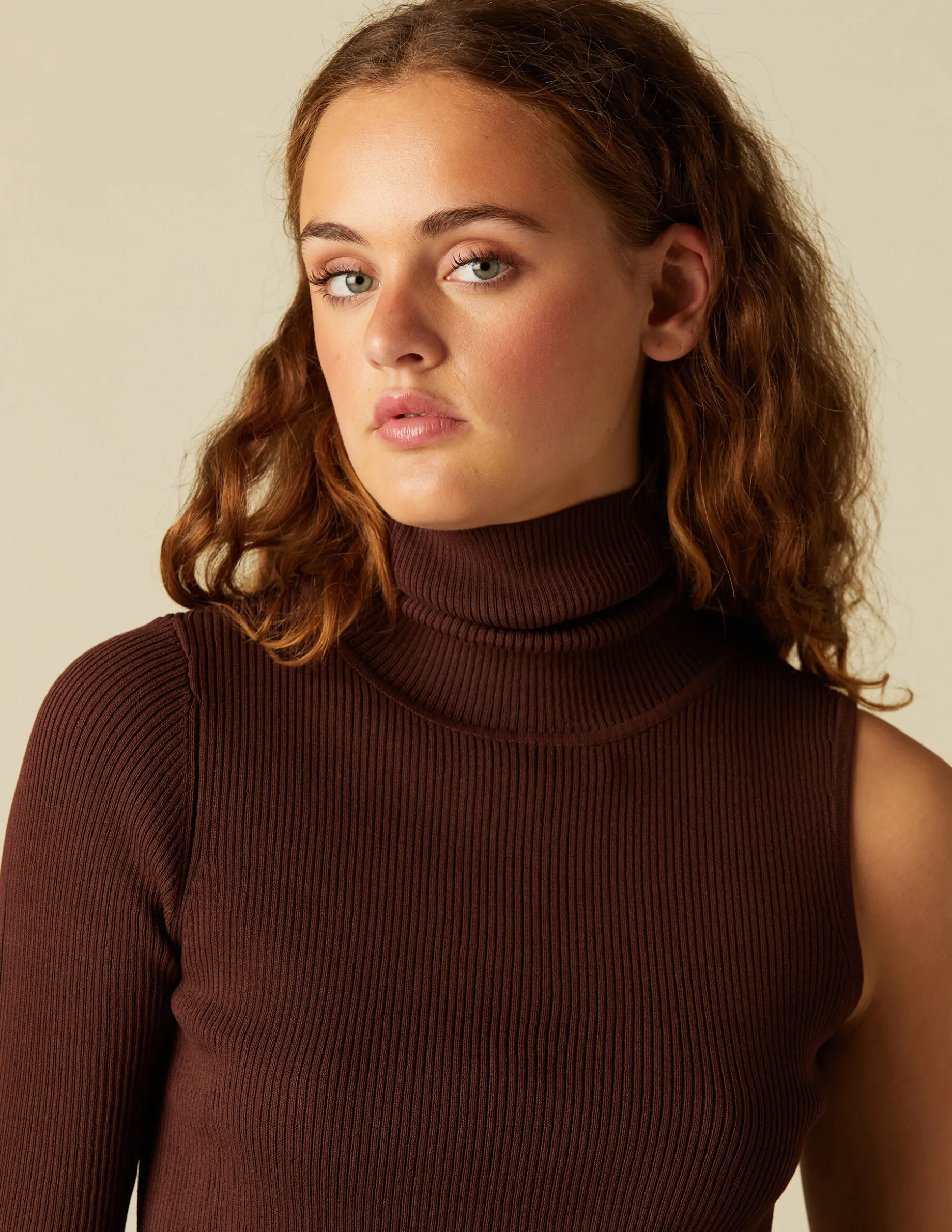 Top asimétrico de manga larga y cuello vuelto marrón..