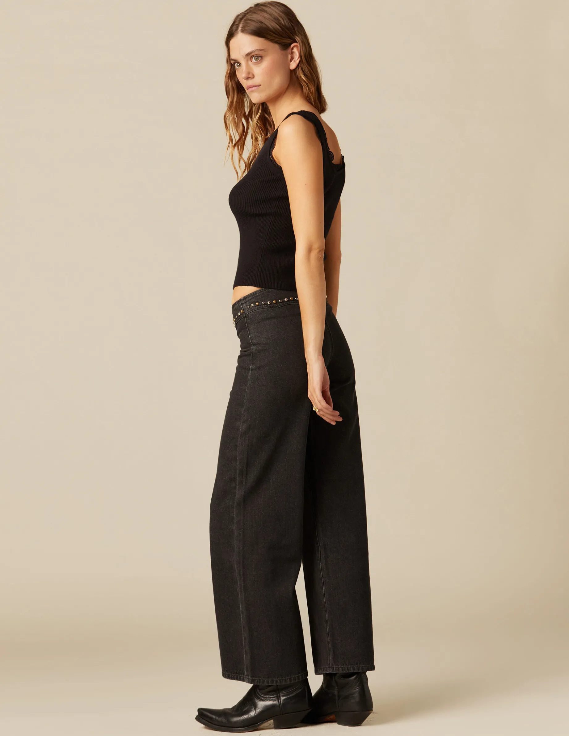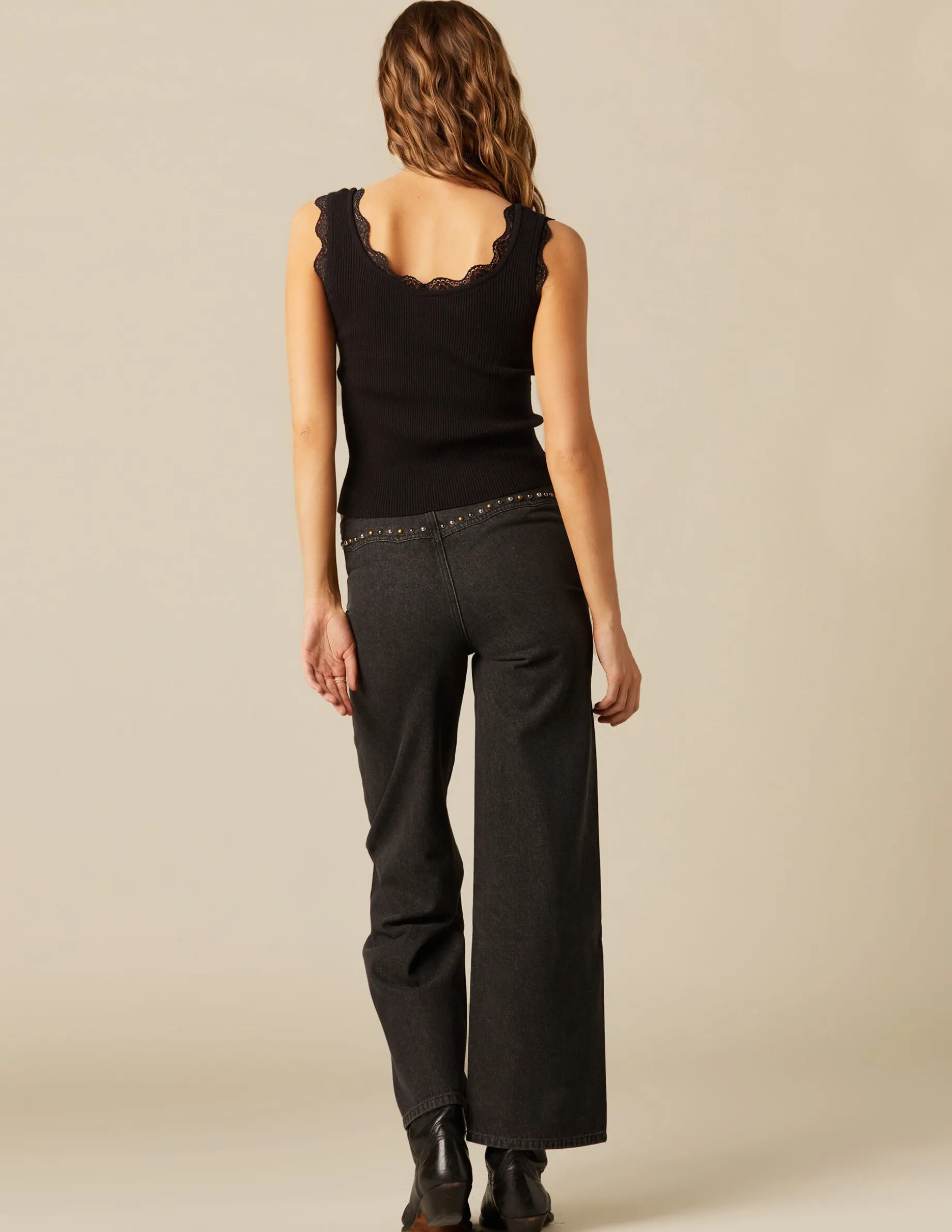 Top tirante ancho canalé negro. Detalle de encaje alrededor del escote, tirantes y sisa.