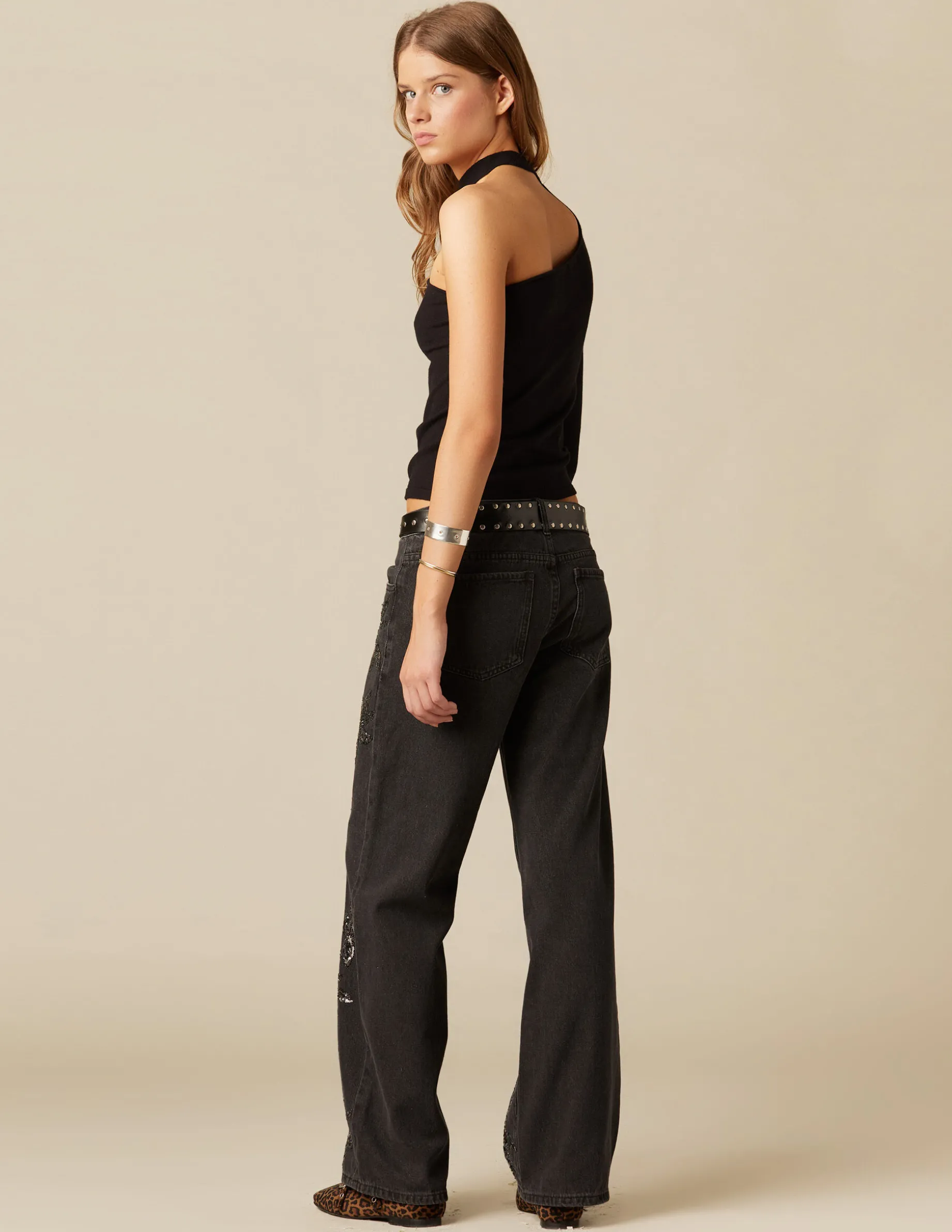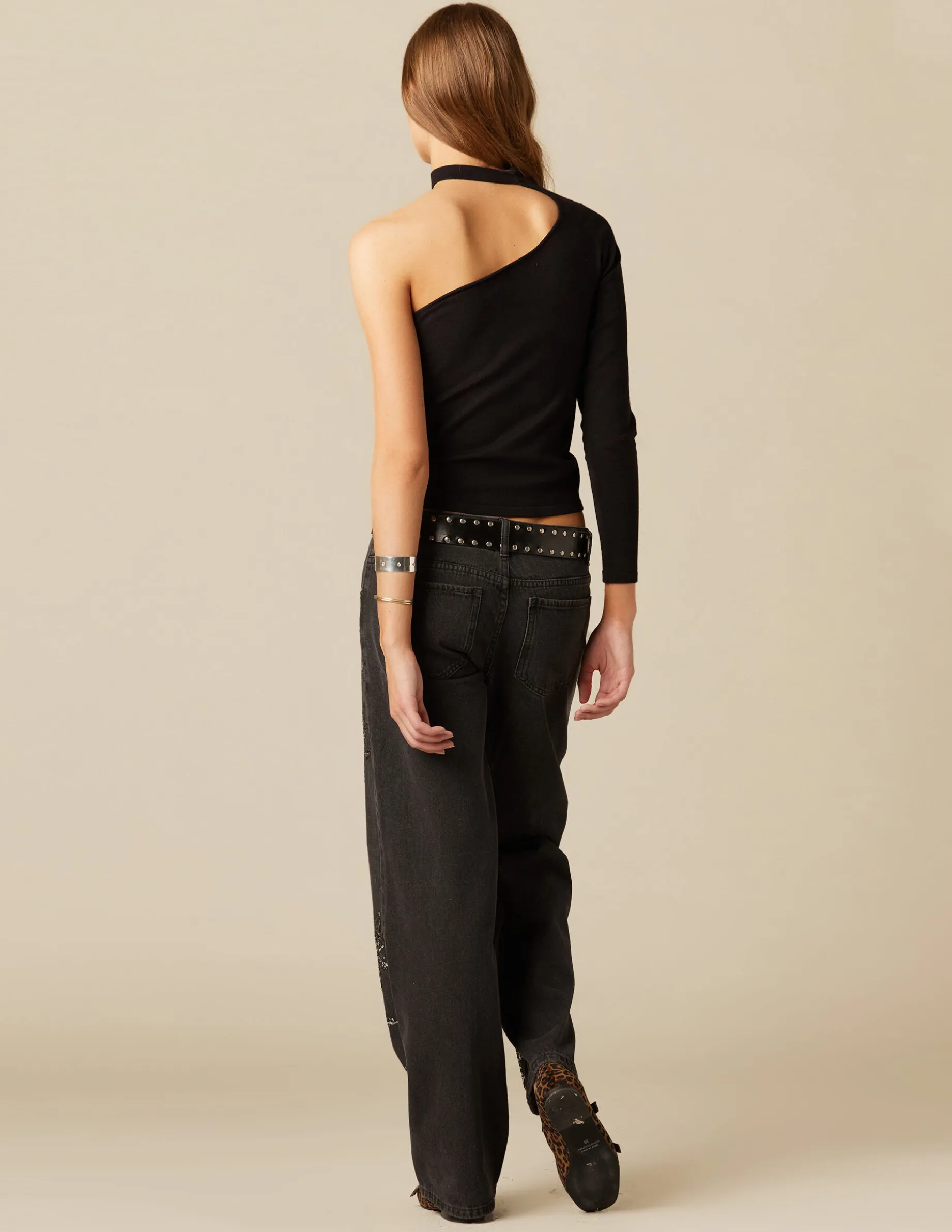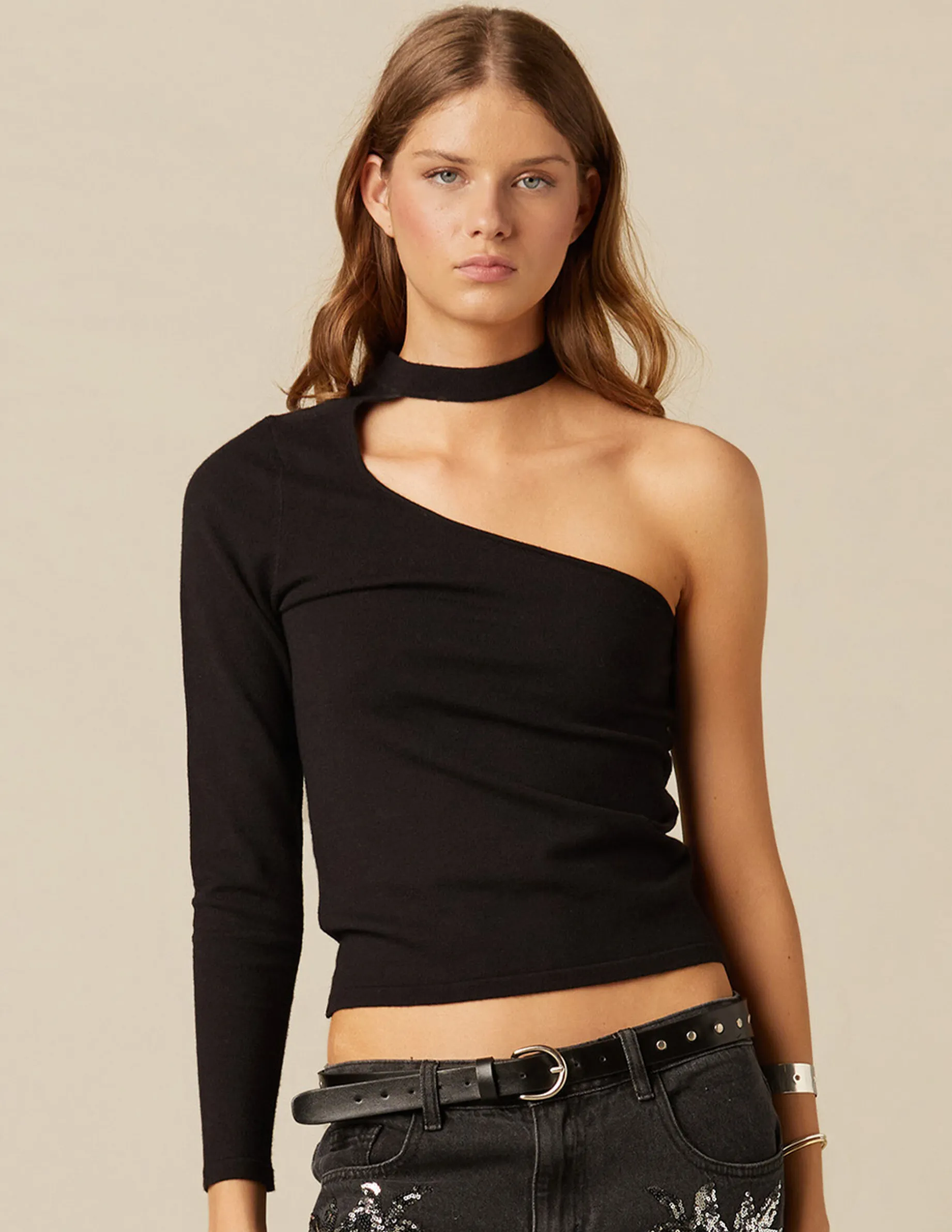 Top asimétrico manga larga negro con abertura en el escote y cuello cerrado.