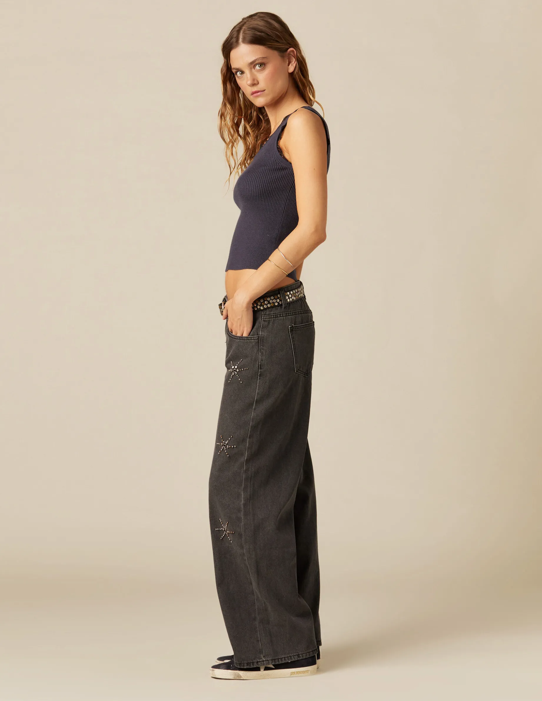Top canalé de tirantes con escote cerrado y detalle de encaje negro.