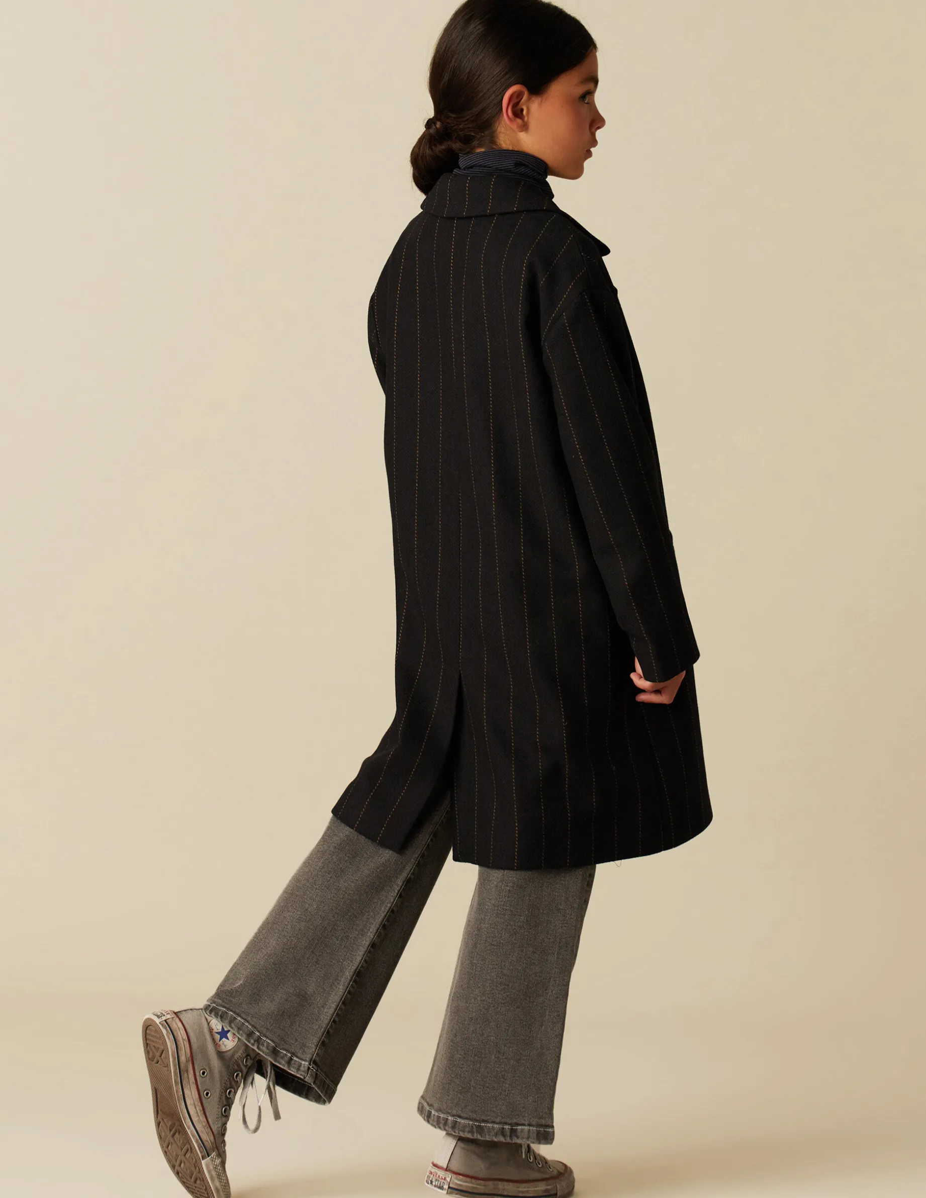 Abrigo de teen, en tejido de lana azul marino con rayas. Patrón con cuello solapa y manga ranglan.