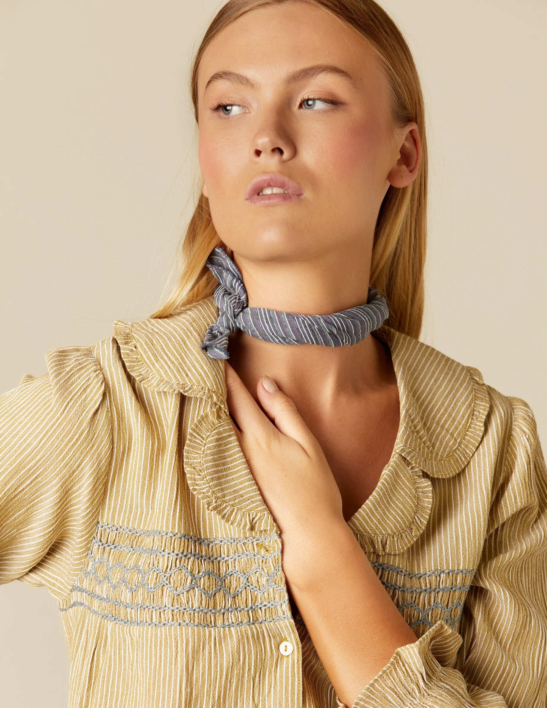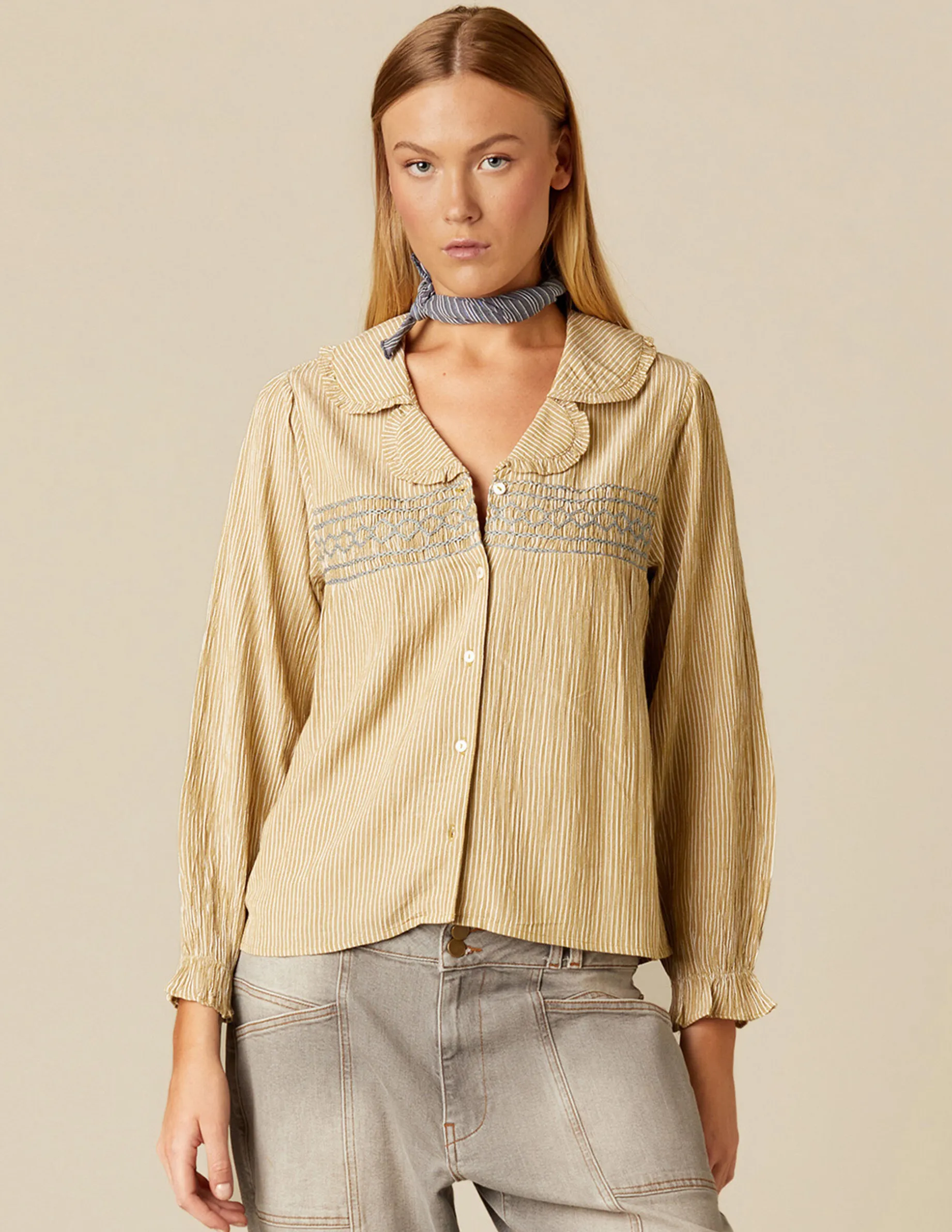 Camisa de chica en tejido de rayas de algodón. Patrón con cuello grande, manga larga y cierre delantero con botones. Detalle de nidos en la zona del peco.