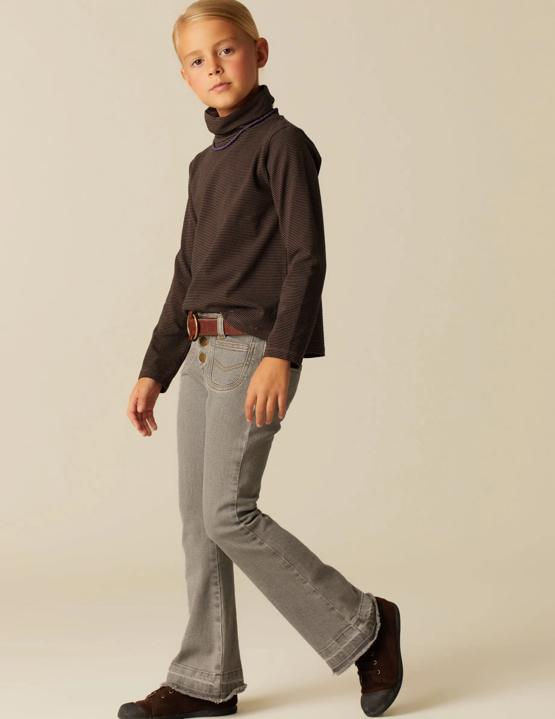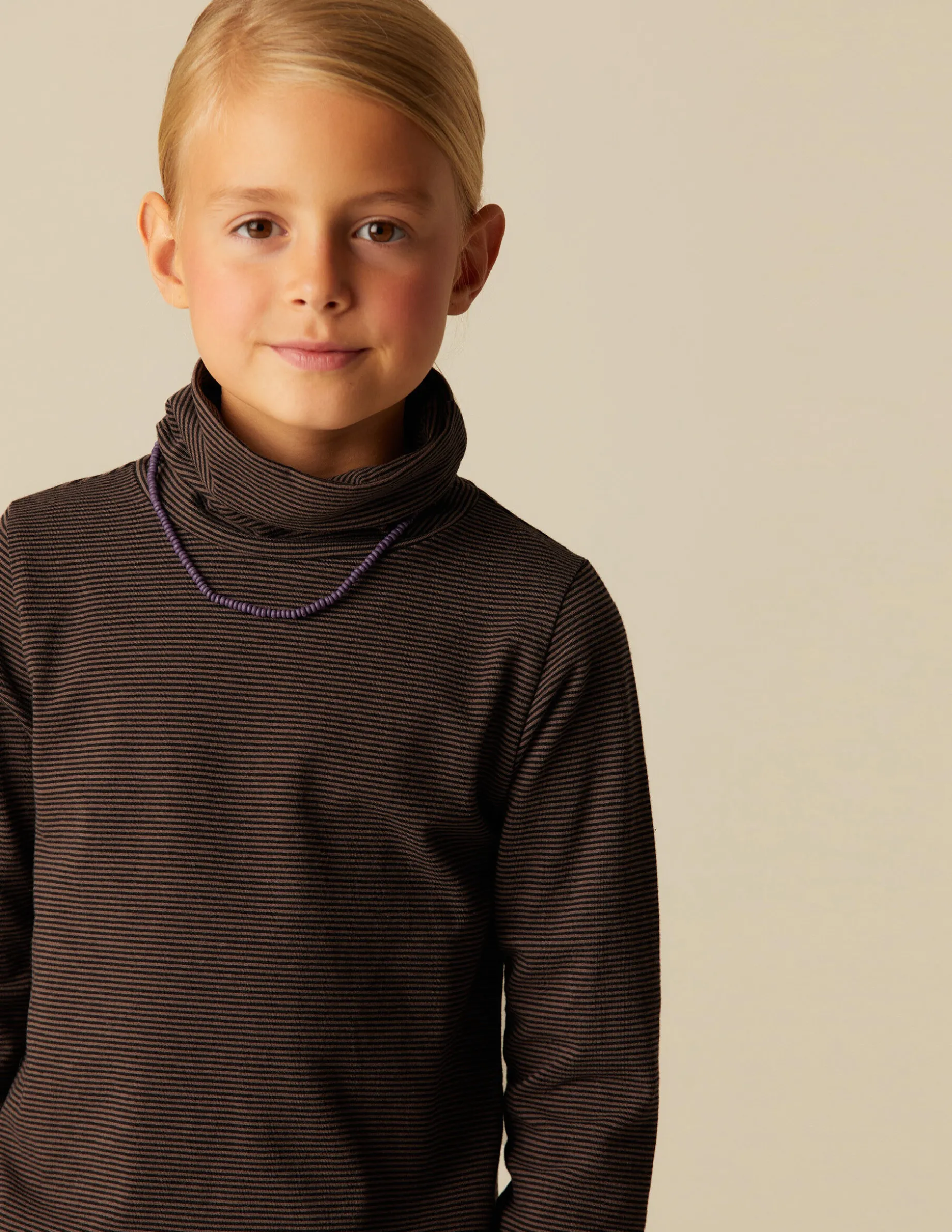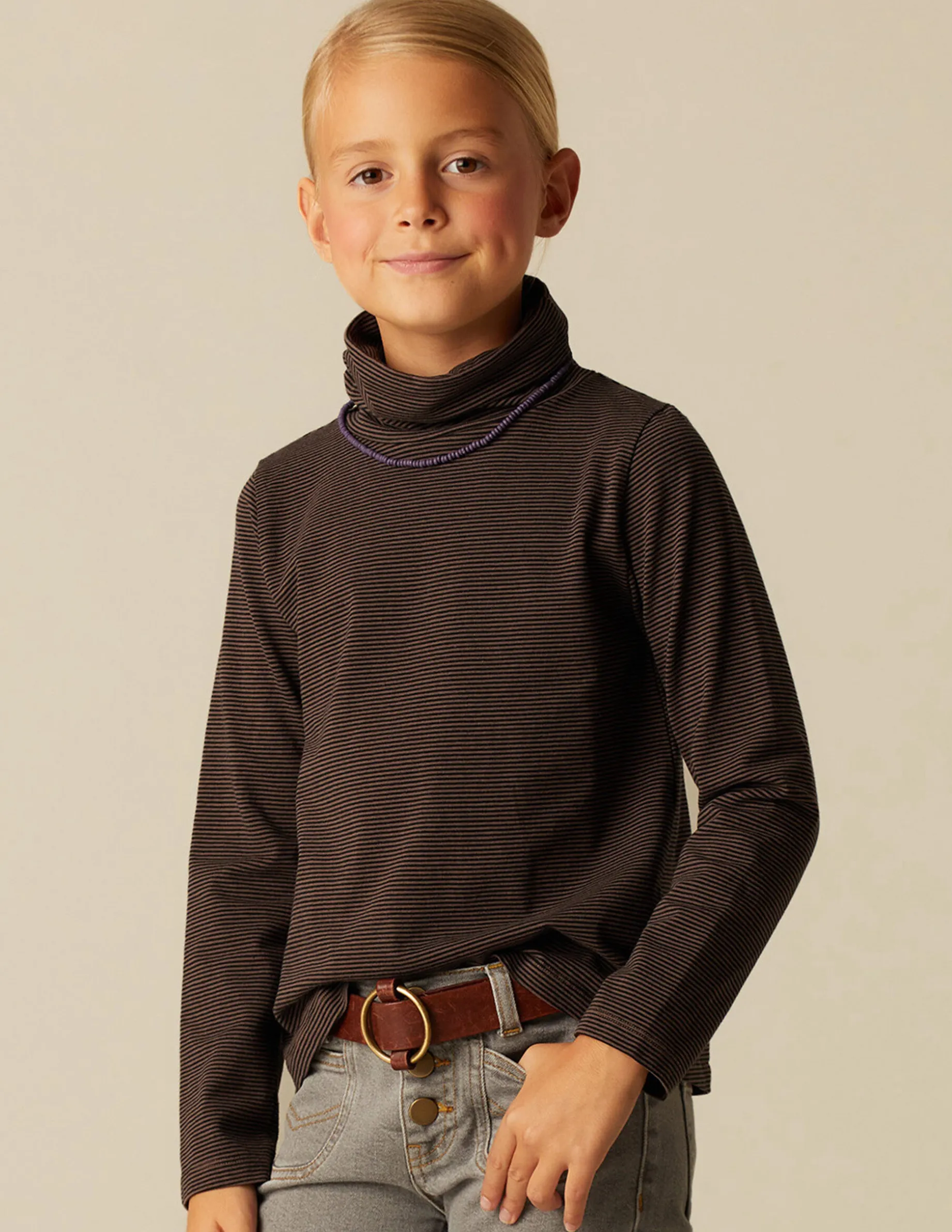 Camiseta benéfica de rayas, de niña. Patrón con cuello vuelto y manga larga.