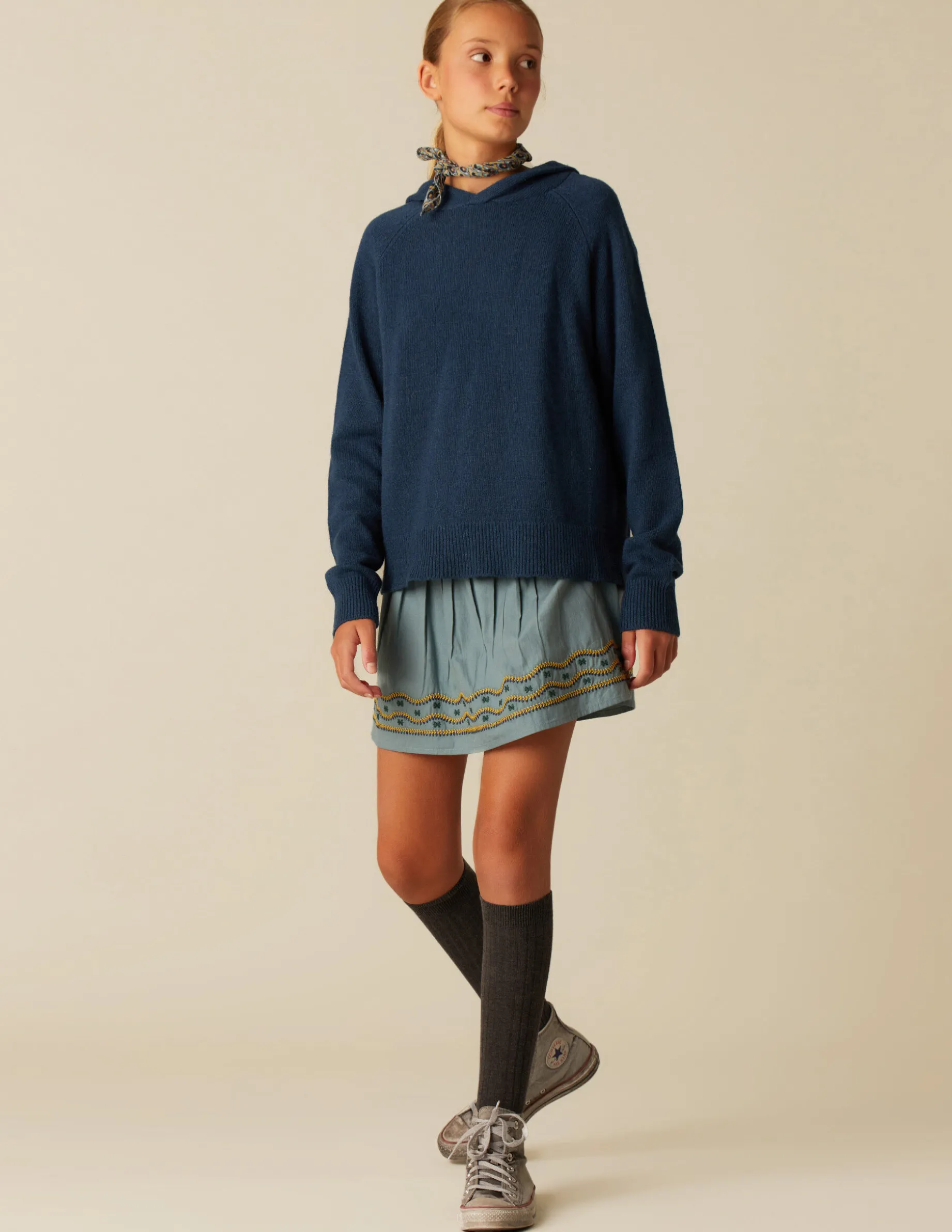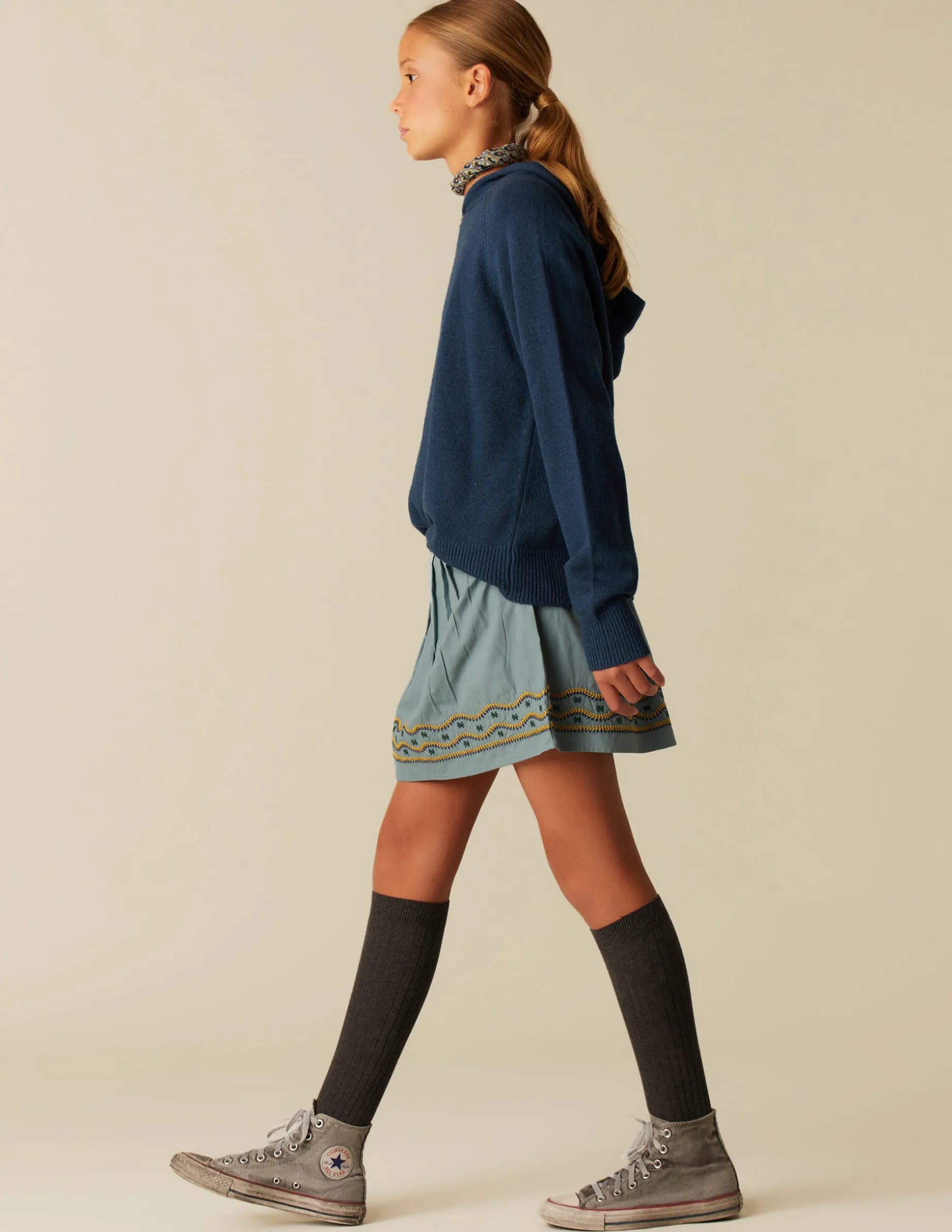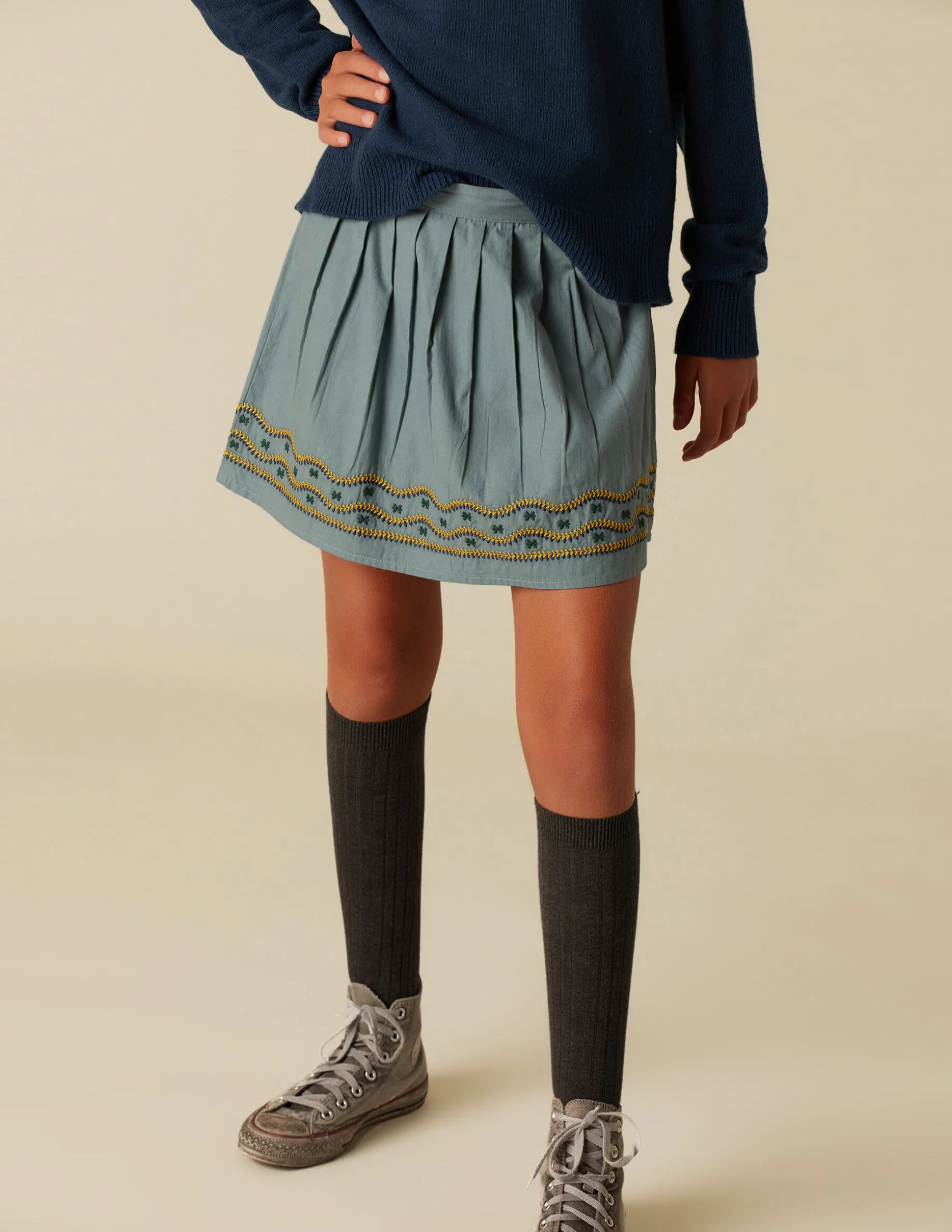 Falda corta de teen, en algodón en colorido de la colección, con detalle de bordados. Patrón con cierre lateral con botón, ajustable con lazo.