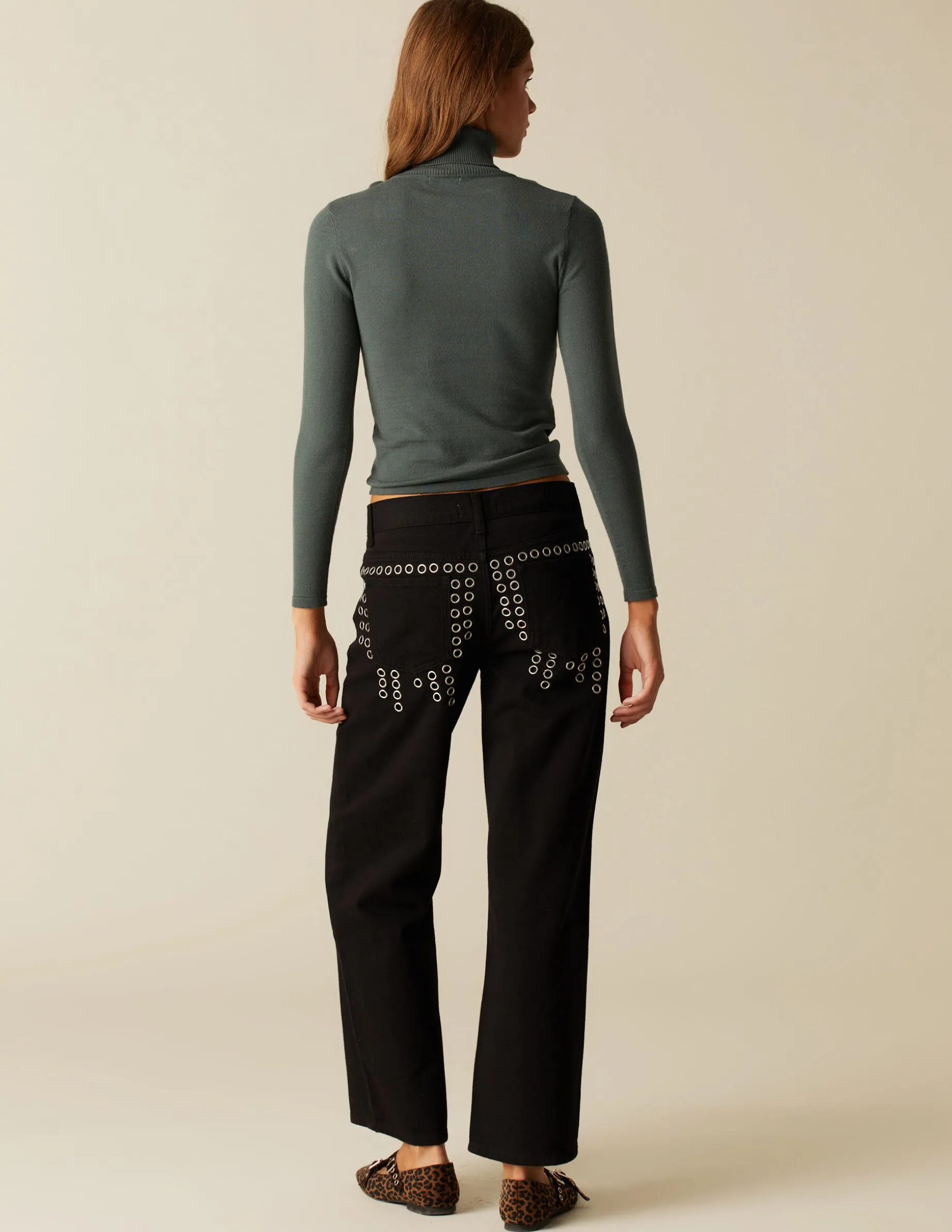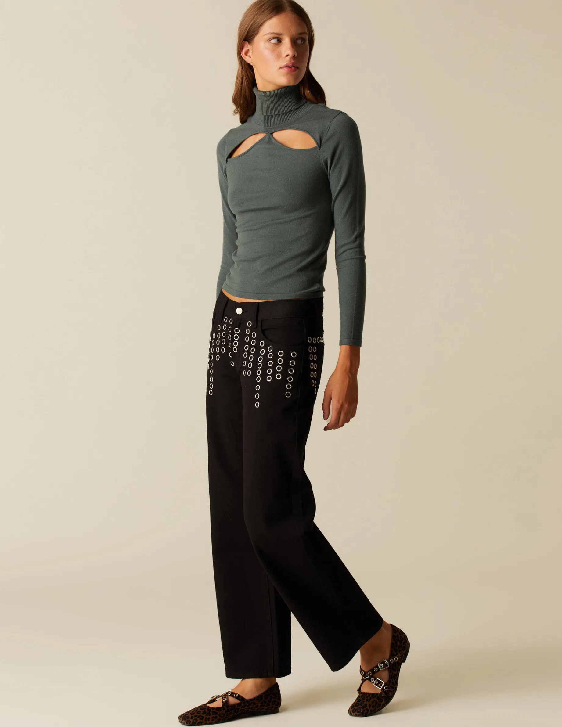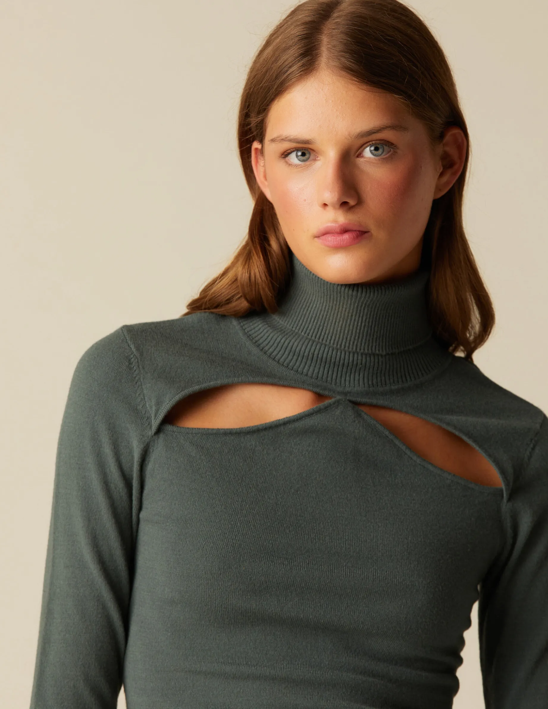 Top de manga larga con cuello vuelto y abertura en el delantero en color verde.