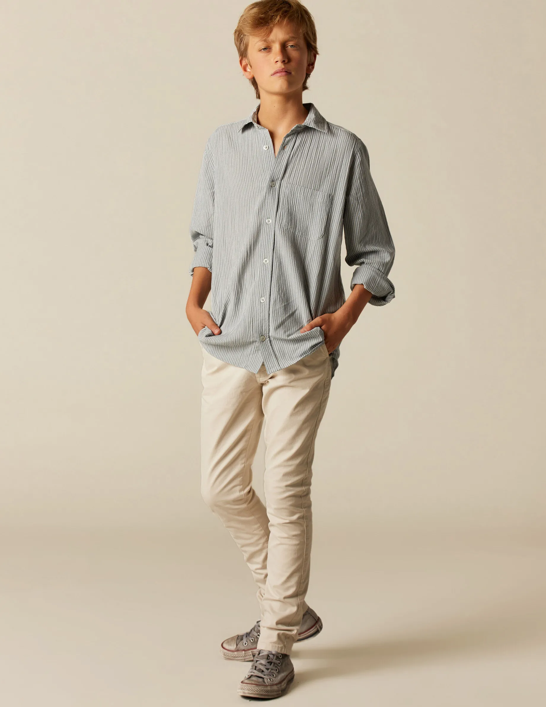Camisa de teen o, en tejido de algodón de rayas. Patrón cuello pico y manga larga rematada en puño.