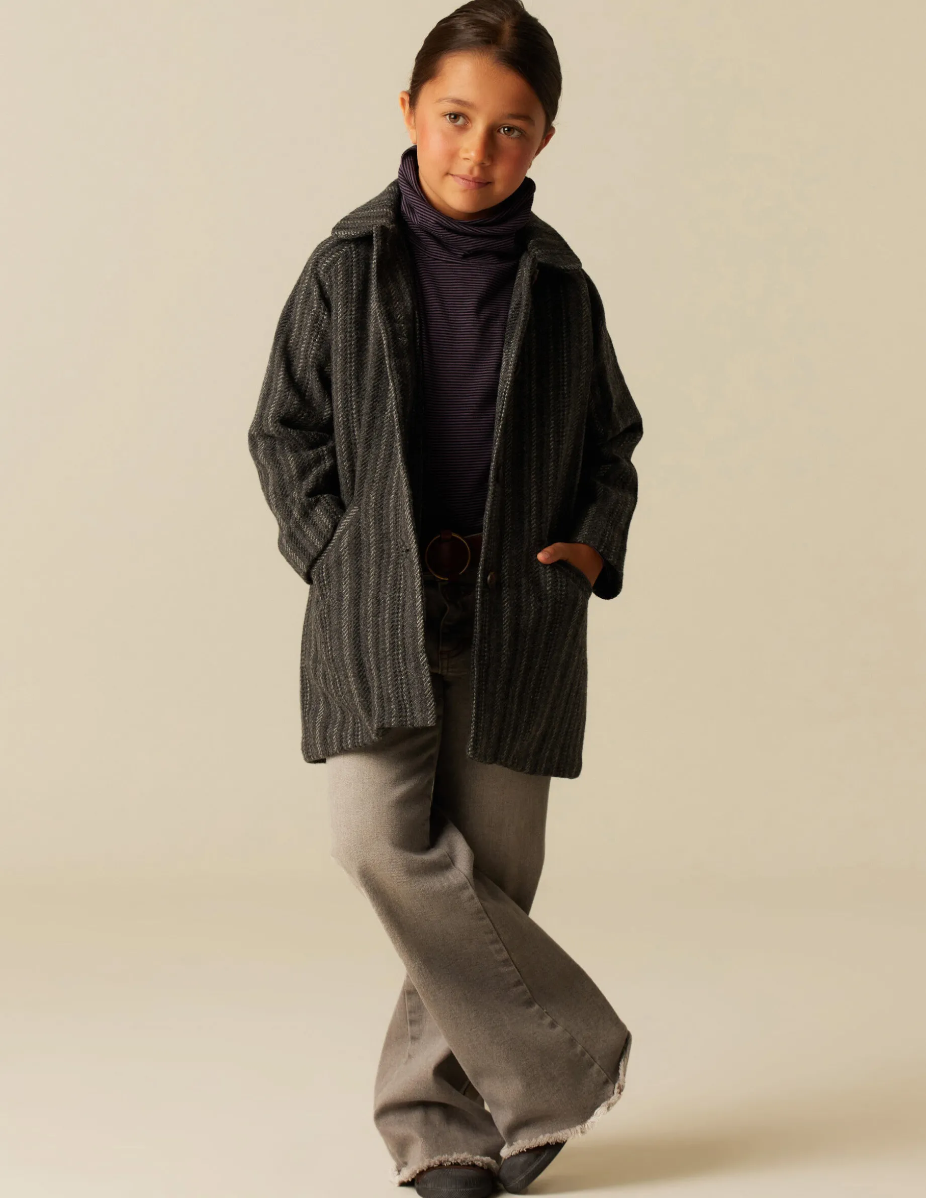 Abrigo cuello redondo en tejido de rayas grises. Cierre con doble botonadura en delantero.