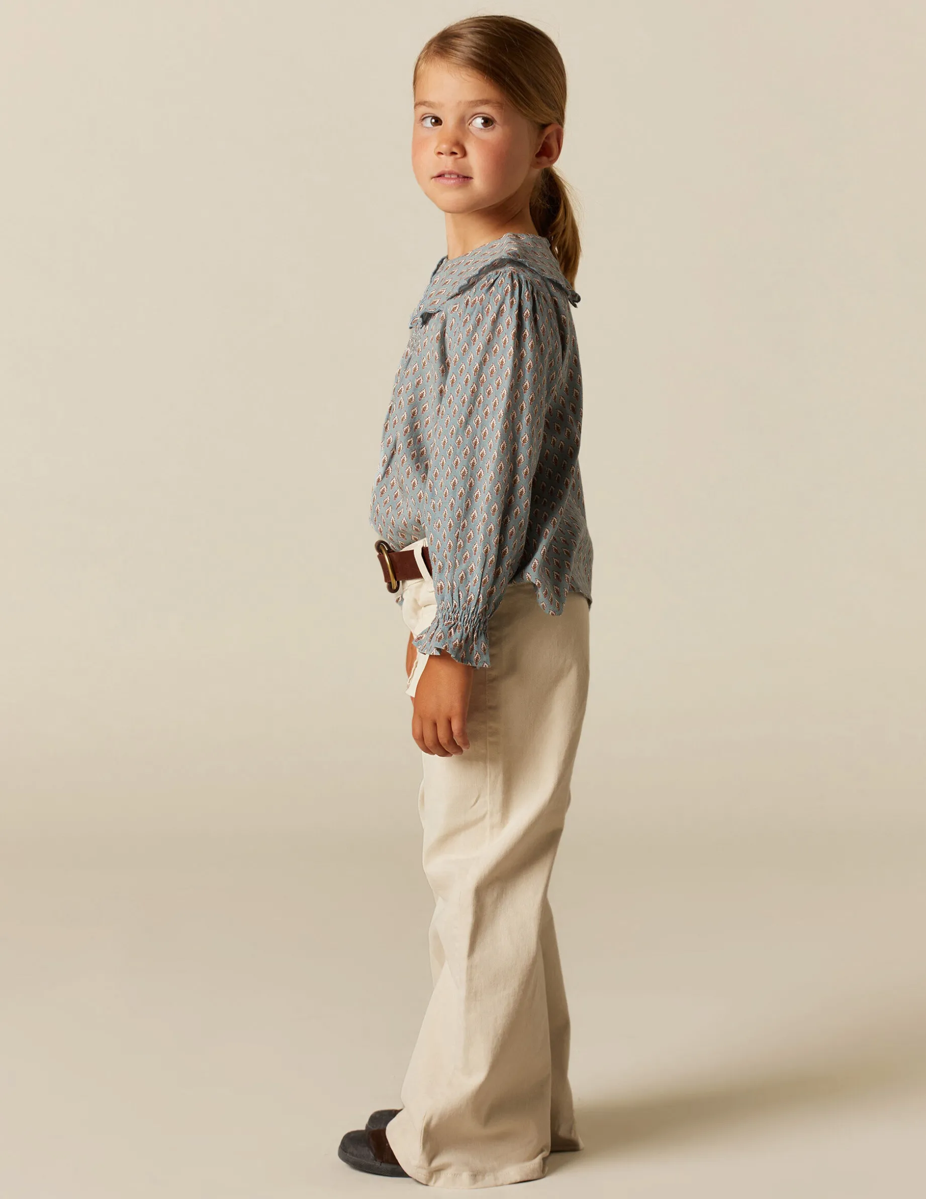 Camisa de niña, en print de la colección. Patrón con cuello XL, rematado con ondas a tono. Manga larga.
