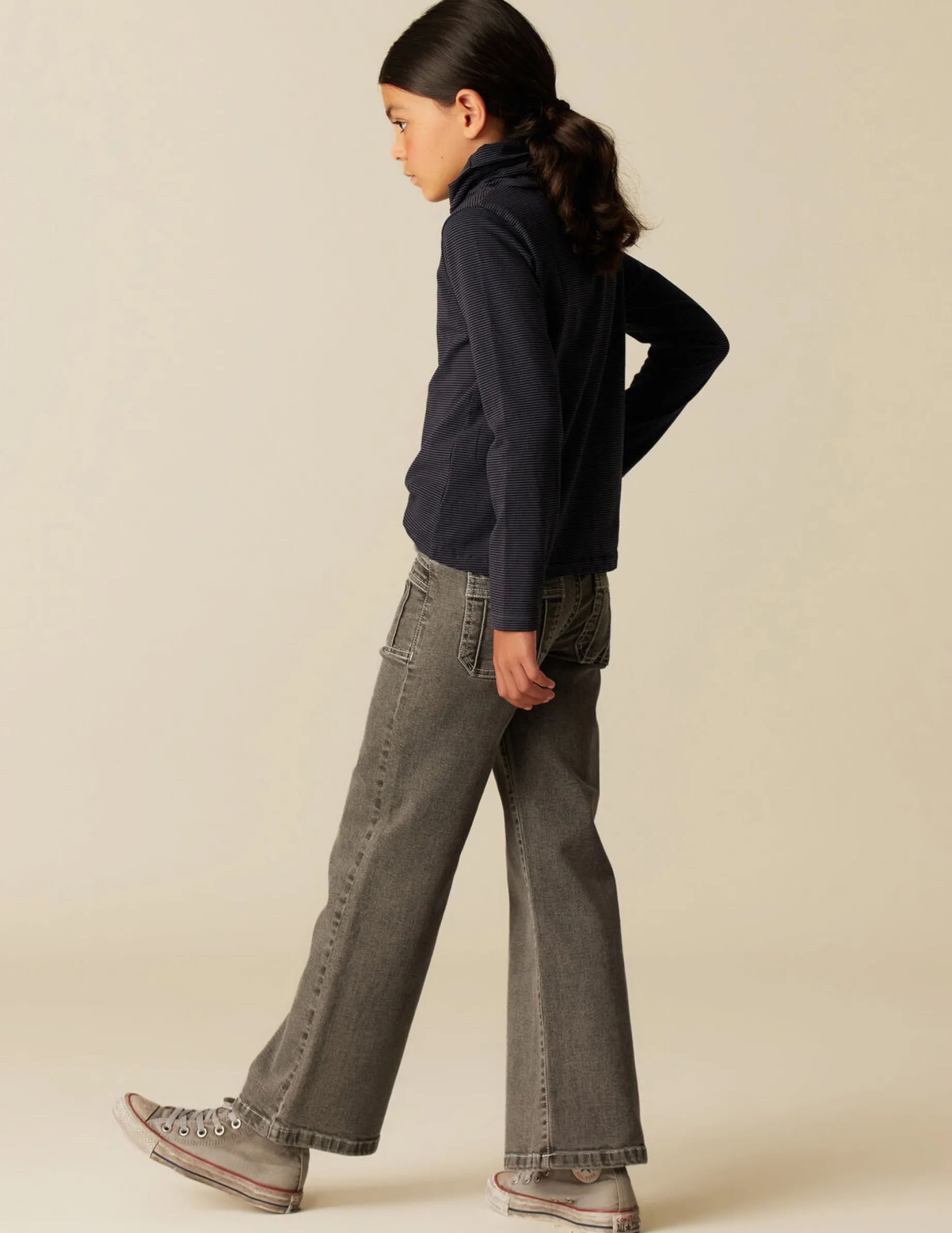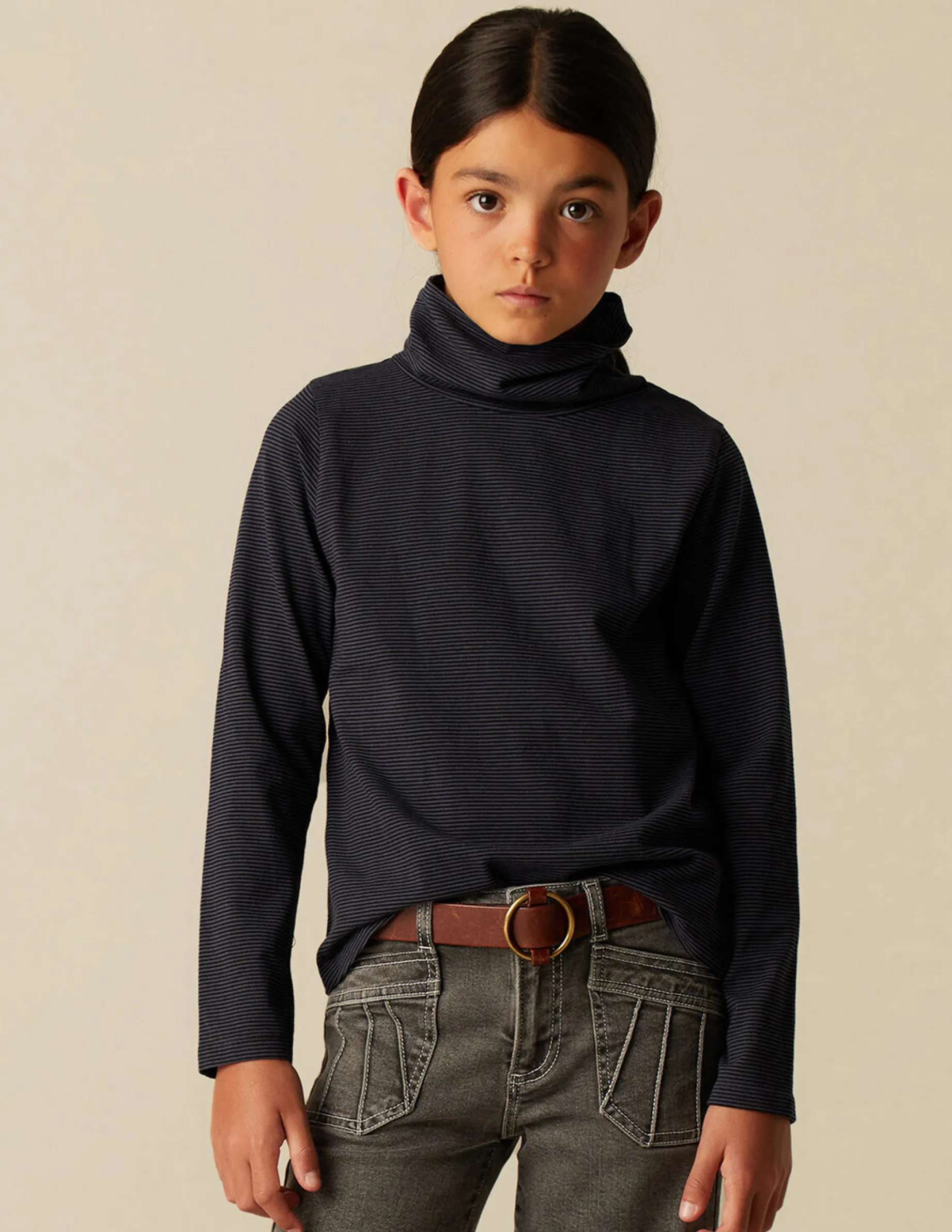 Camiseta benéfica de rayas, de niña. Patrón con cuello vuelto y manga larga.