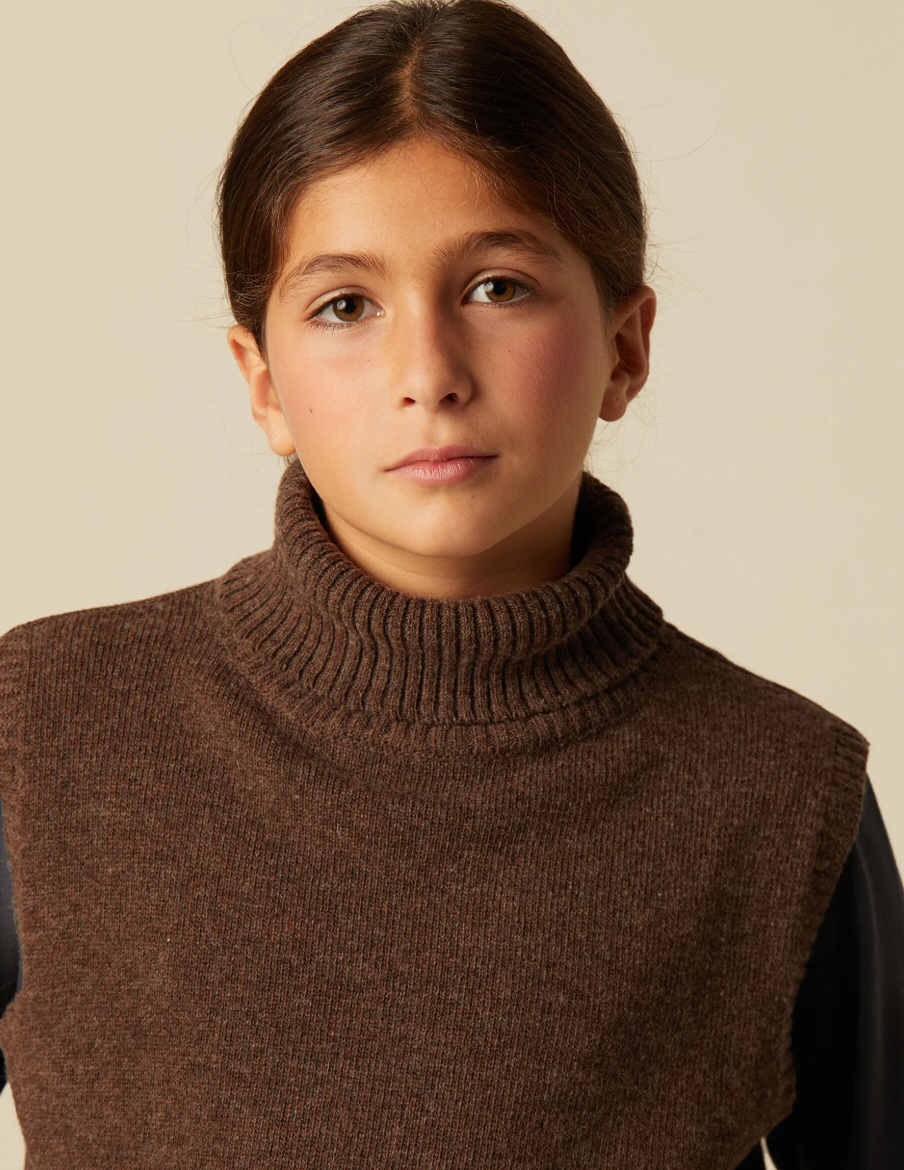 Chaleco de cuello vuelto en punto marrón oscuro.