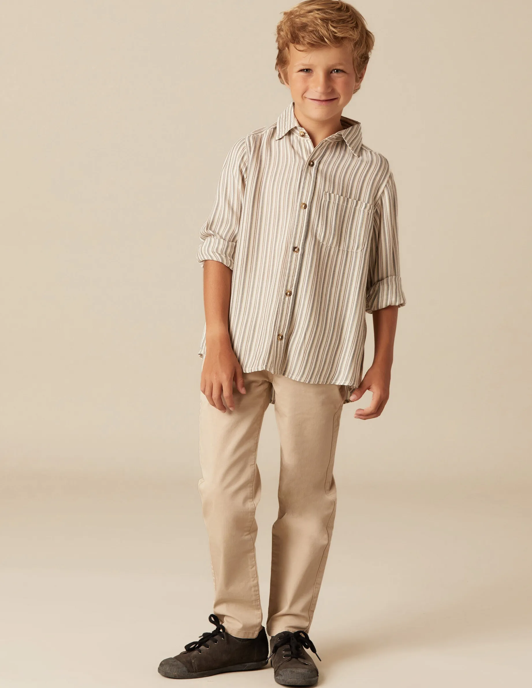 Pantalón chino largo de algodón lavado. Bolsillos frontales y detalle de bolsillos de vivo en espalda. Cierre con cremallera y botón.