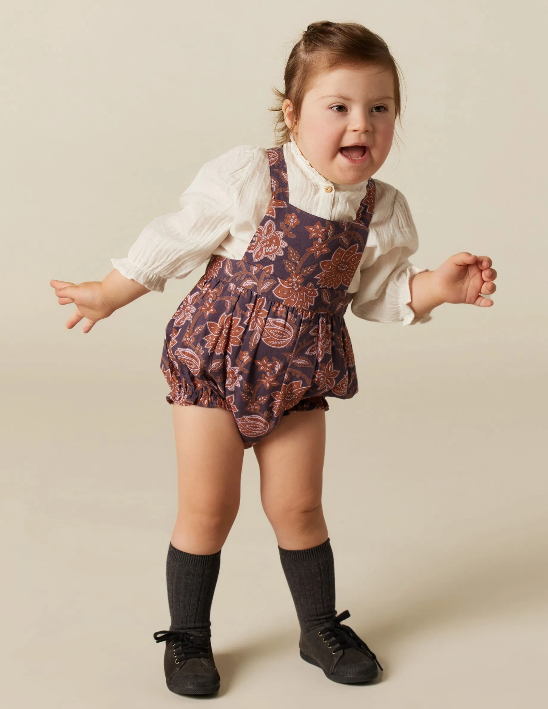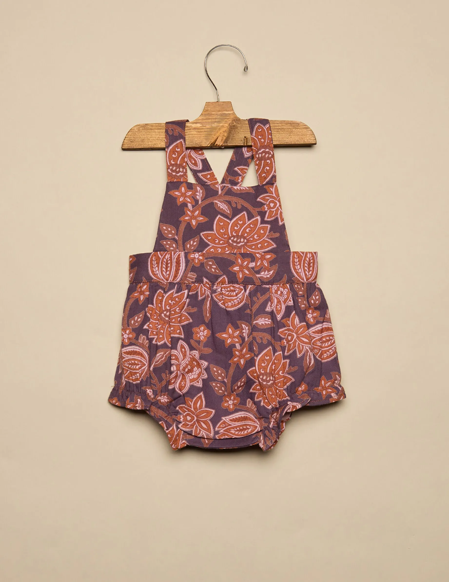 Ranita de bebé en print de la colección. Patrón con tirantes que se abrochan en la espalda y gomitas en las piernas.