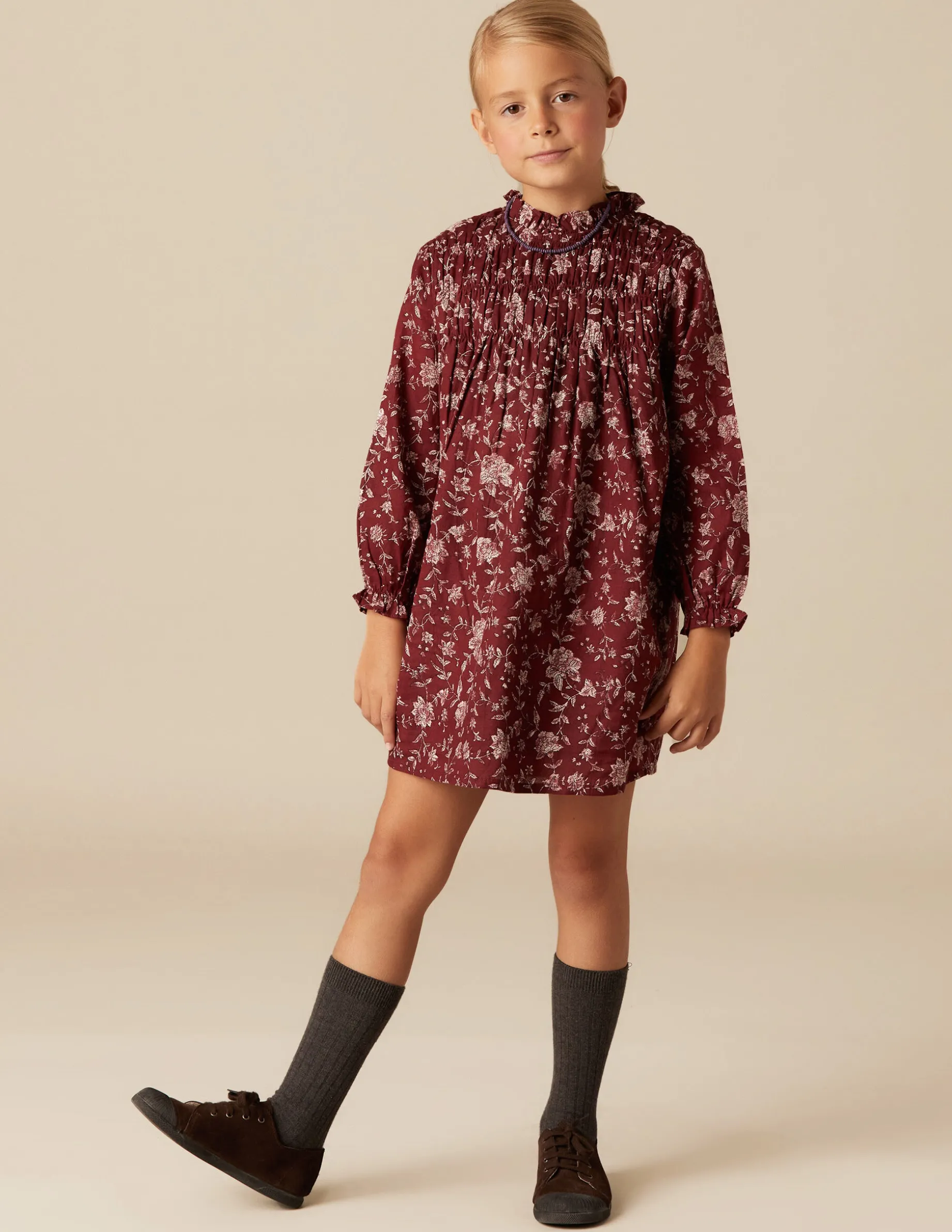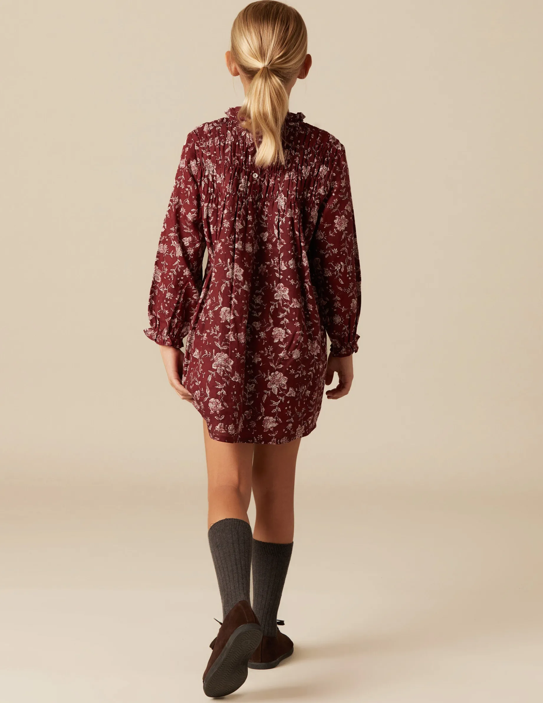 Vestido de niña en print de la colección. Patrón con manga larga, rematada en puño, cuello perkins y detalle de jaretas en la zona del pecho.