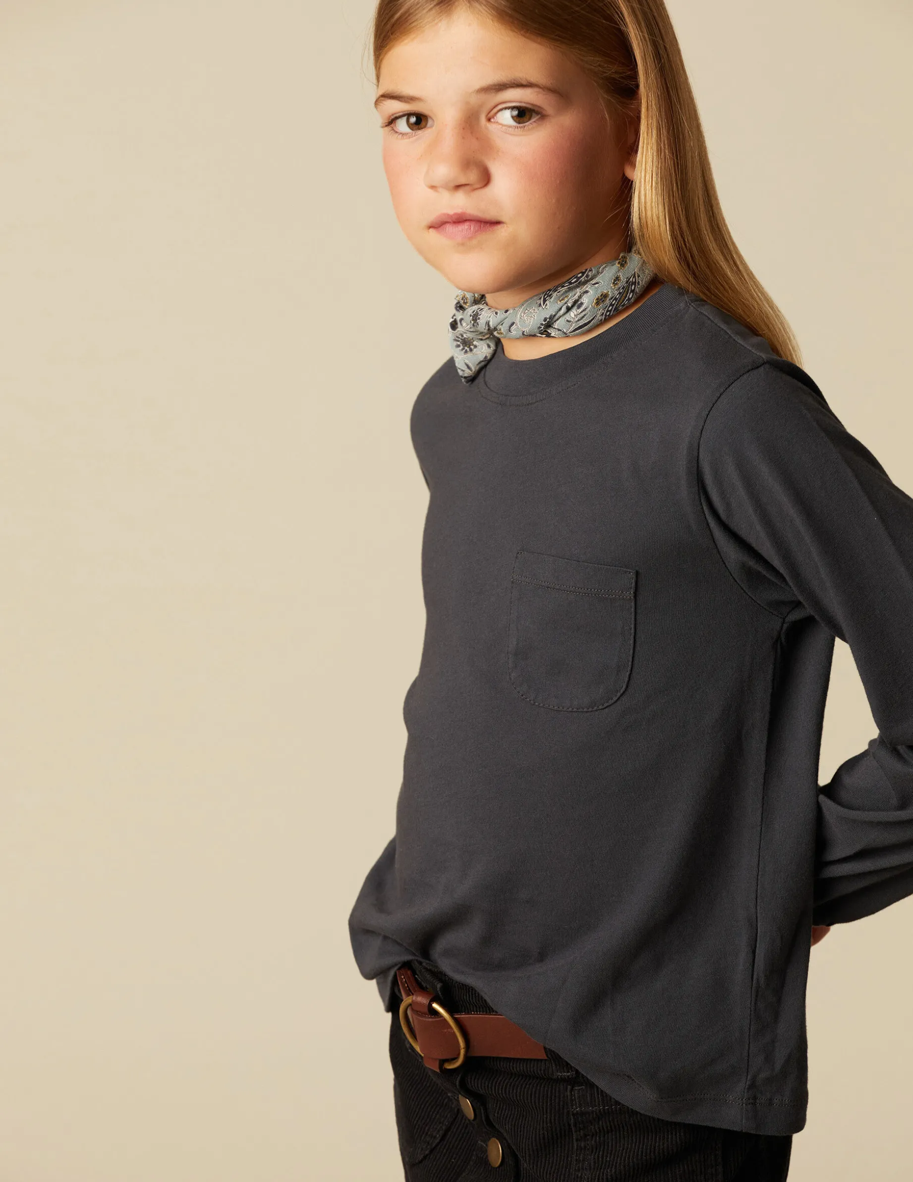 Camiseta básica de chica, patrón con cuello redondo y manga larga. Detalle de logo bordado en el bajo.