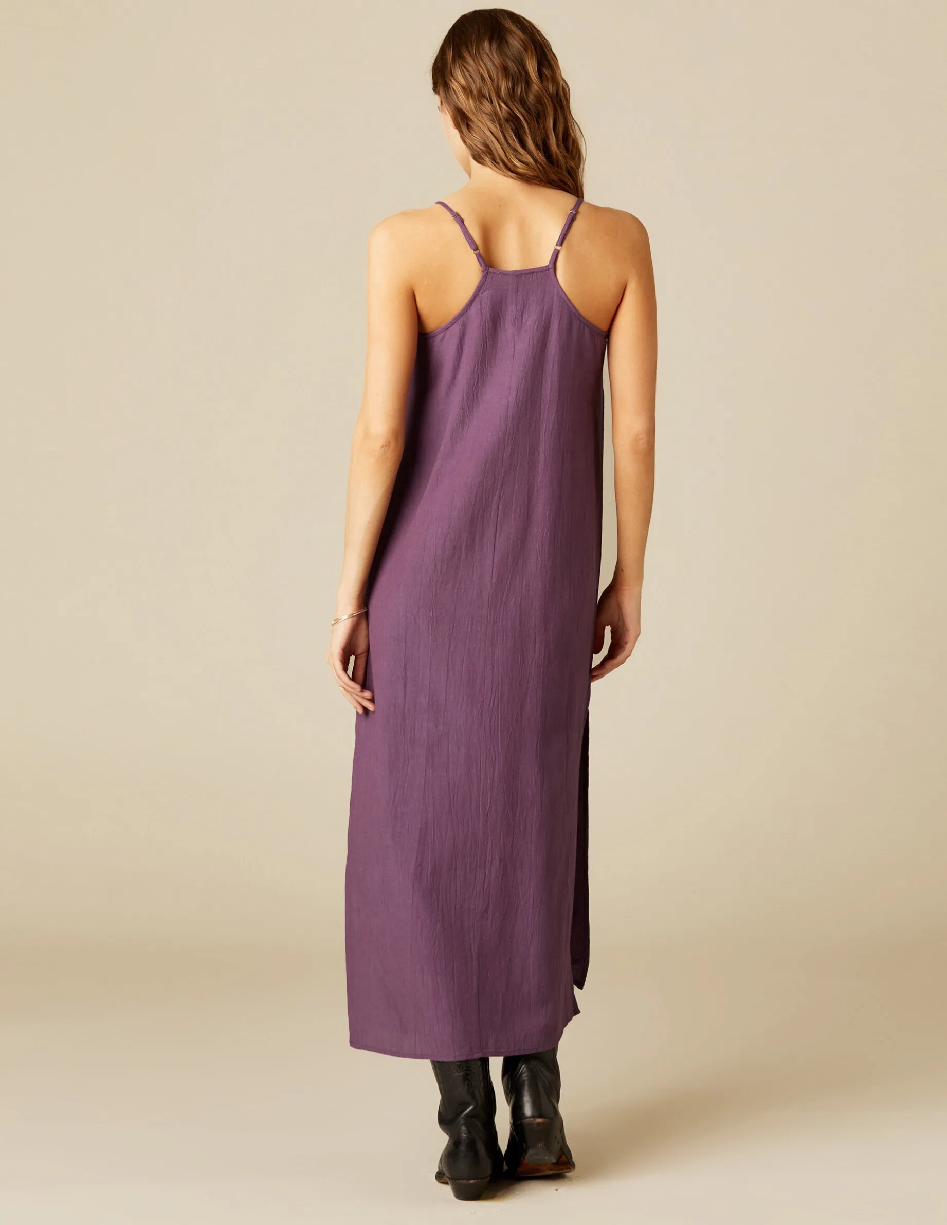 Vestido largo de chica, con detalle de bordados a contraste de color en la zona del pecho. Tirantes regulables y abertura lateral.