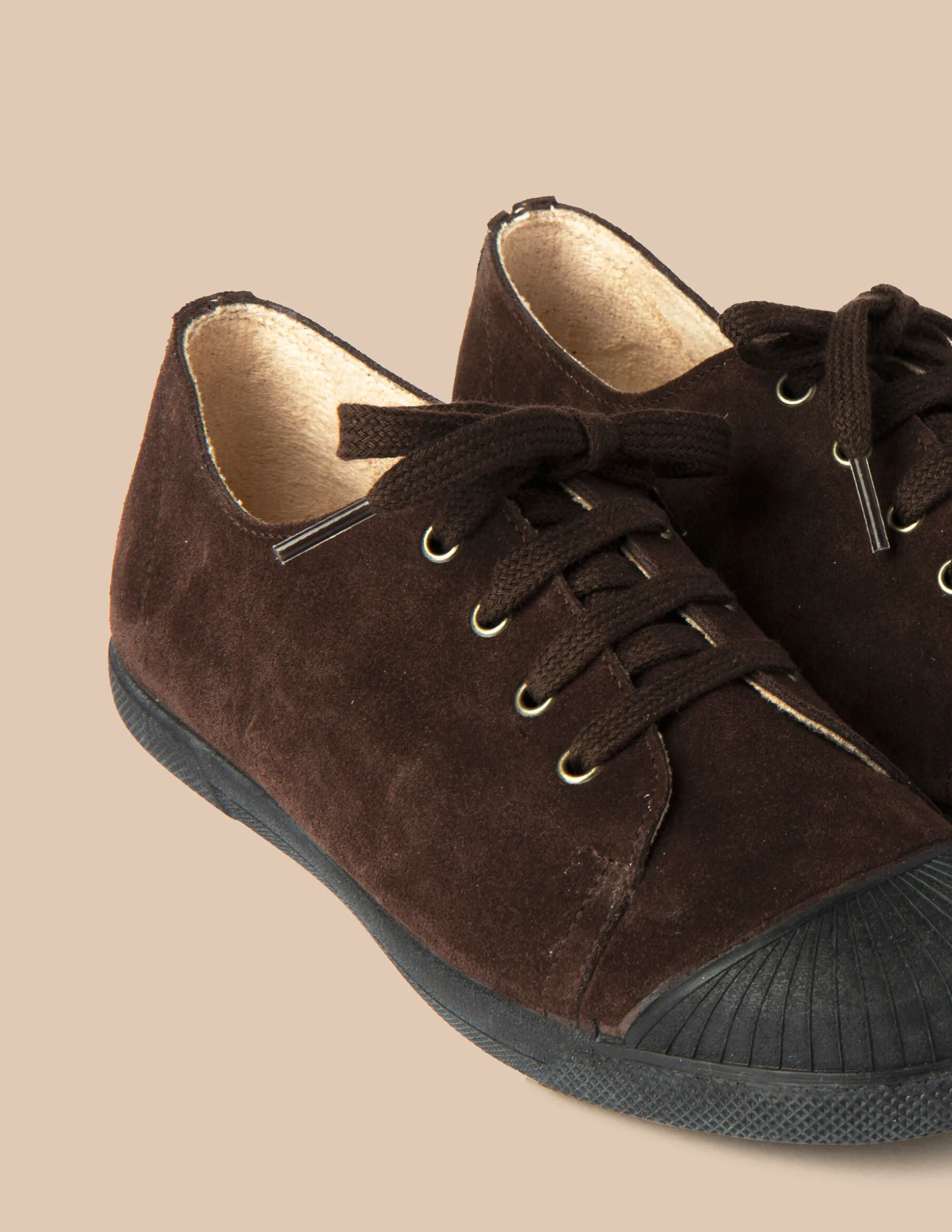 Zapatilla de teen de cordones. Piel de serraje y suela de goma.