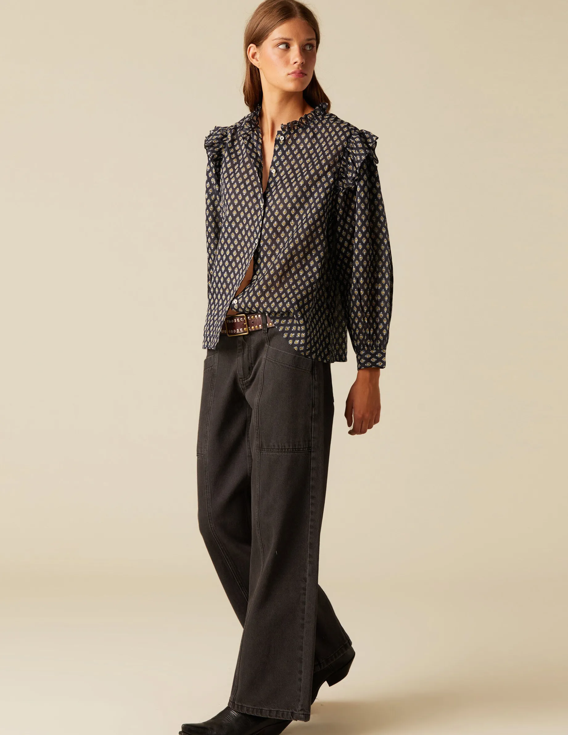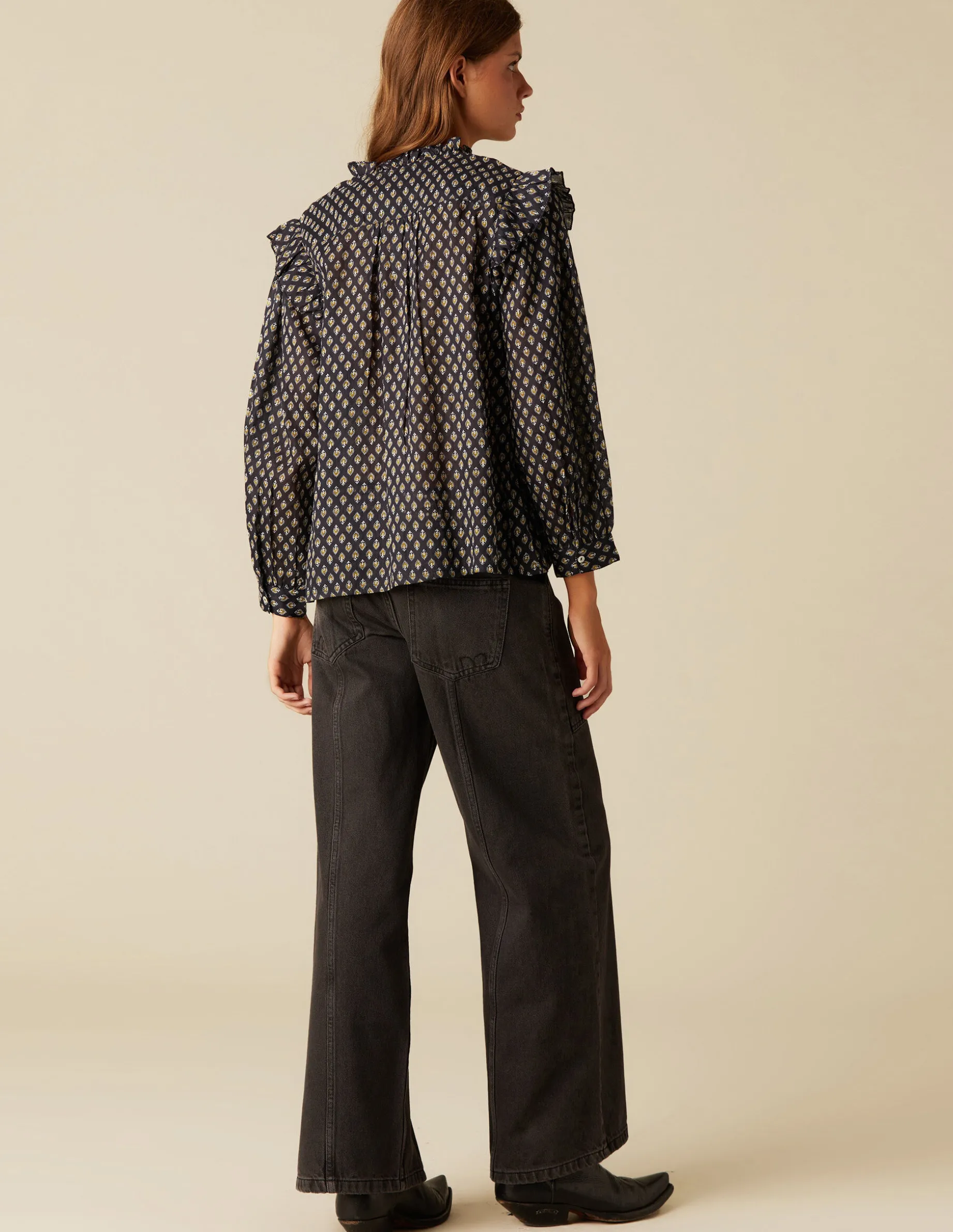 Camisa de chica, en print de la colección. Patrón con cuello perkins, manga larga rematada en puño volante. Cierre delantero con botones. Detalle de jaretas. Disponible en dos colores.