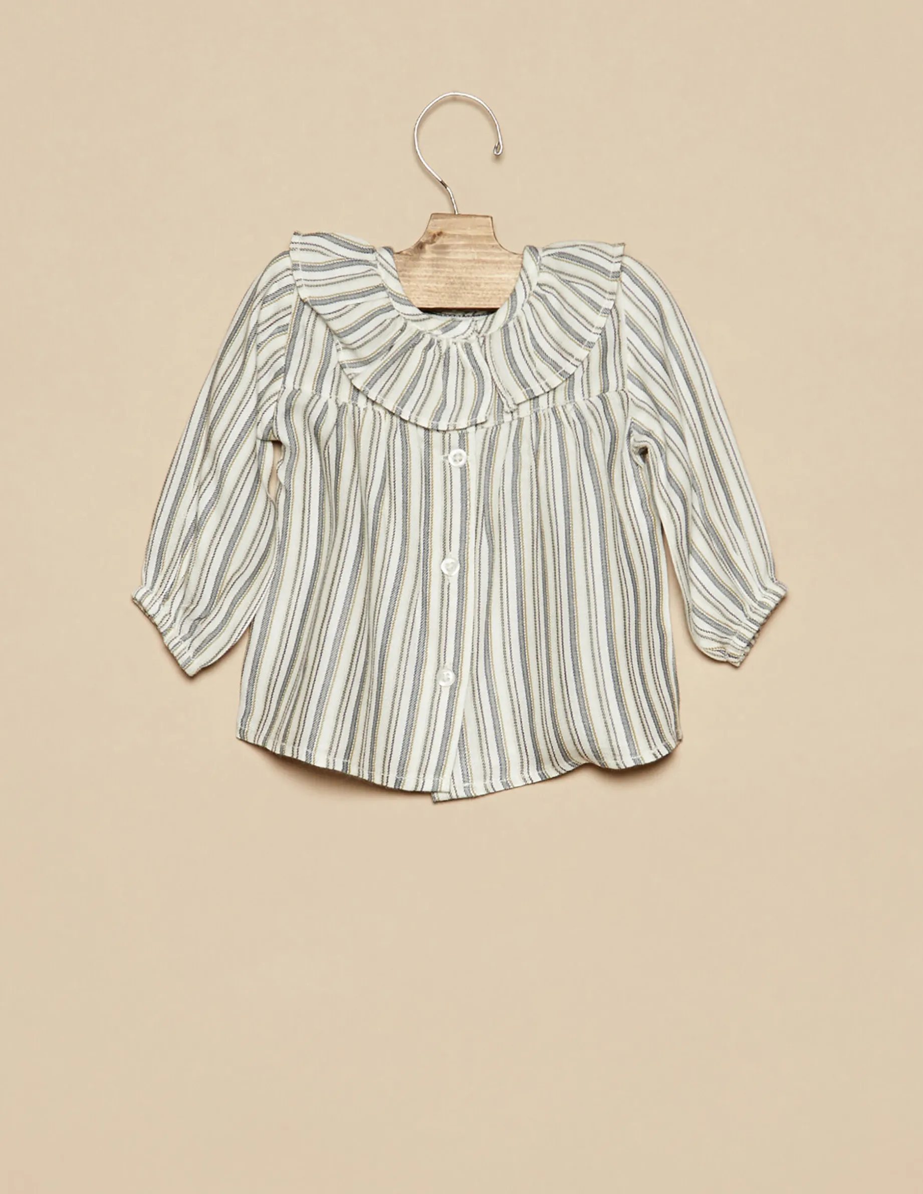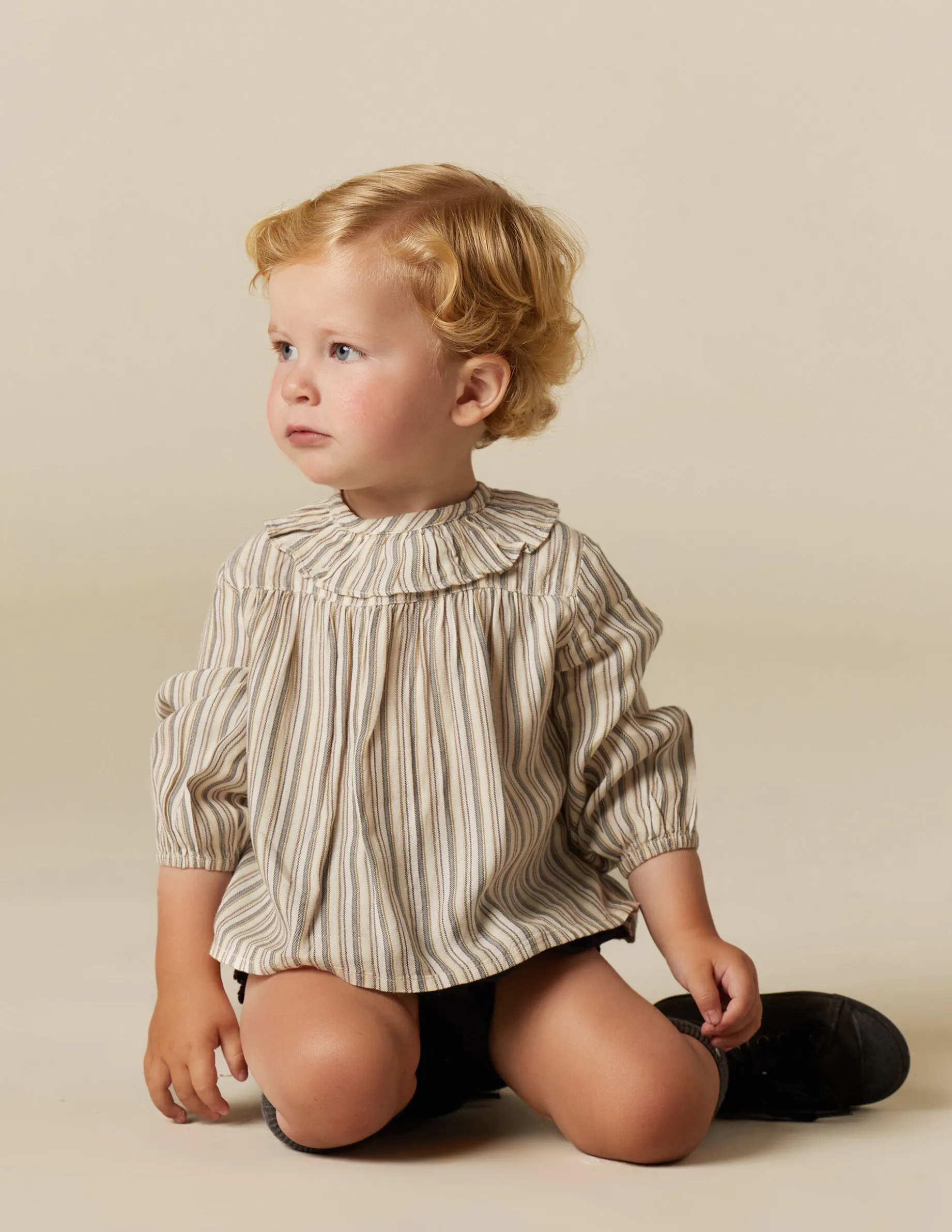 Camisa cruda de bebé, con rayas en colorido de la colección. Patrón con cuello volante, corte en el pecho y manga larga.