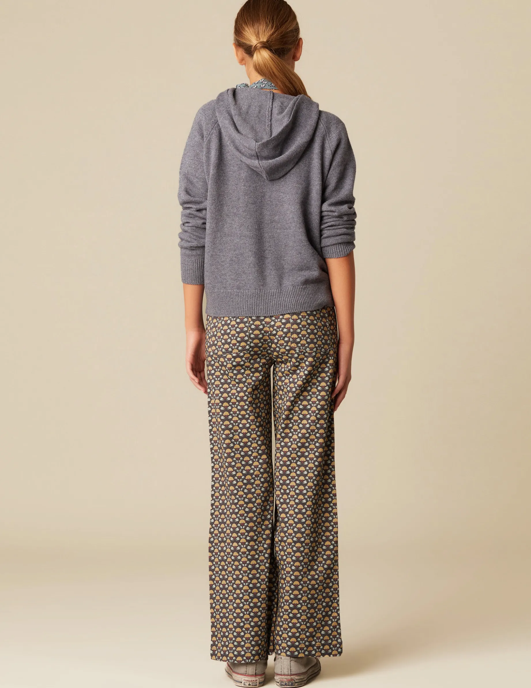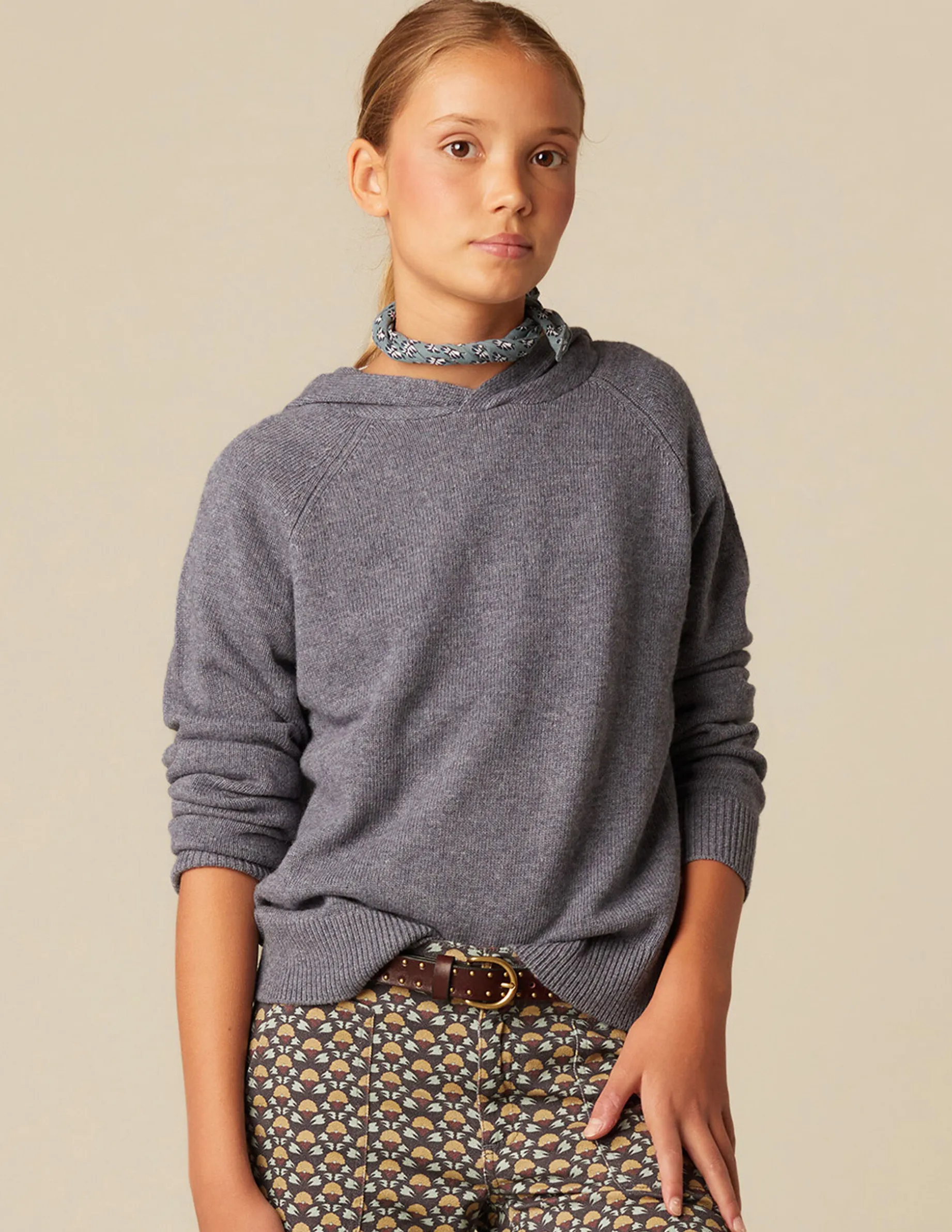 Jersey azul jaspeado con cuello cerrado. Detalle capucha.