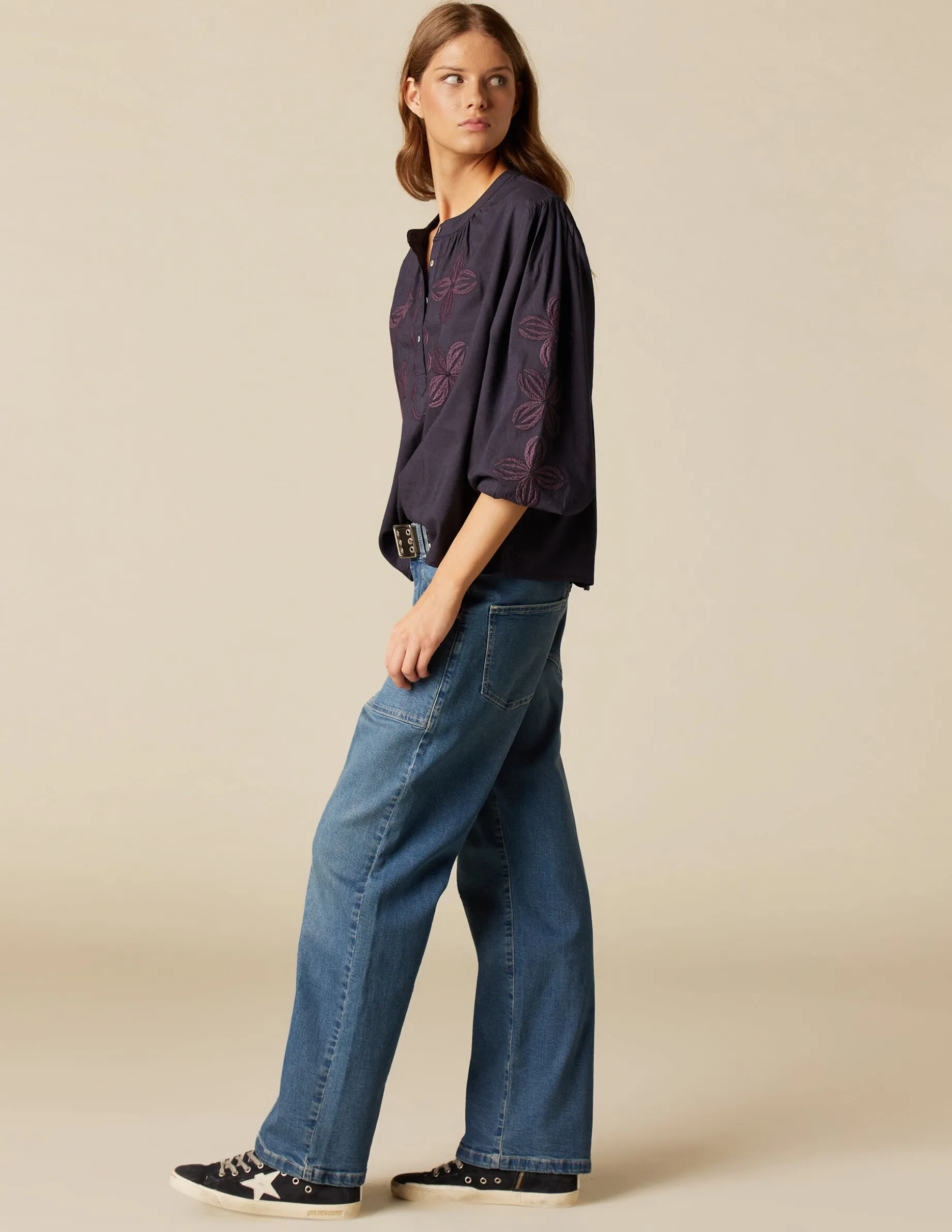 Camisa de chica, en algodón en colorido de la colección, con detalle de bordados en contraste de color en la zona del pecho y mangas. Patrón con cuello mao y manga larga. Cierre delantero con botones hasta el pecho.