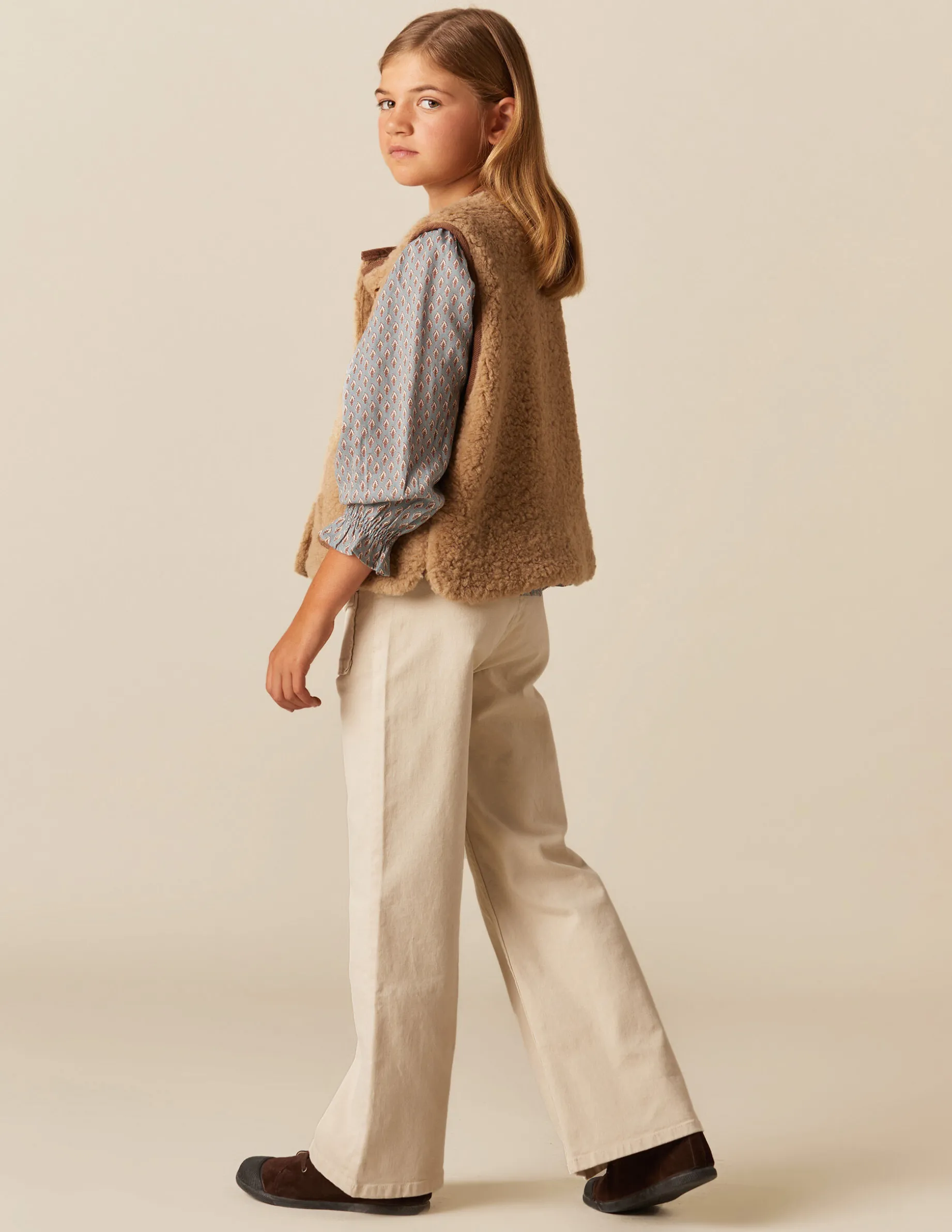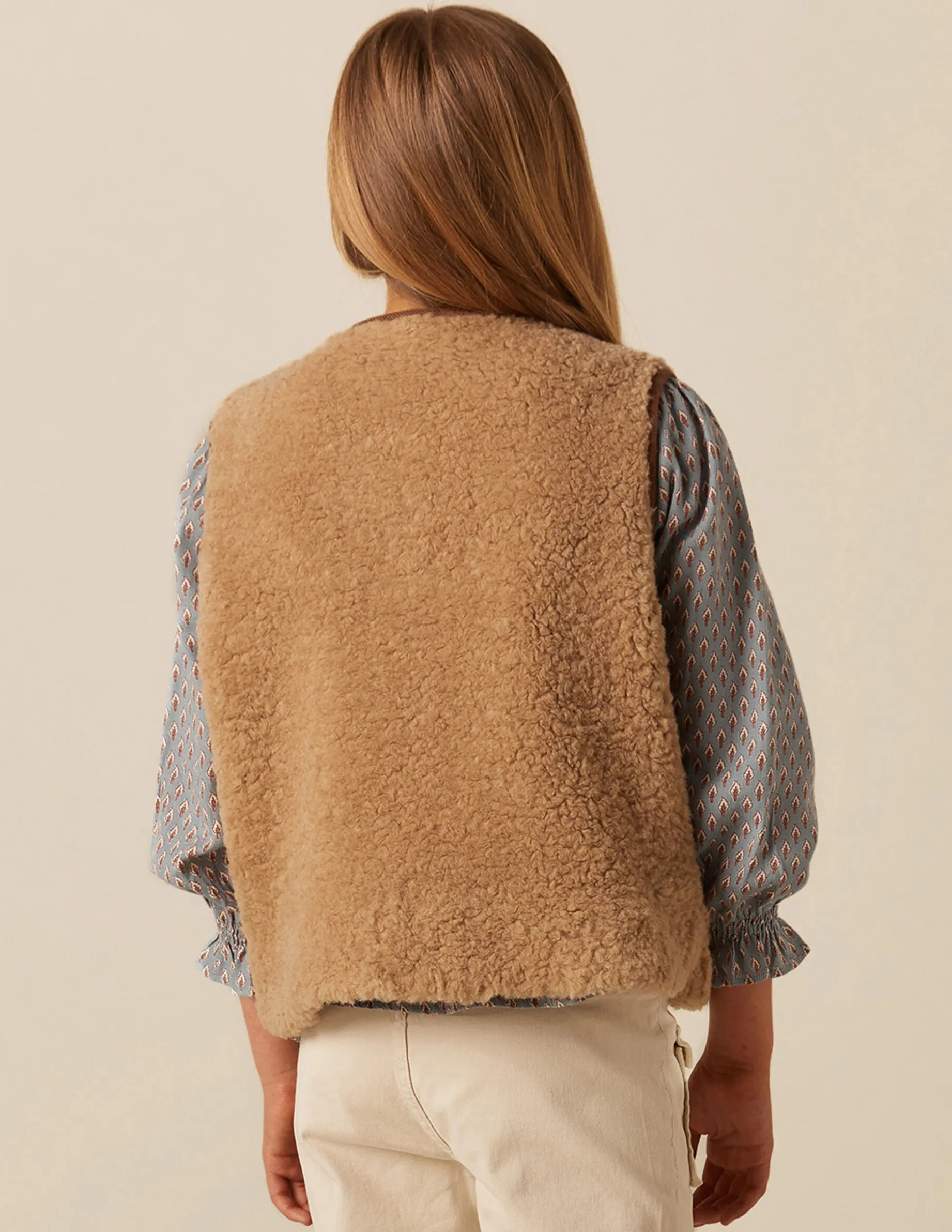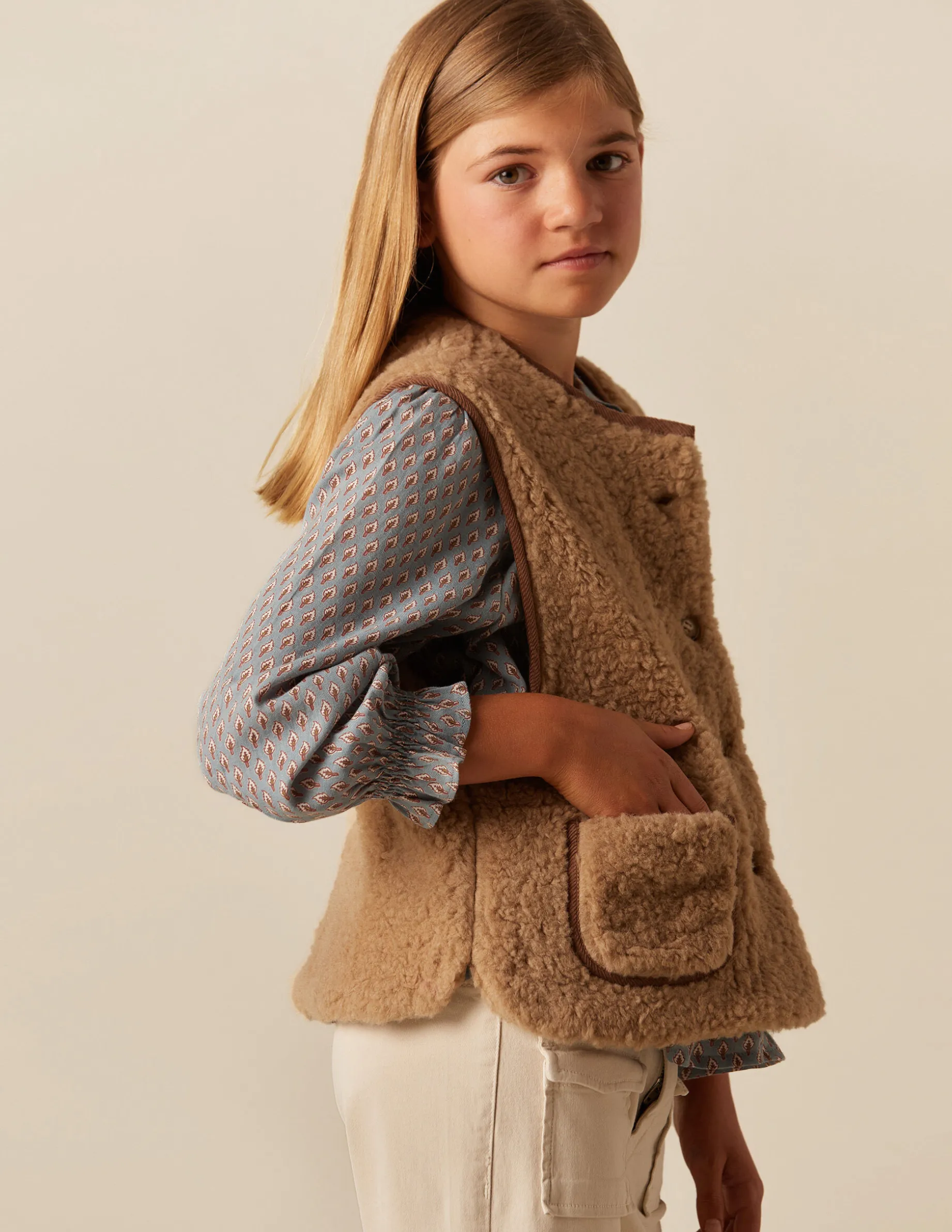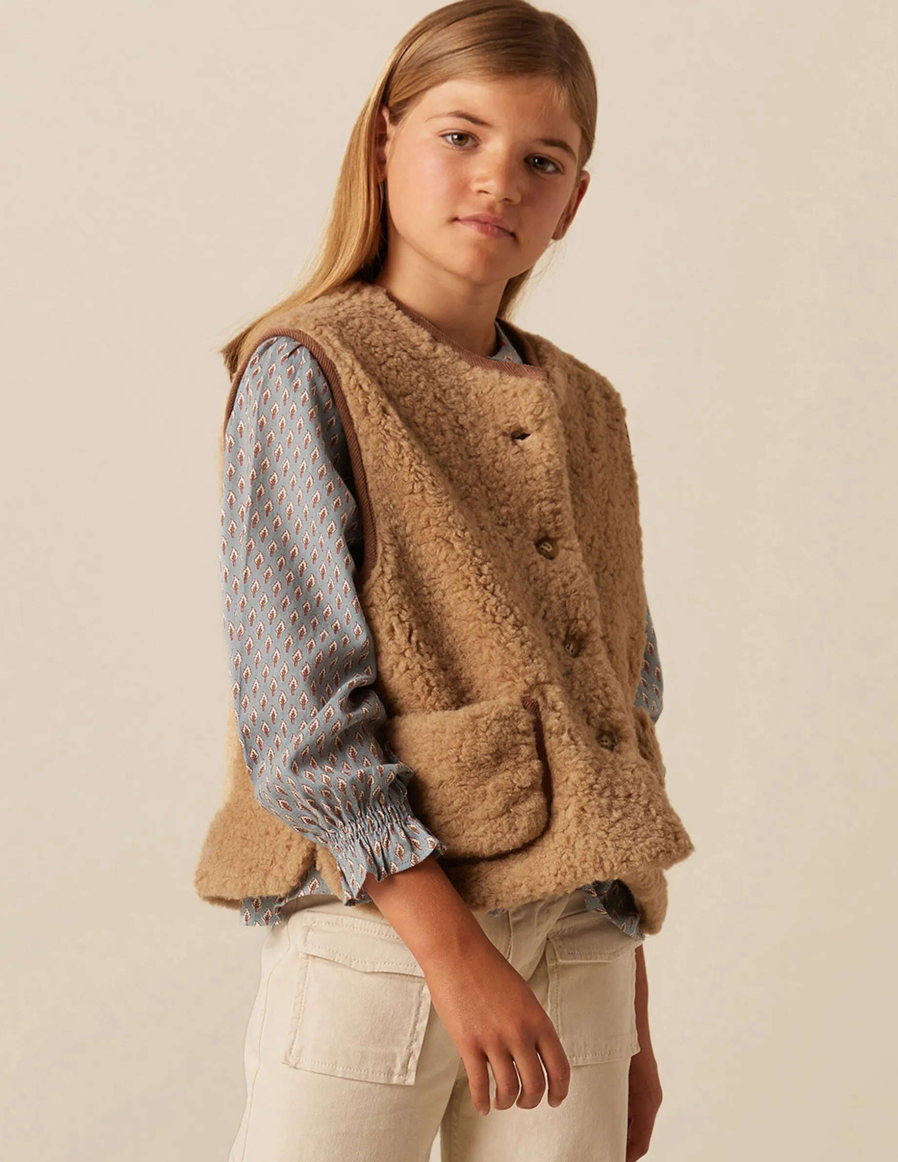 Chaleco de teen, en tejido efecto borrego, con detalle de vivo a contraste.