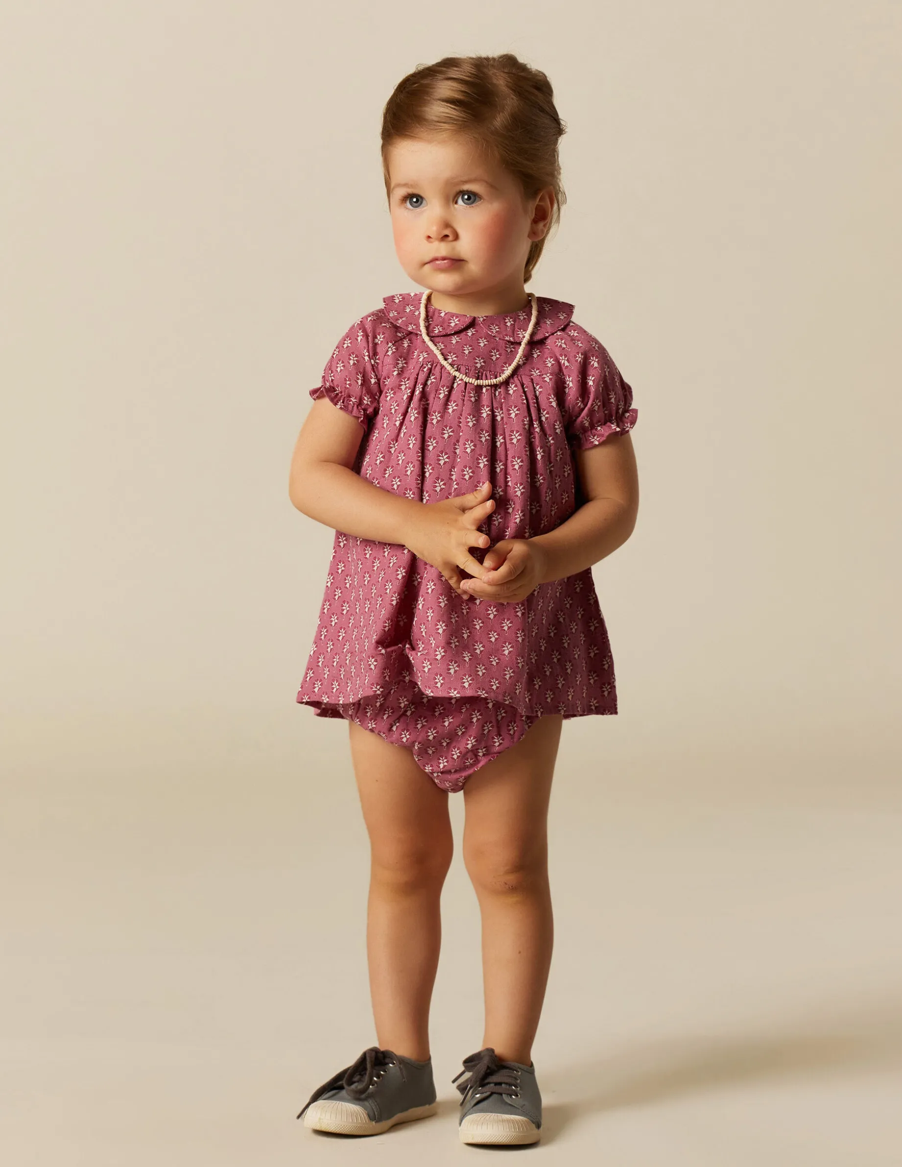 Vestido de bebé, en estampado de la colección, disponible en dos colores, con base de algodón. Patrón cuello lunitas y manga corta farol. Incluye un pololo para cubir el pañal. Disponible desde la talla 3/6M.