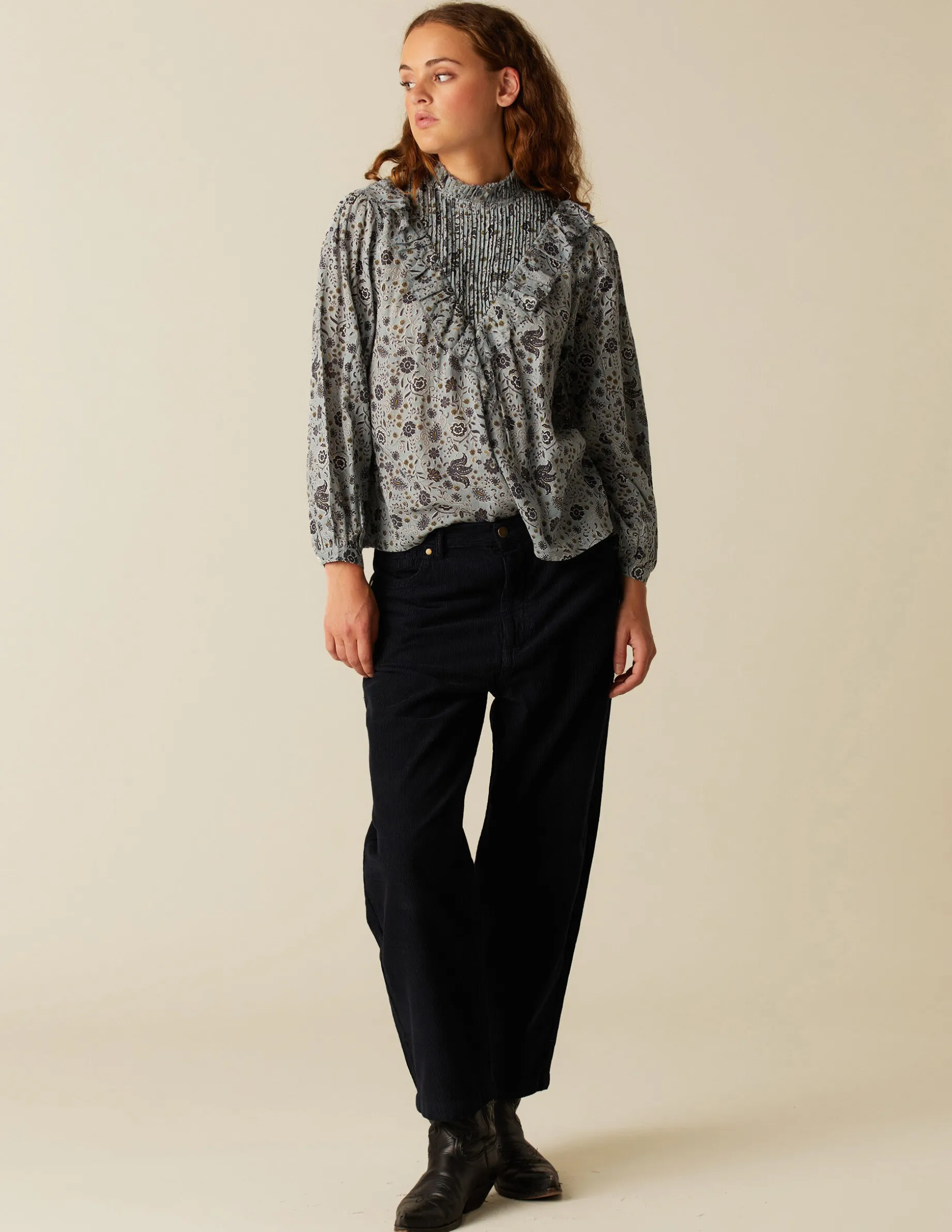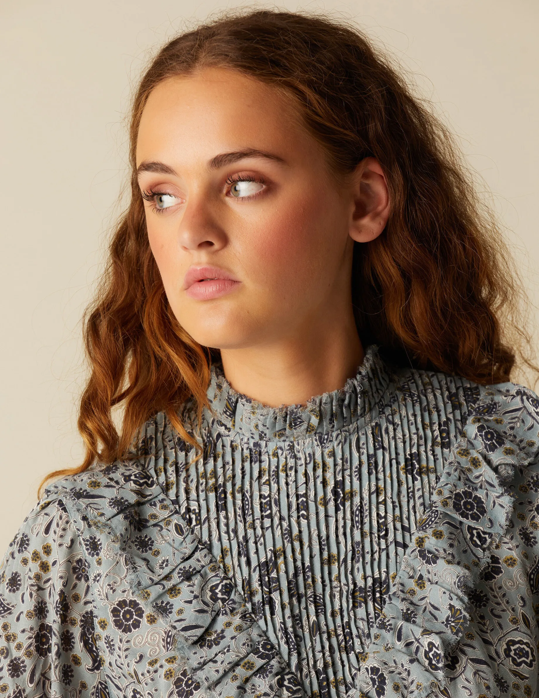 Camisa de chica, en estampado de la colección disponible en dos colores, en base de algodón. Patrón con cuello perkins, manga larga rematada en puño y detalle de jaretas en la zona del pecho.