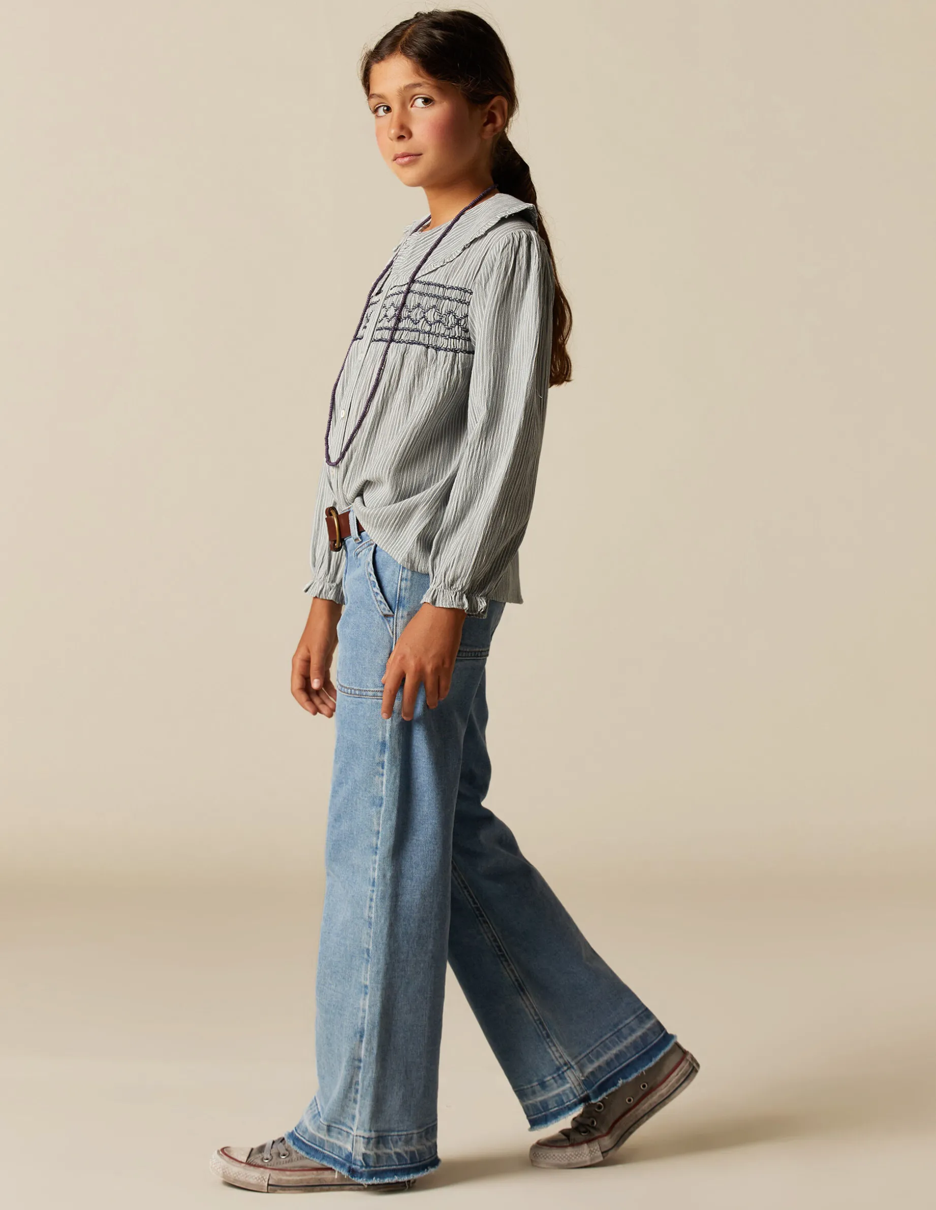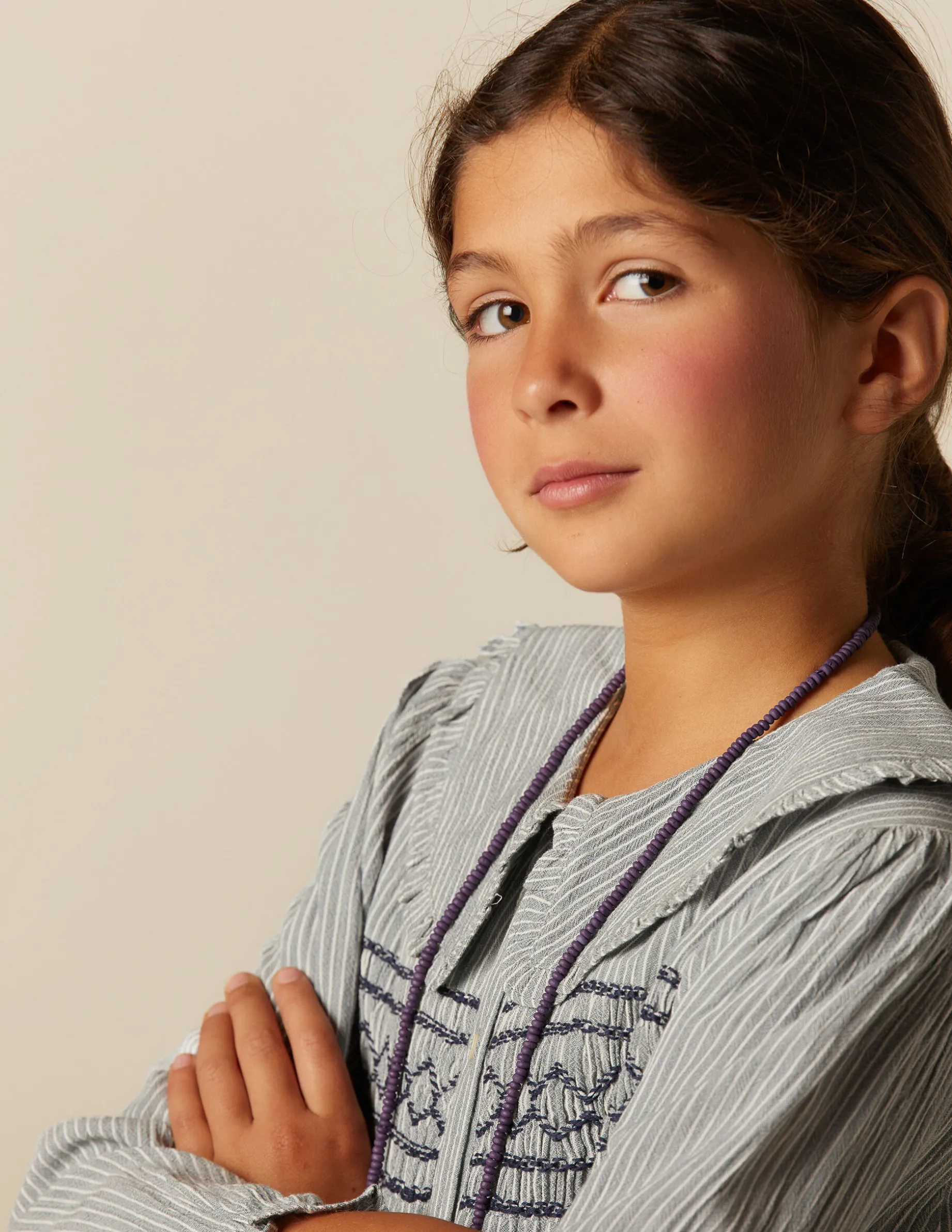 Camisa de teen en tejido de rallas de algodón. Patrón con cuello grande, manga larga y cierre delantero con botones. Detalle de nidos en la zona del peco.