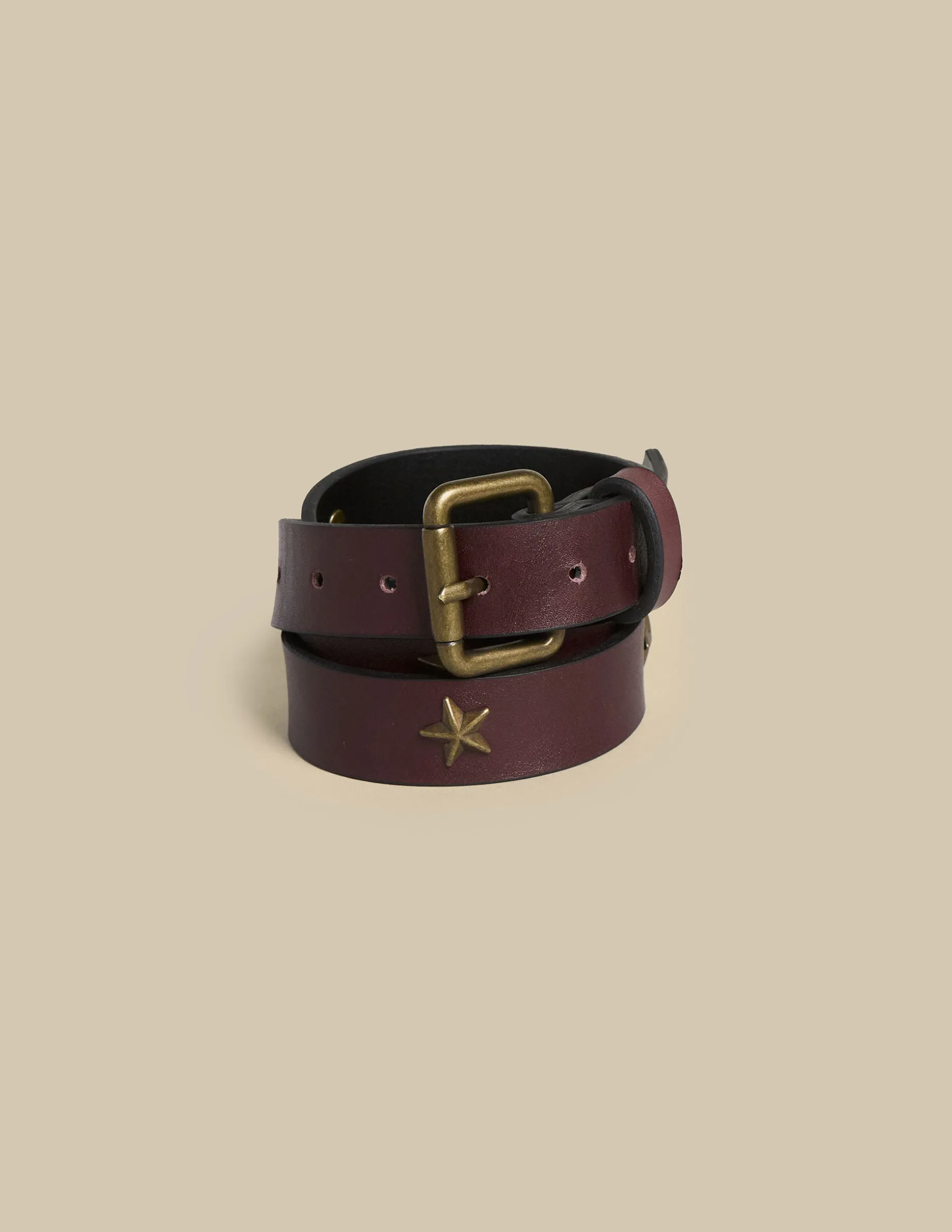 Cinturón de piel marrón con detalle de estrellas. Hebilla metálica dorada.