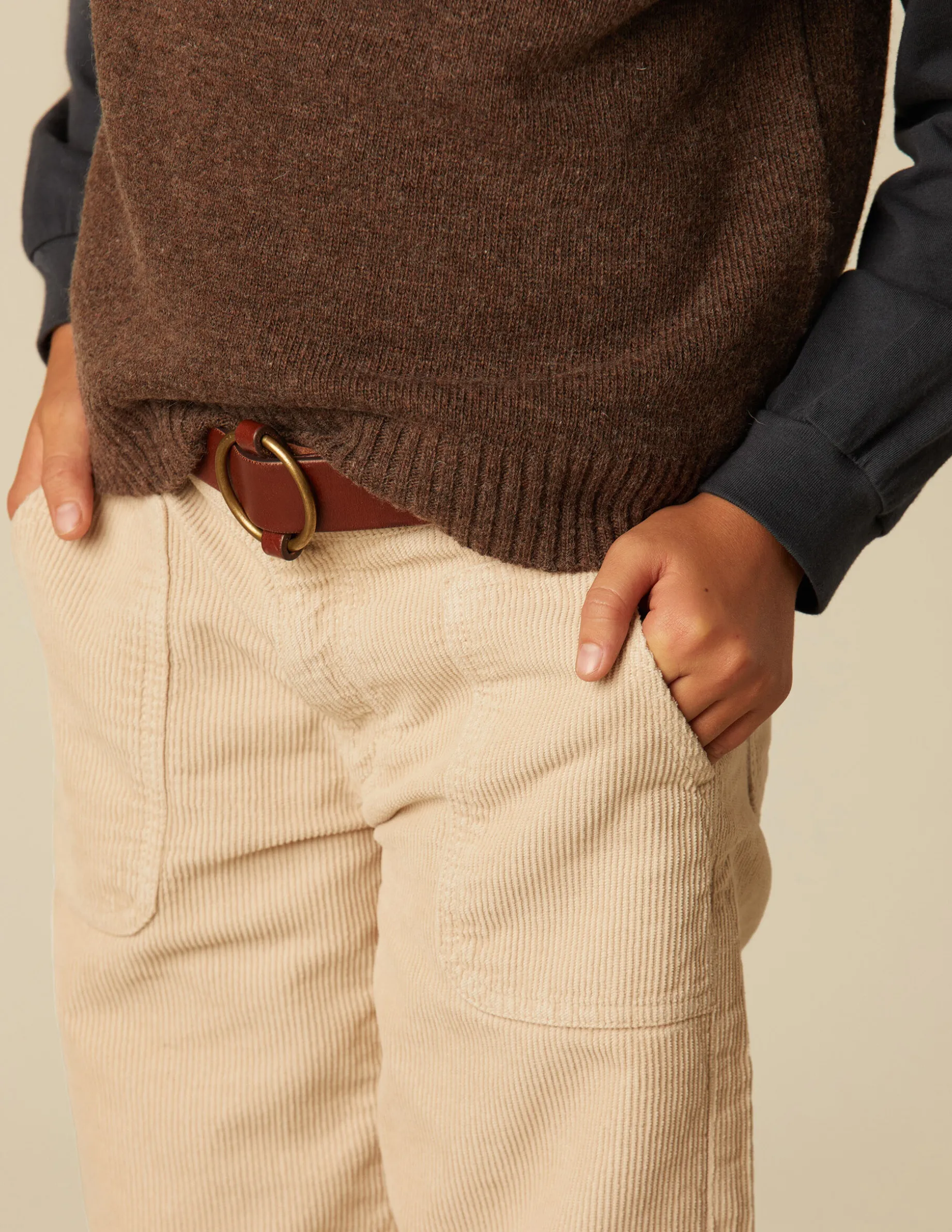Pantalón wide leg de pana arena con bolsillos. Cierre con botón metálico y cremallera.