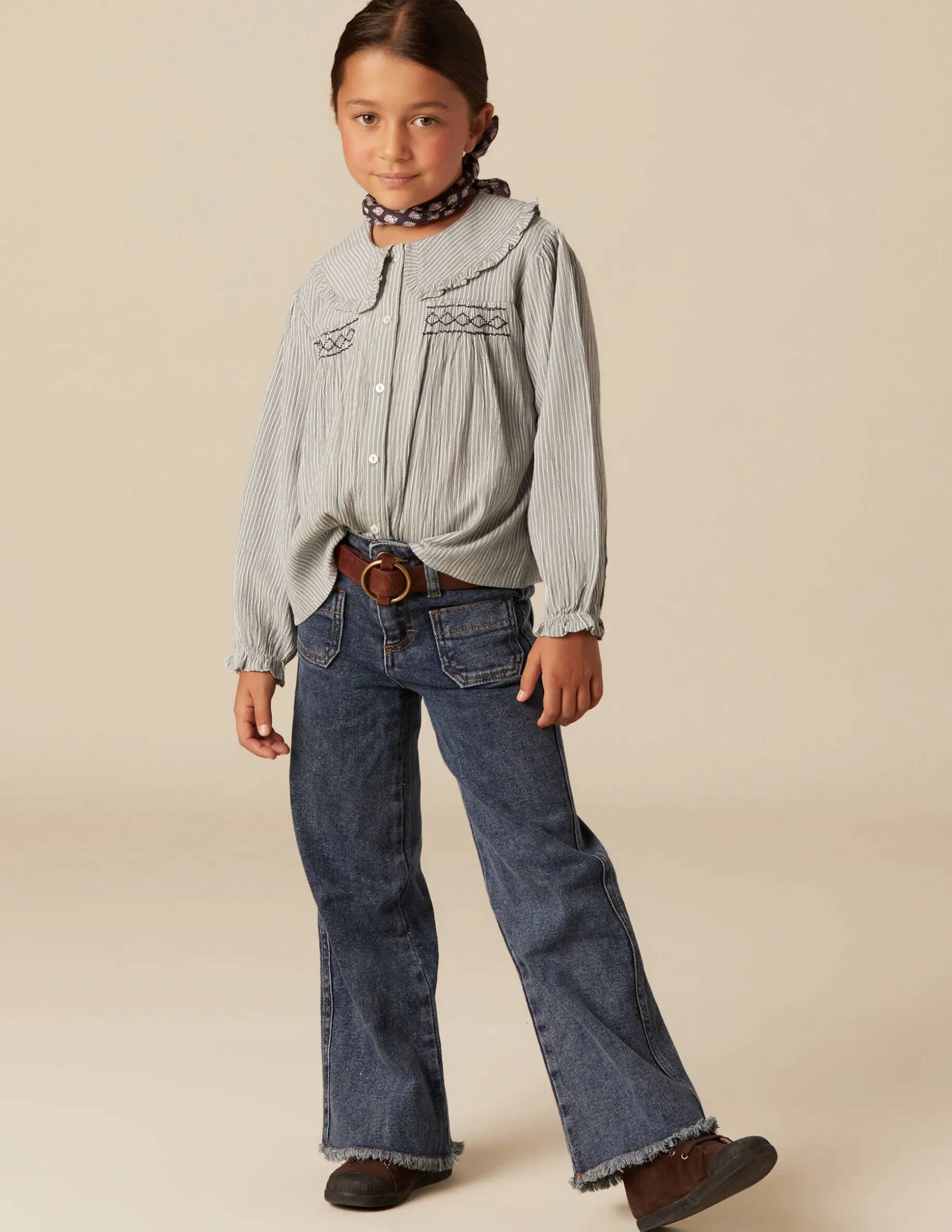 Camisa de niña en tejido de rallas de algodón. Patrón con cuello grande, manga larga y cierre delantero con botones. Detalle de nidos en la zona del peco.