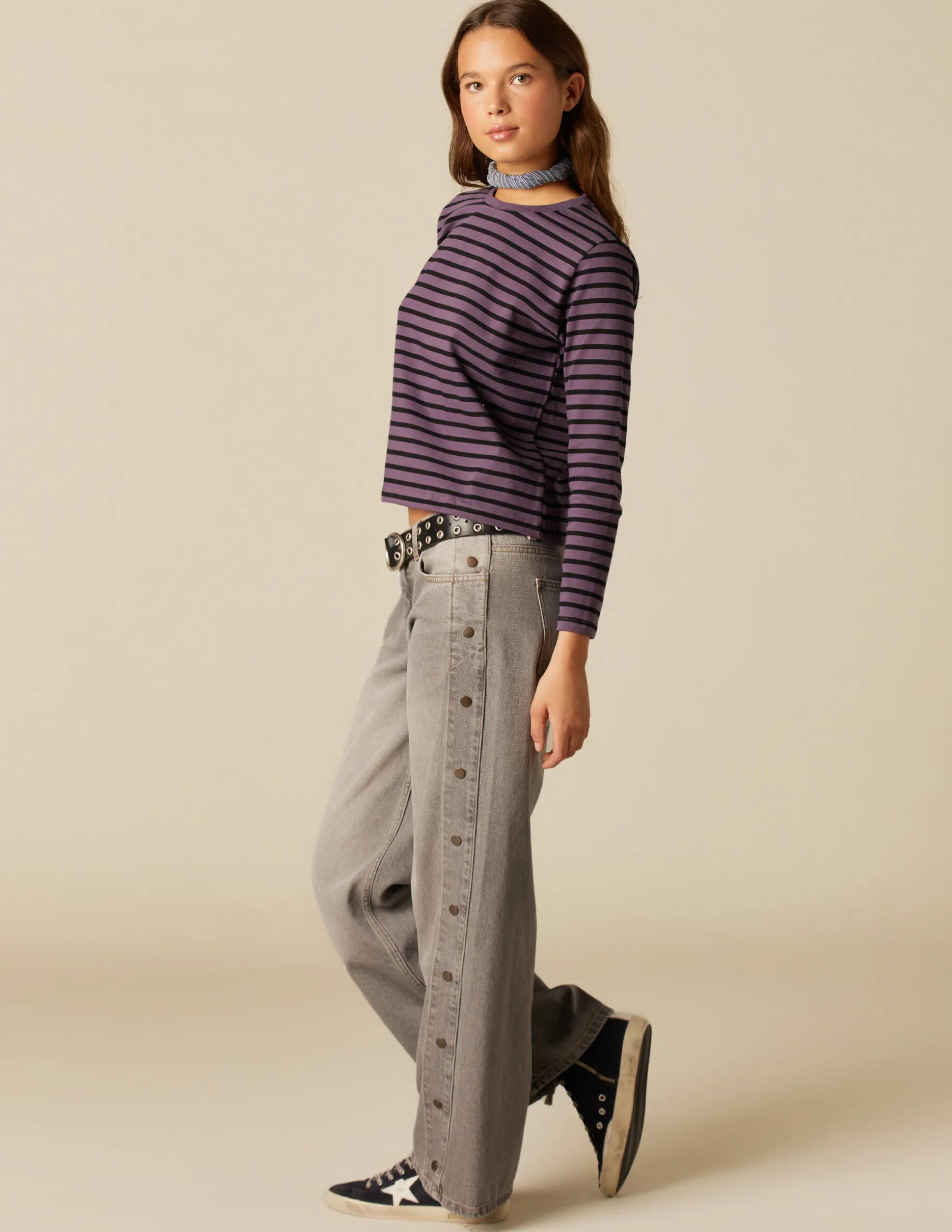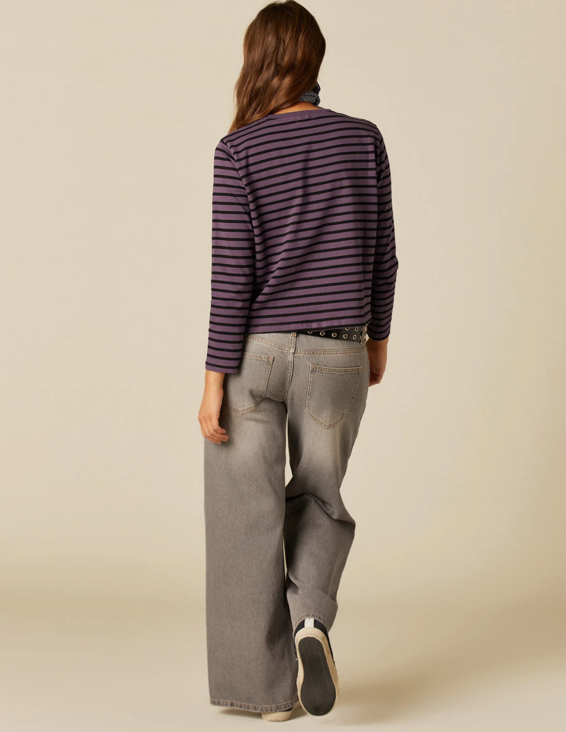 Camiseta de chica, en color de la colección con rayas grandes antracita. Patrón con cuello redondo y manga larga. Parte de los beneficios recibidos se destinan a la Fundación a la Par, con la que Nícoli colabora desde hace años.